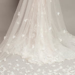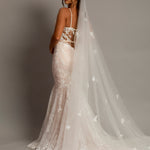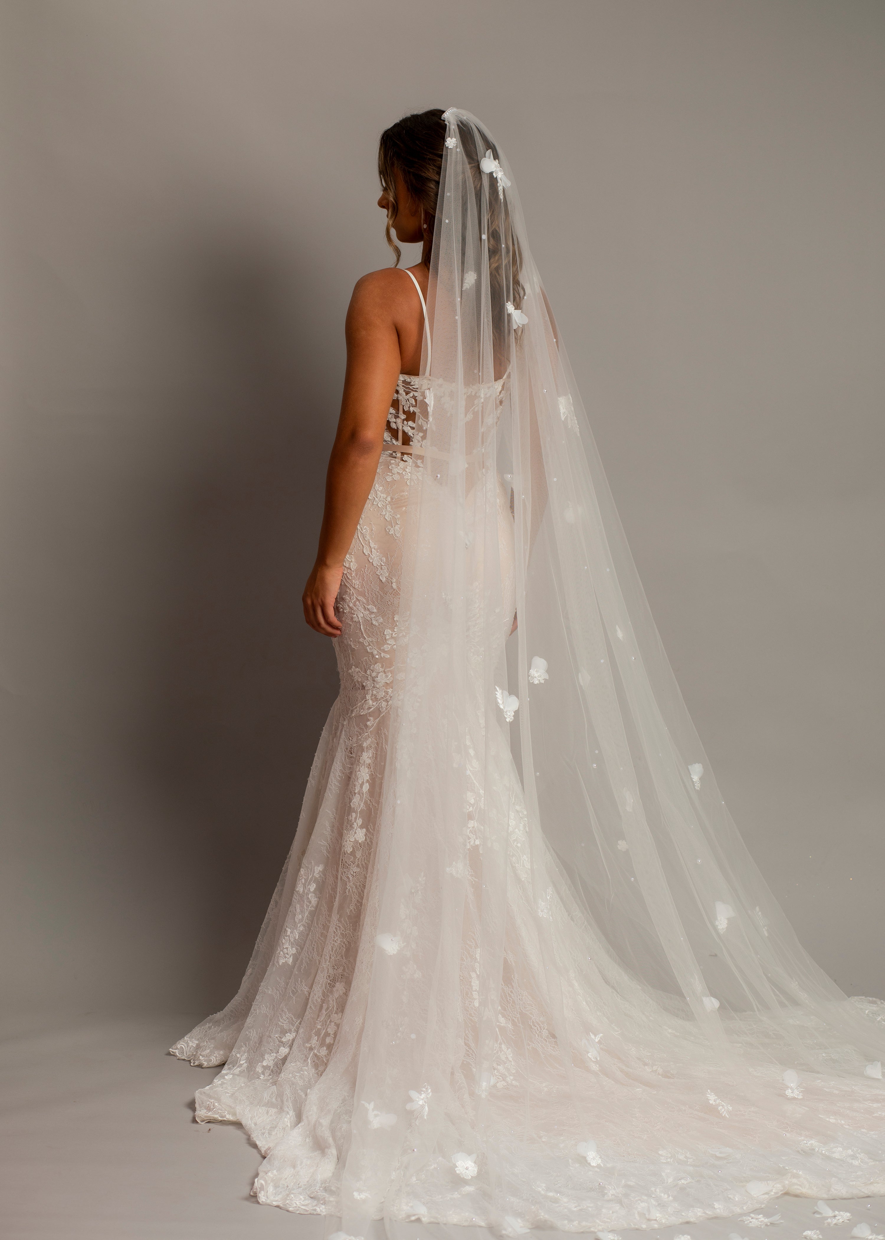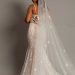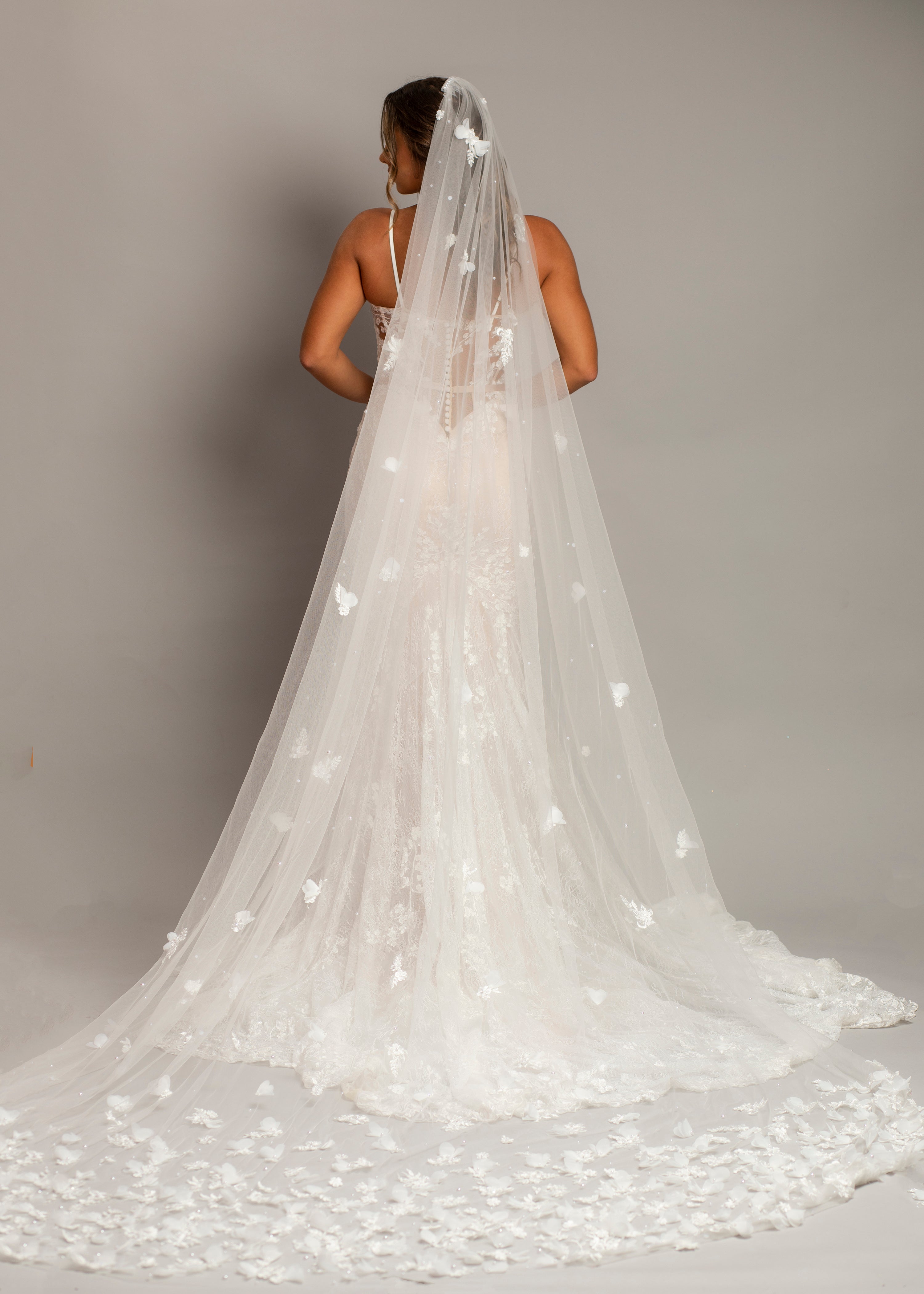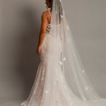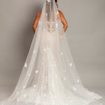 Introducing the Flora Bridal Veil, a stunning accessory designed to make your wedding day unforgettable. This exquisite veil features a luxurious long train that cascades gracefully to the floor, creating an elegant silhouette that enhances the beauty of your bridal gown. Adorned with delicate, handcrafted 3D flowers, the Flora veil adds depth and dimension, catching the light beautifully for a radiant glow. Made from the finest quality tulle, this veil is soft to the touch and drapes beautifully, ensuring comfort and ease of movement. Whether you're wearing a classic updo or letting your hair flow freely, the Flora veil's versatile styling complements any bridal look. Equipped with a discrete comb for a secure fit, it gives you peace of mind as you celebrate your special day. Perfect for brides seeking a touch of fairytale charm, the Flora Bridal Veil is ideal for grand ceremonies and creates stunning, memorable wedding photos. To keep it looking its best, store it in a cool, dry place away from direct sunlight and gently steam to remove any wrinkles. Embrace the elegance and charm of the Flora Bridal Veil, where every bride's dream becomes a reality.