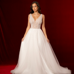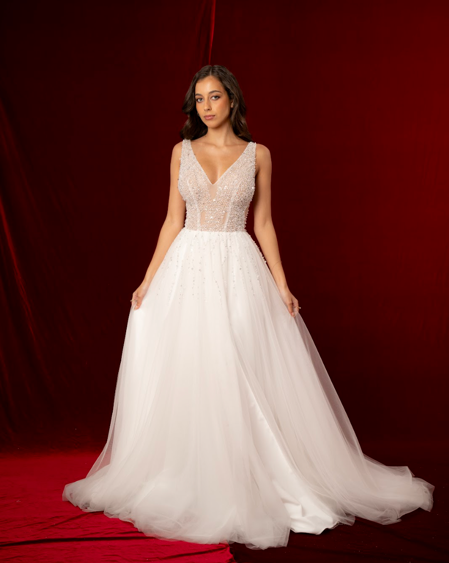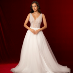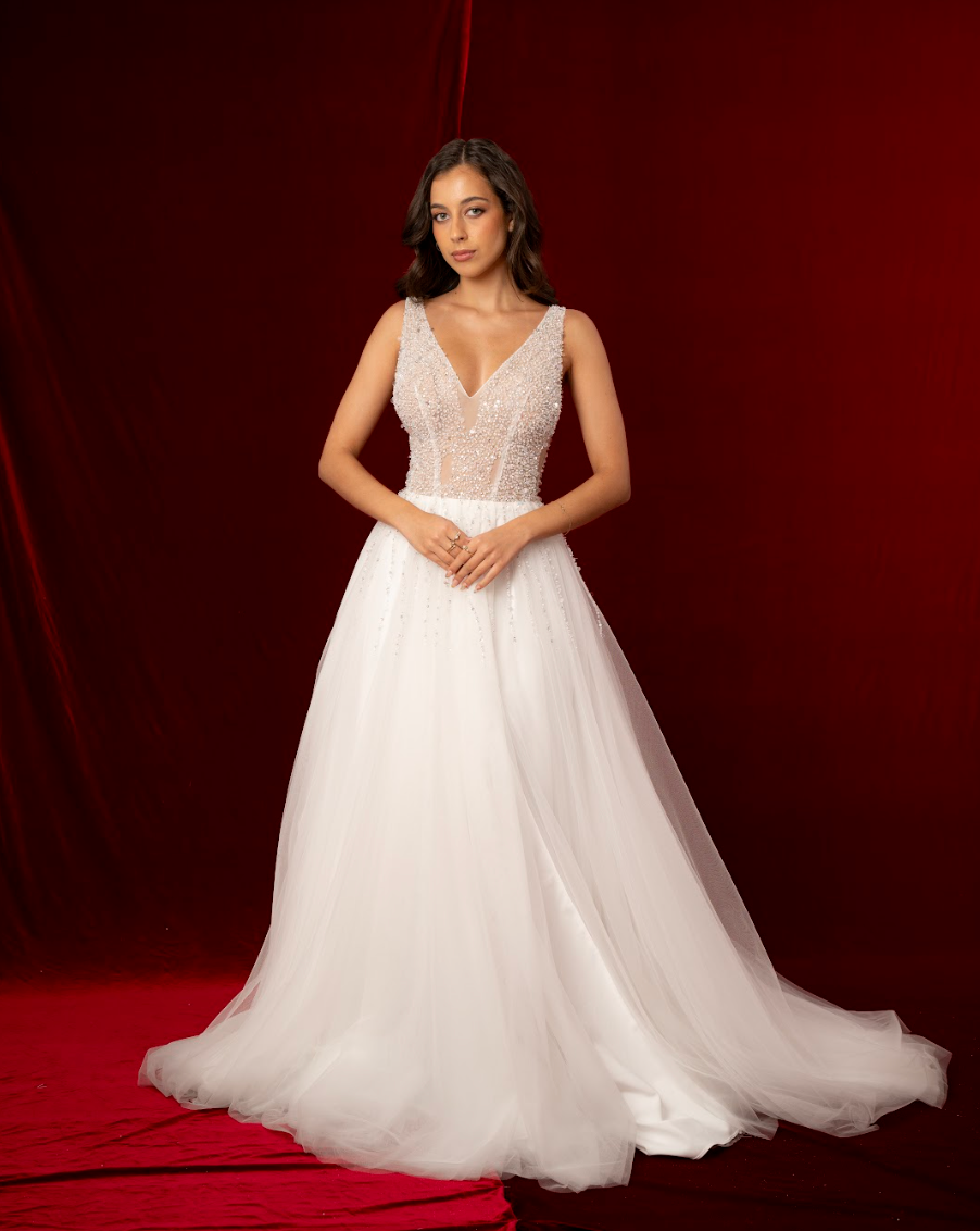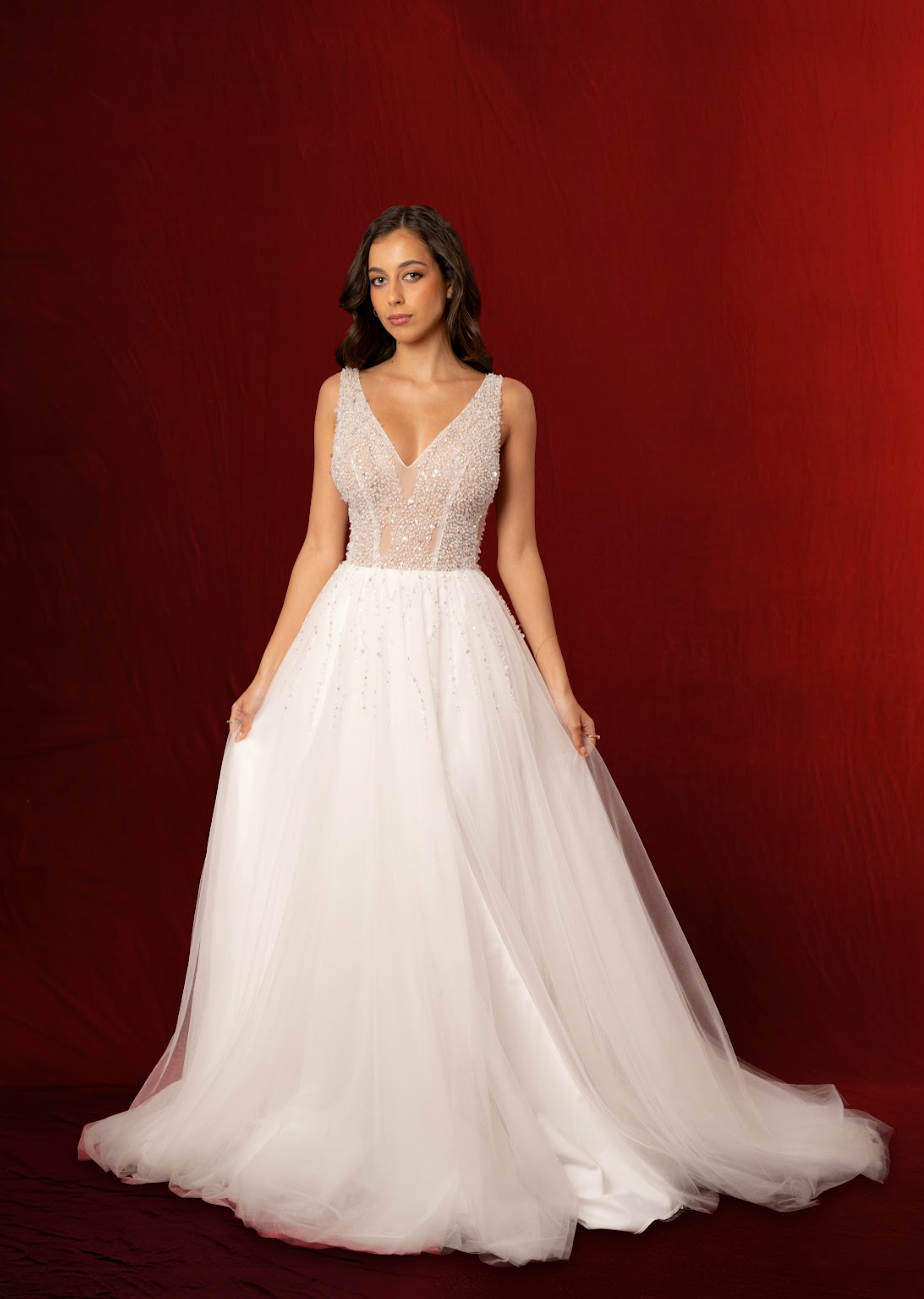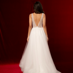 The Winona gown is a timeless A-line wedding dress designed to embody softness, elegance, and modern romance. Its fitted bodice is adorned with intricate, delicate beading that shimmers subtly under the light, gradually cascading downward and blending seamlessly into the airy skirt. The illusion V-neckline adds a graceful touch, enhancing the décolletage while maintaining an effortlessly refined aesthetic. Wide straps provide both comfort and structure, complementing the dramatic open V-back that creates a striking yet sophisticated statement. A concealed zip closure ensures a smooth, flawless finish along the back.