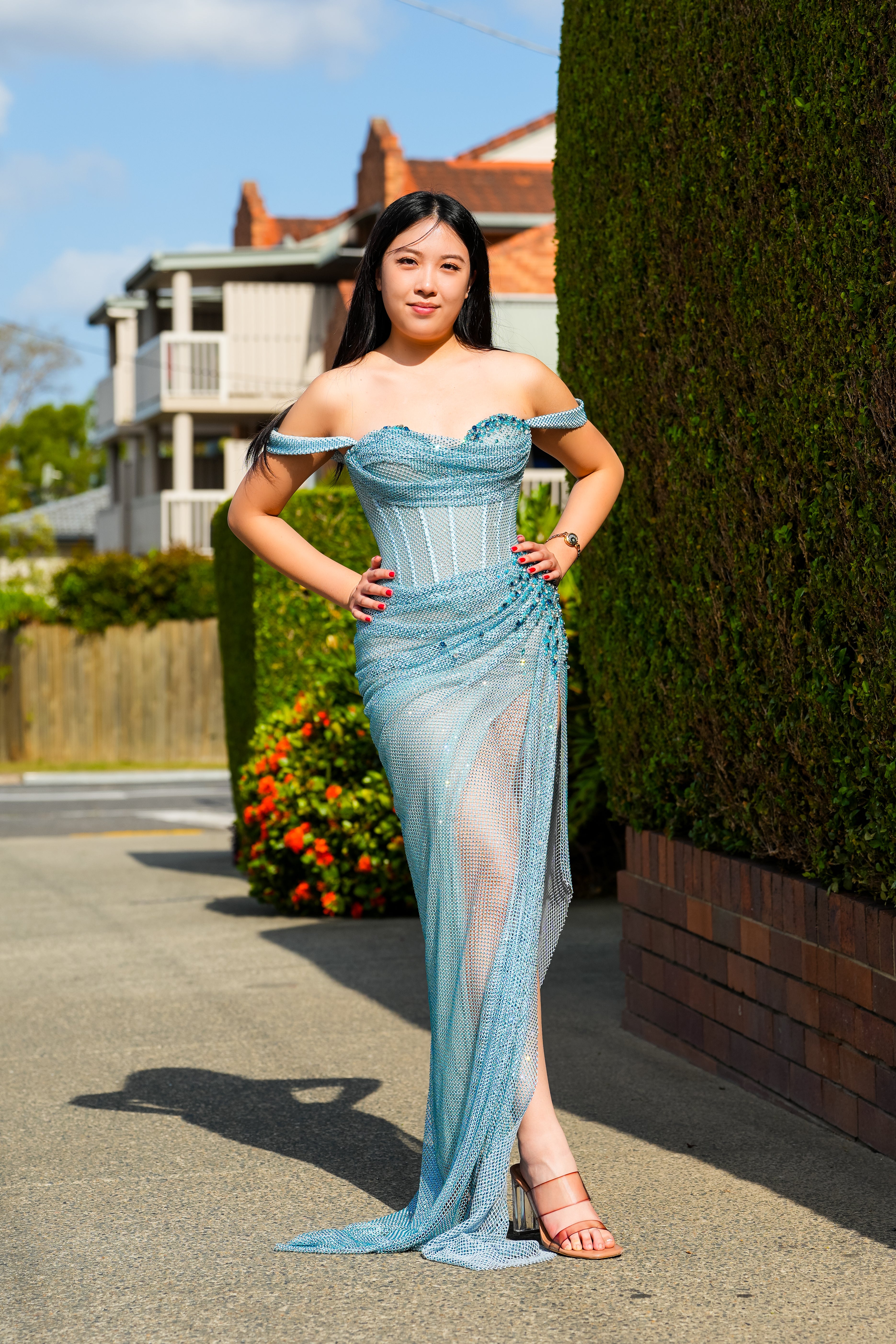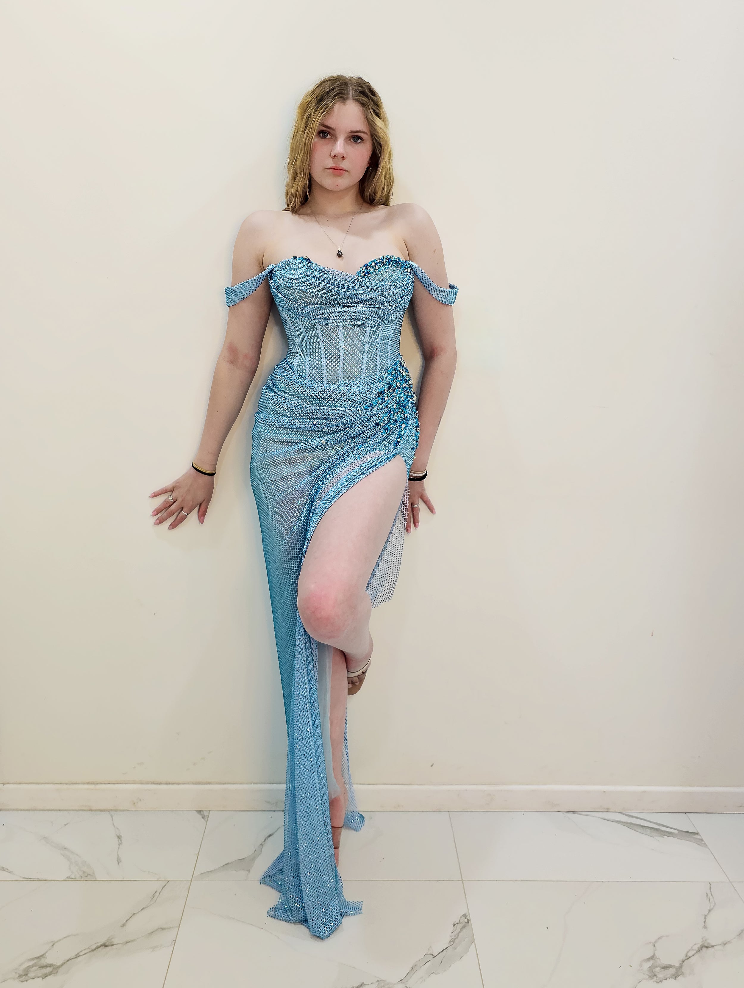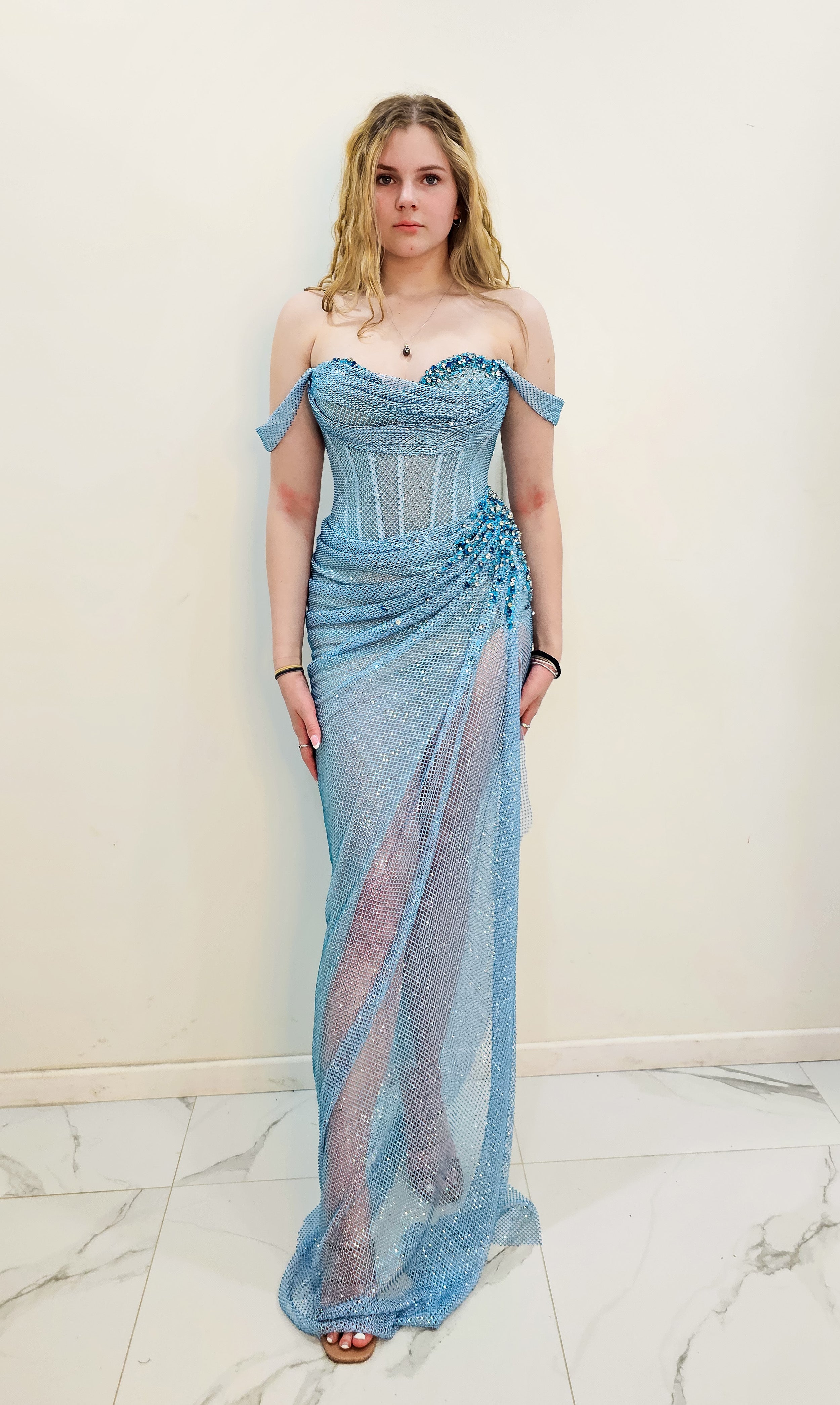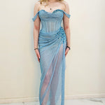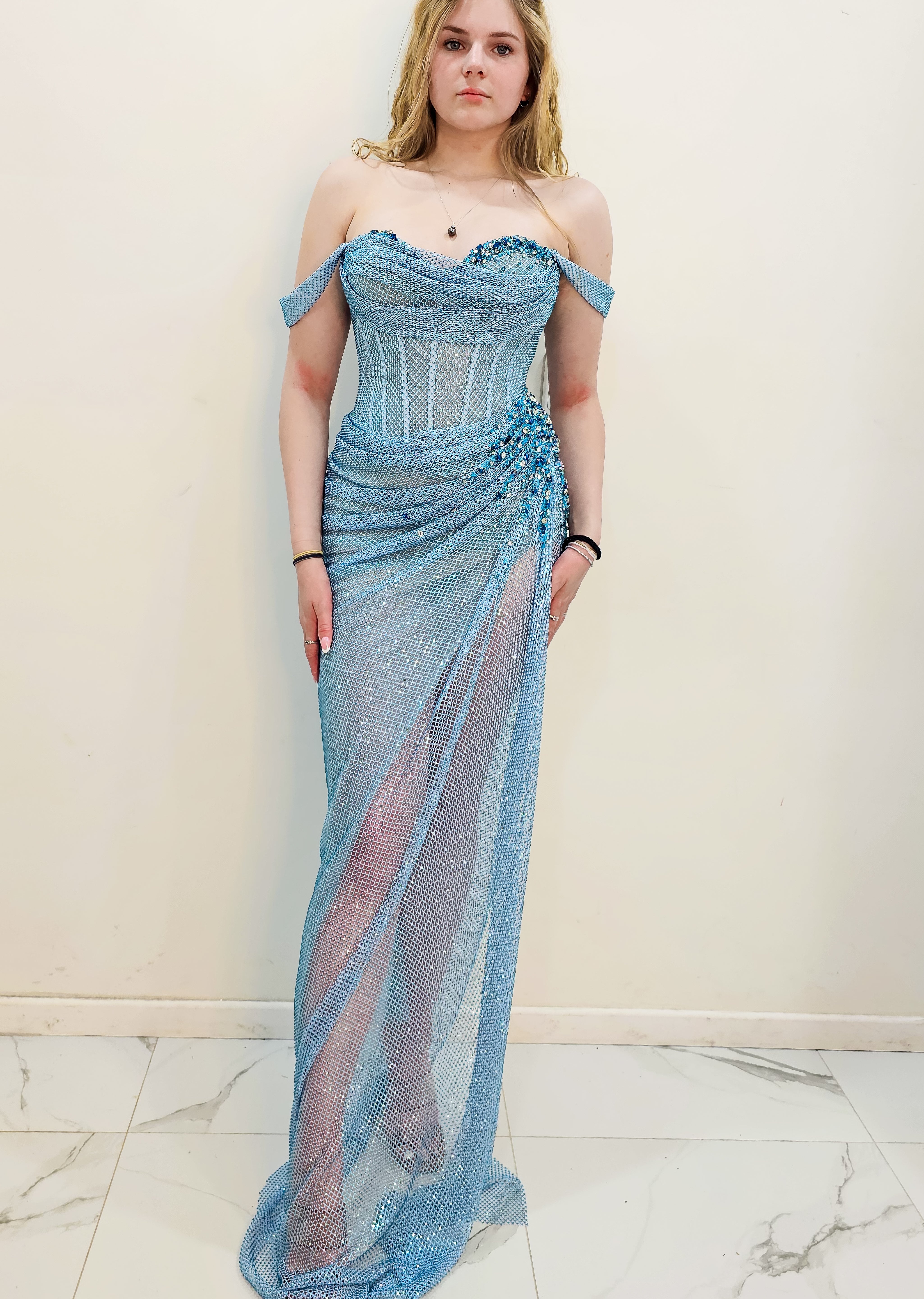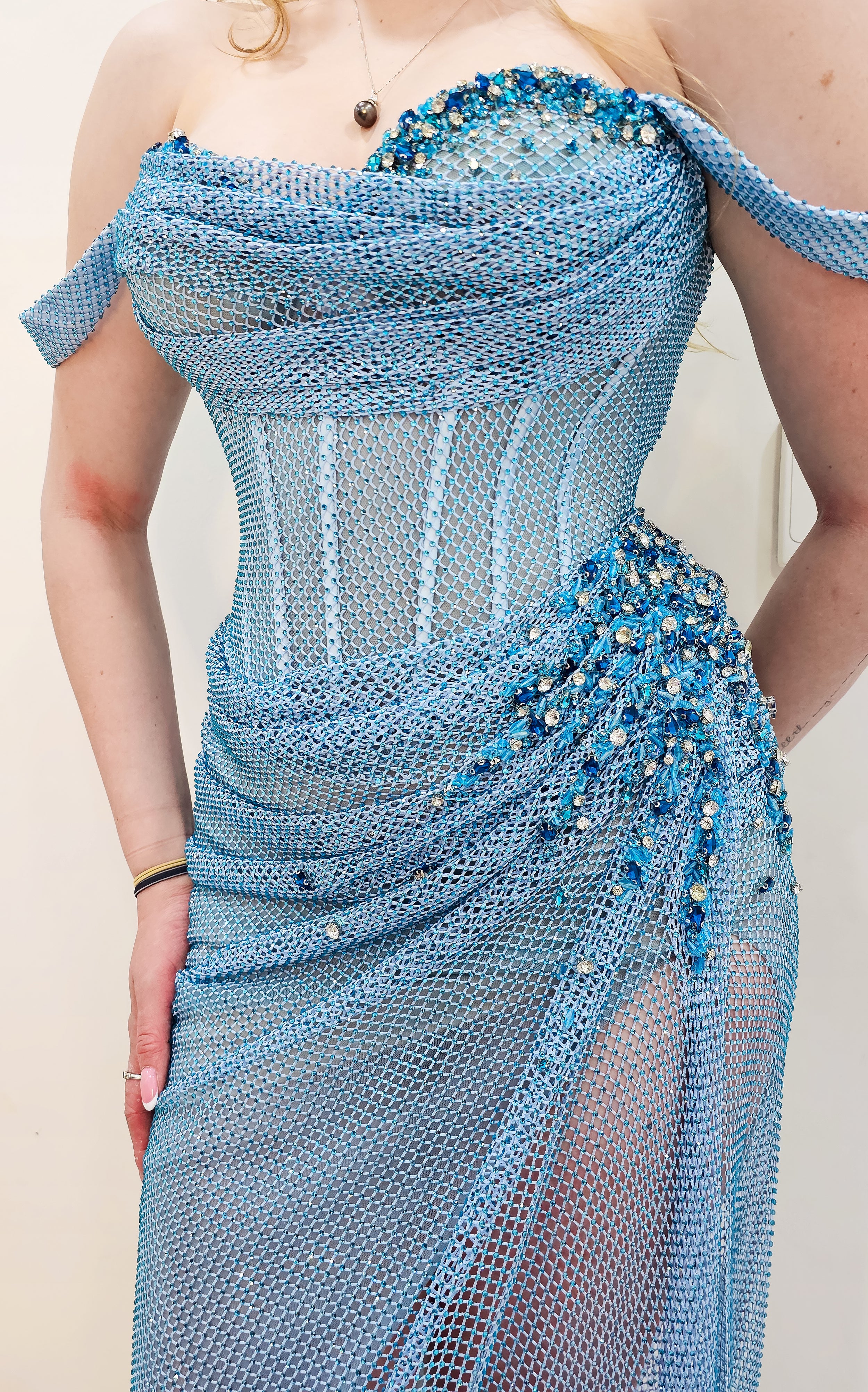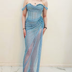 Thousands of hand-applied baby blue rhinestones are meticulously placed across the gown, turning Anthea into a true work of wearable art. The off-shoulder design adds a romantic, feminine touch, framing the collarbones and shoulders beautifully while offering a secure and flattering fit.