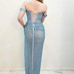 • Anthea dress in baby blue, draped in shimmering crystal mesh – a true work of art