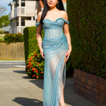 Make an unforgettable entrance with Anthea, a breathtaking masterpiece designed for elegance and allure. This show-stopping mermaid gown features a base of soft baby blue fabric layered with shimmering baby blue crystal mesh, creating a luminous, multidimensional effect that catches the light with every move.