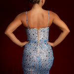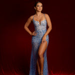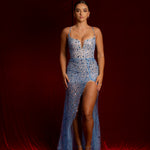 blue sparkling dress with bustier top and high slit