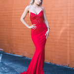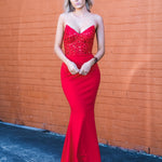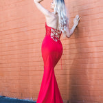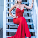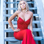 Red beaded lace V neck mermaid dress