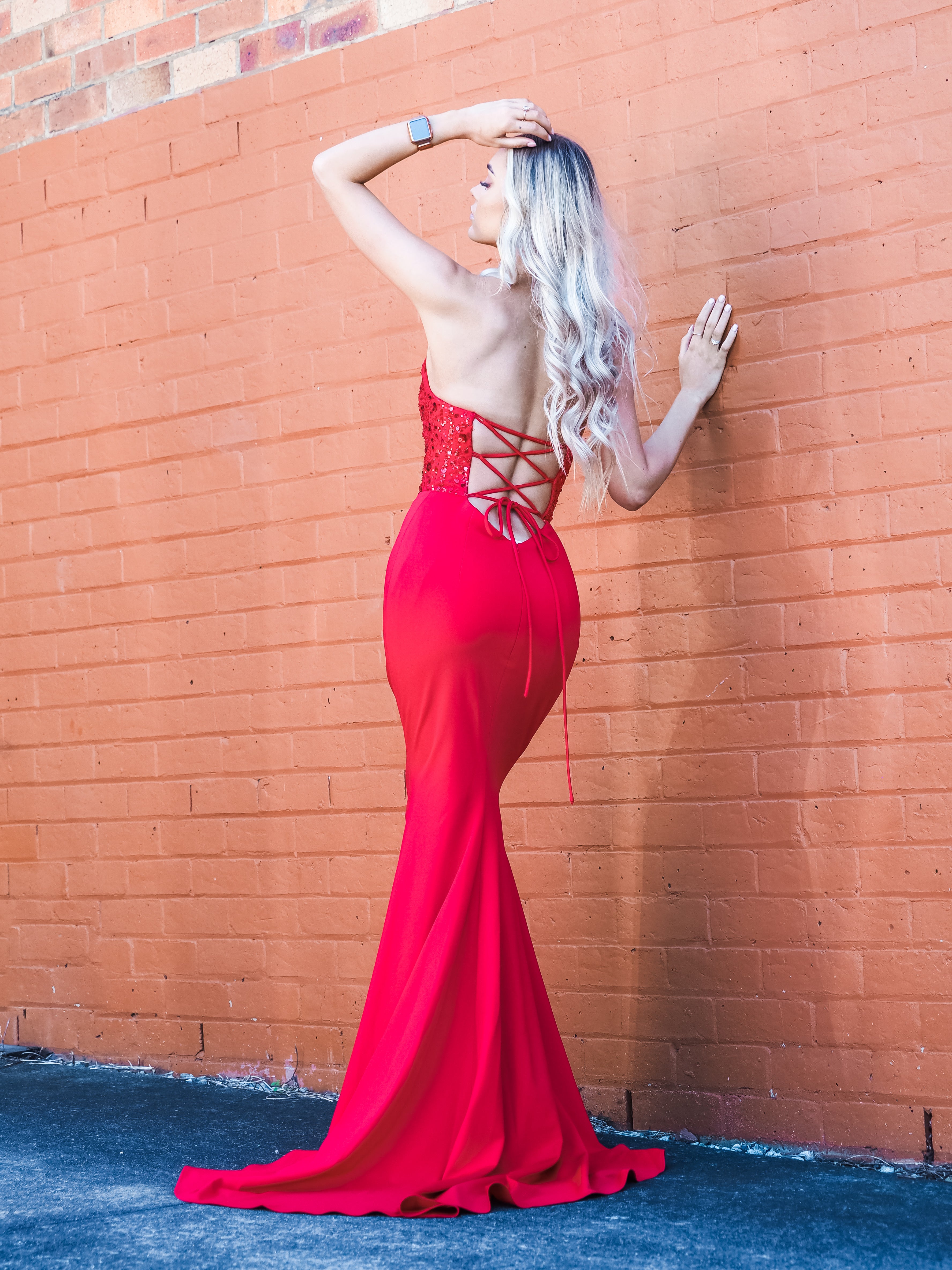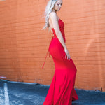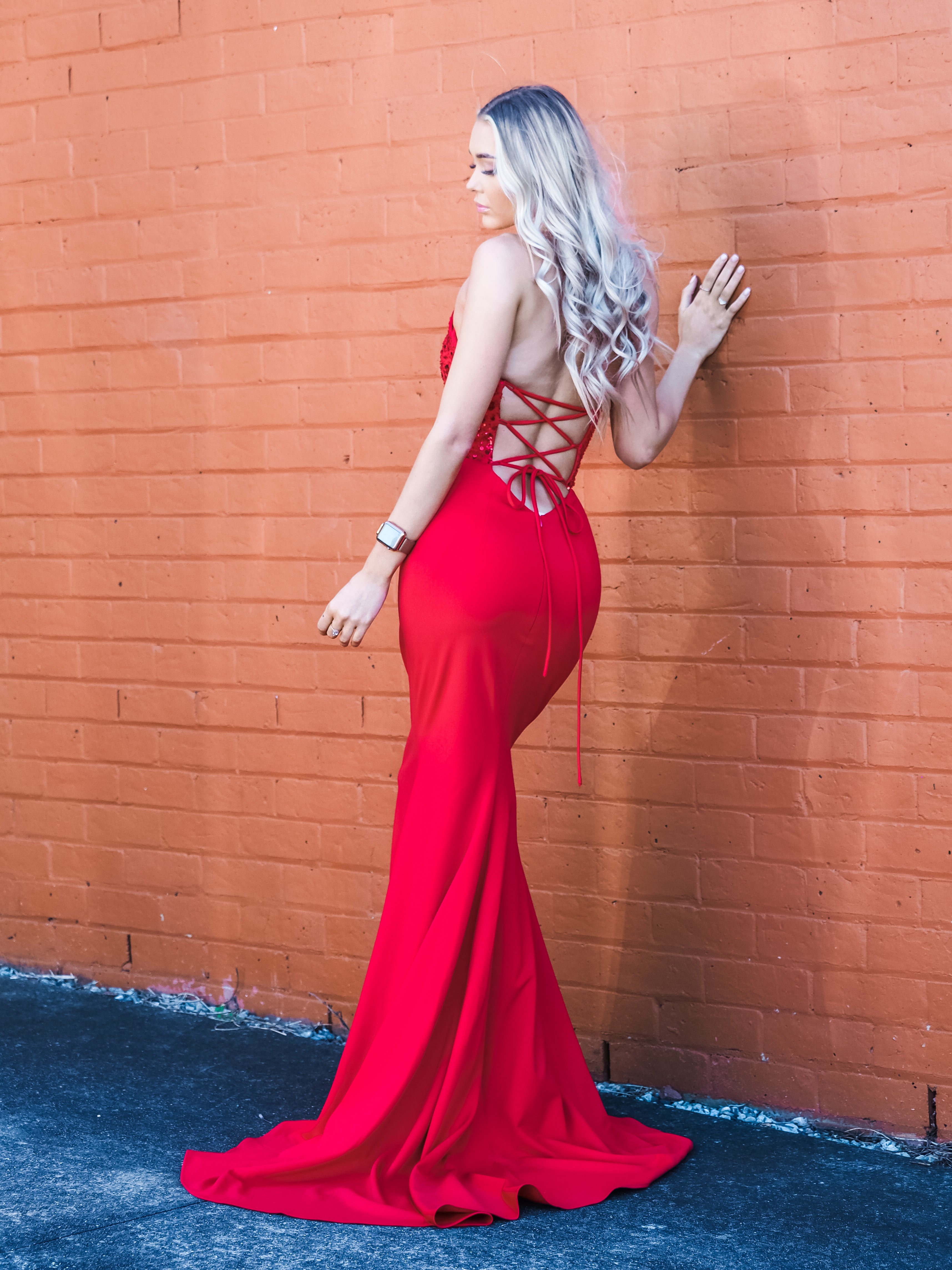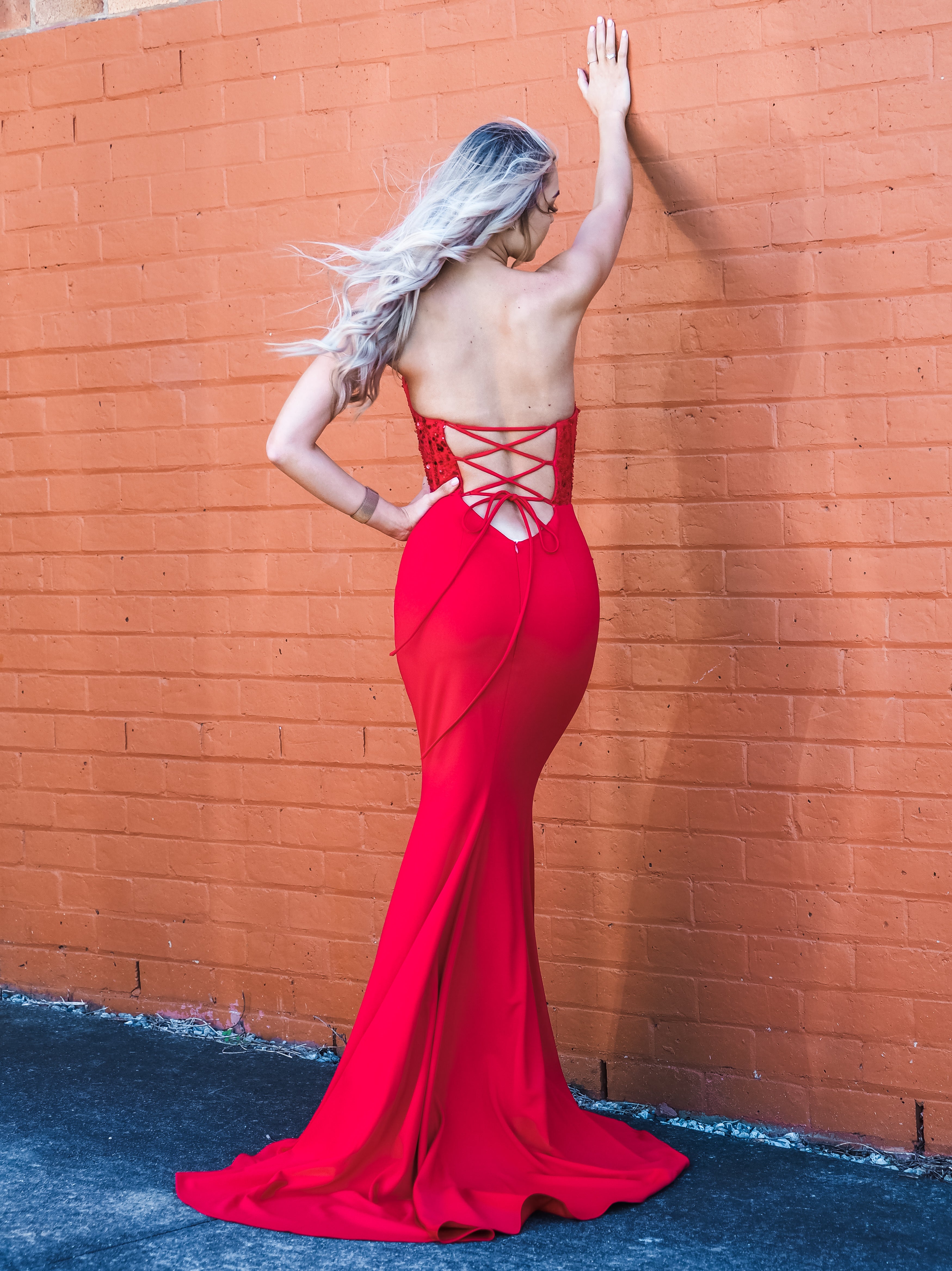 - Criss-cross strap on open back and zip up the skirt to fit a few more sizes