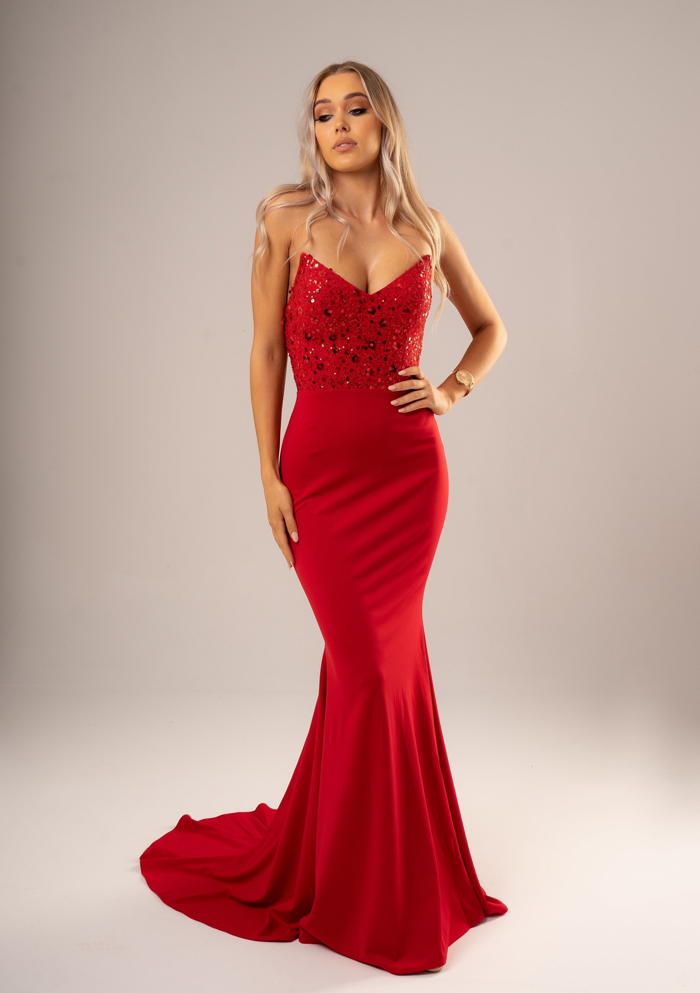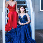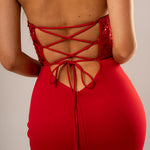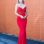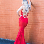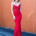 Red beaded lace V neck mermaid dress
