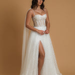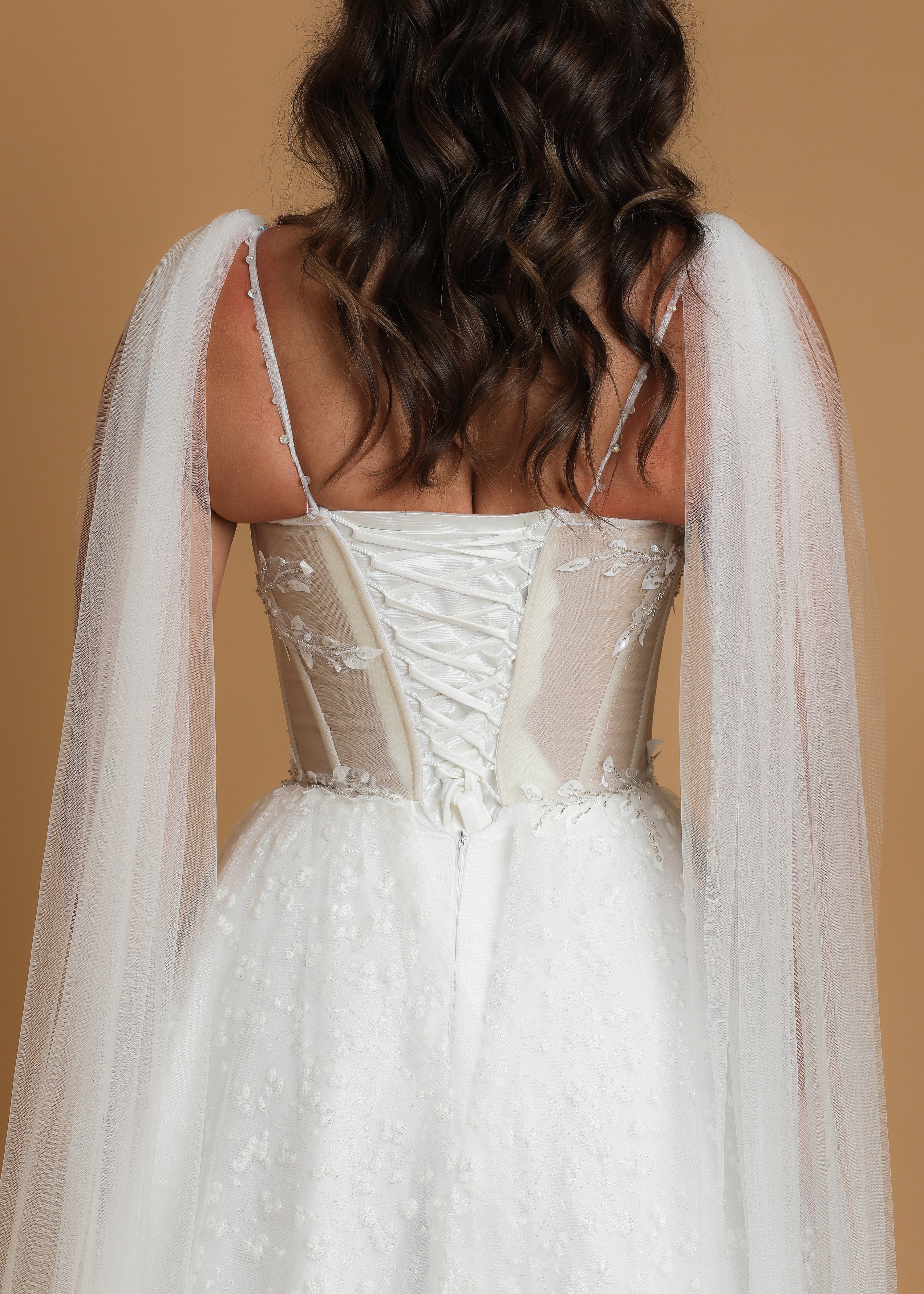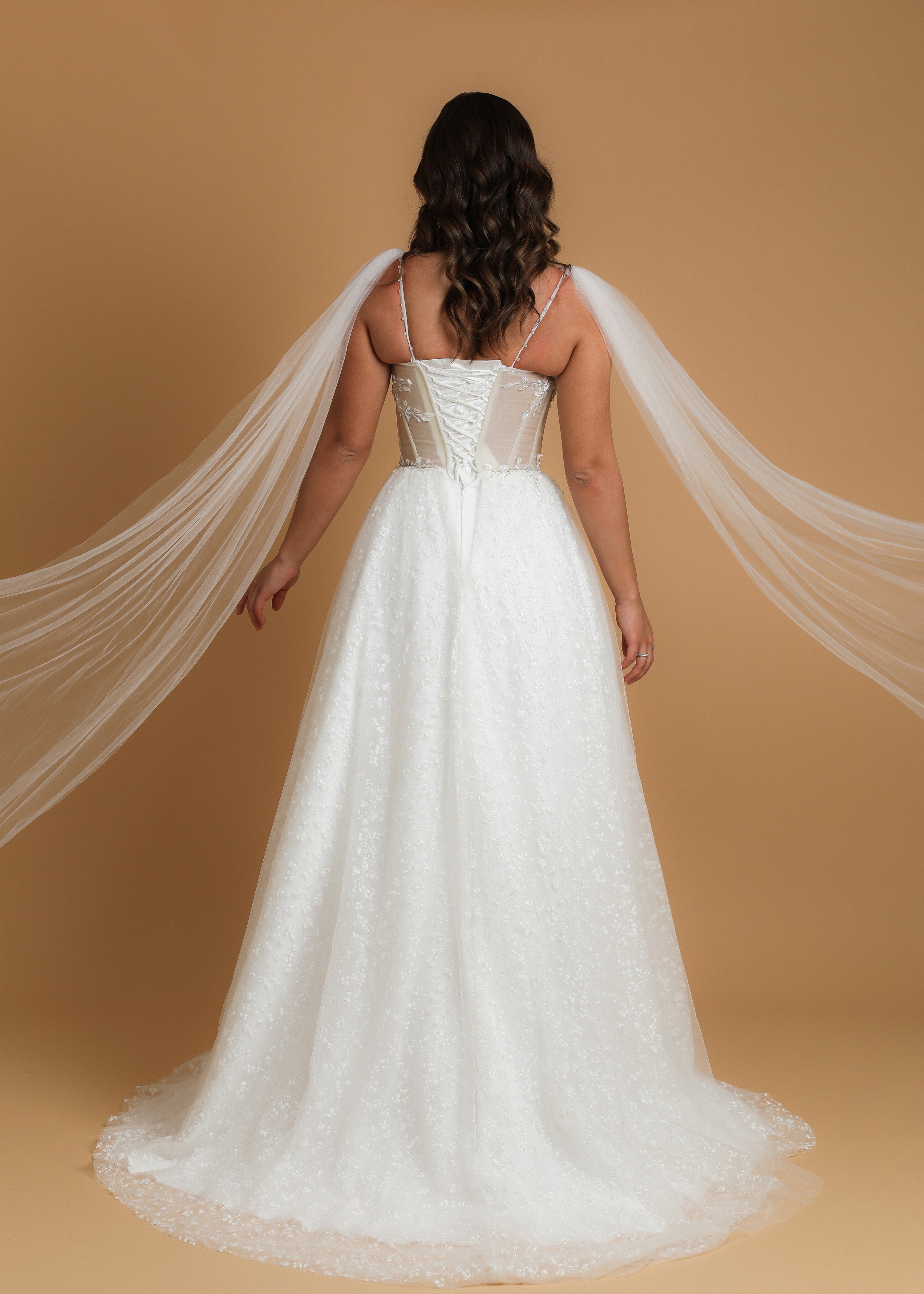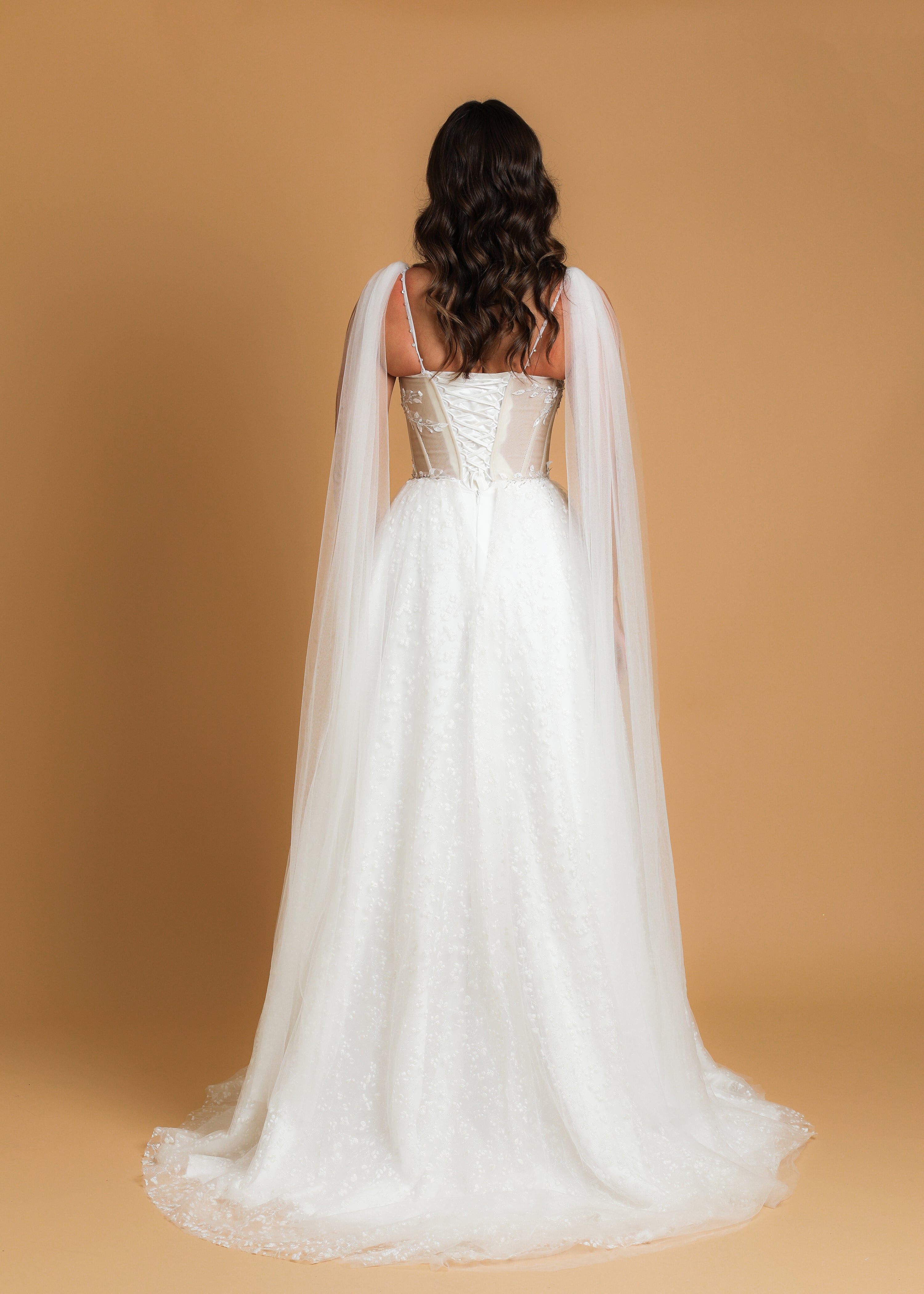 - **Cape:** Tulle off-the-shoulder cape for a sophisticated touch