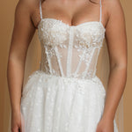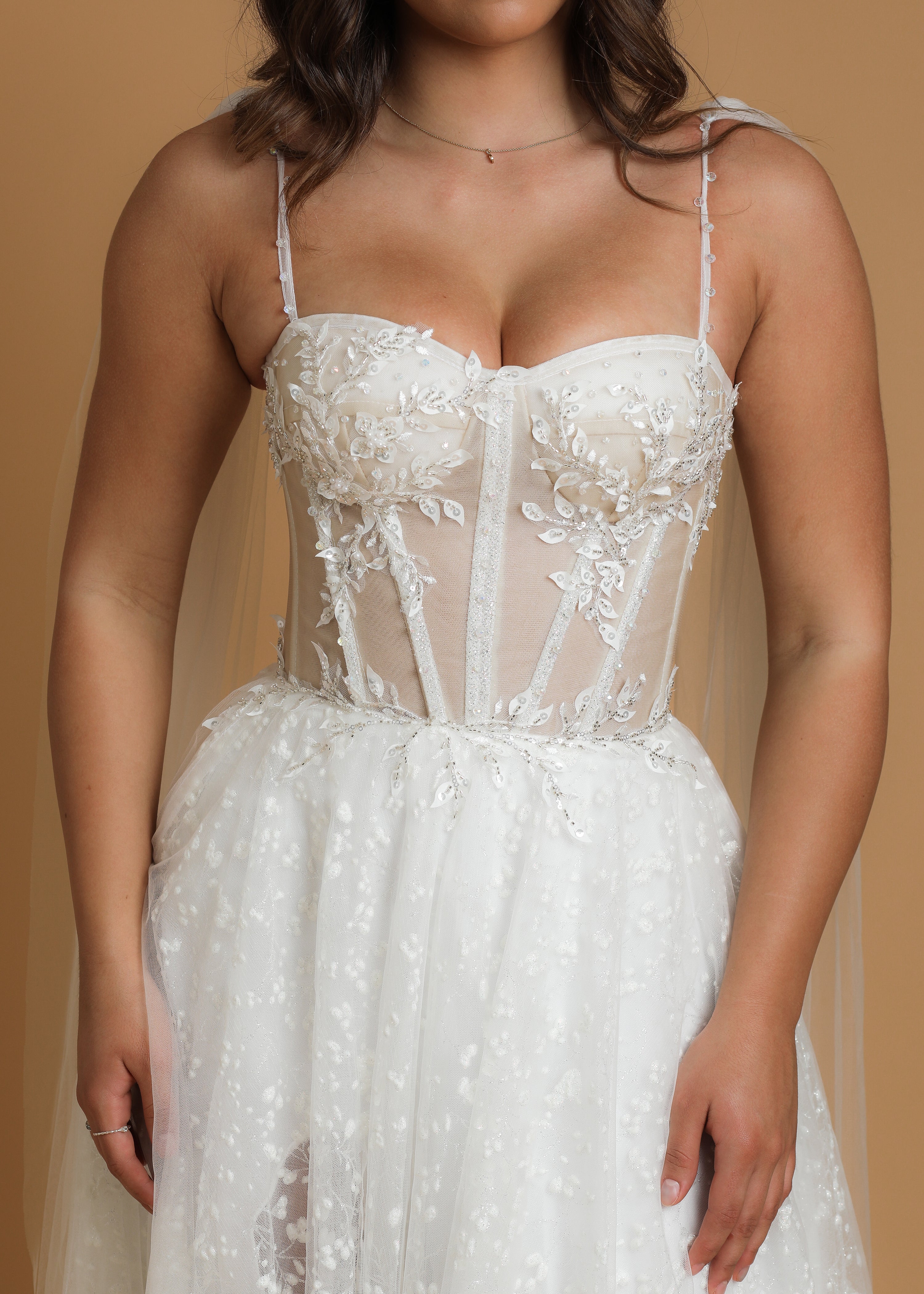 Introducing the stunning "Tyra" wedding dress, where elegance meets enchanting detail. This exquisite gown features a sheer corset bustier with a romantic sweetheart neckline adorned with intricate 3D vine details, creating a captivating silhouette. The lace-up back with a hidden zipper ensures a perfect fit while adding a touch of allure.