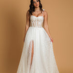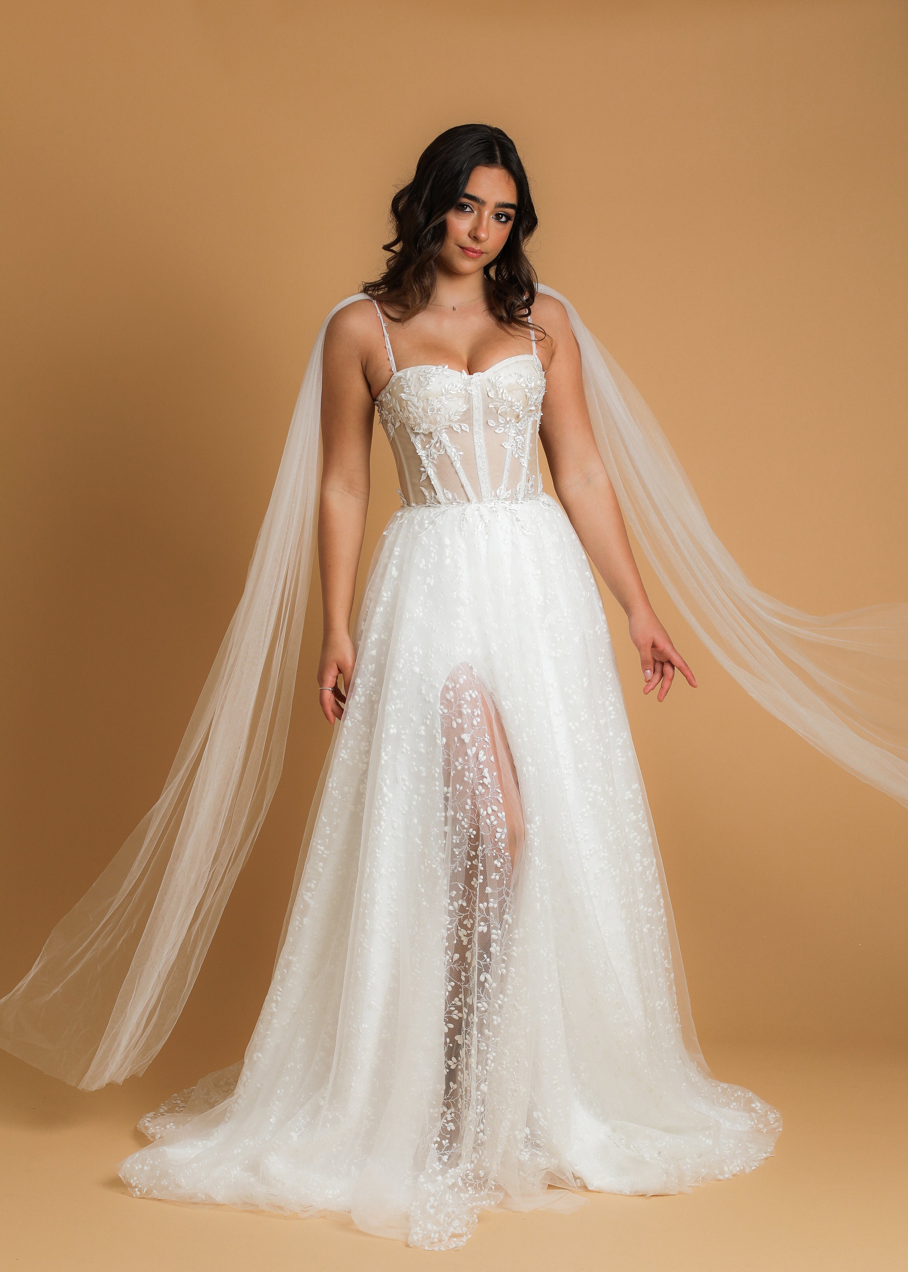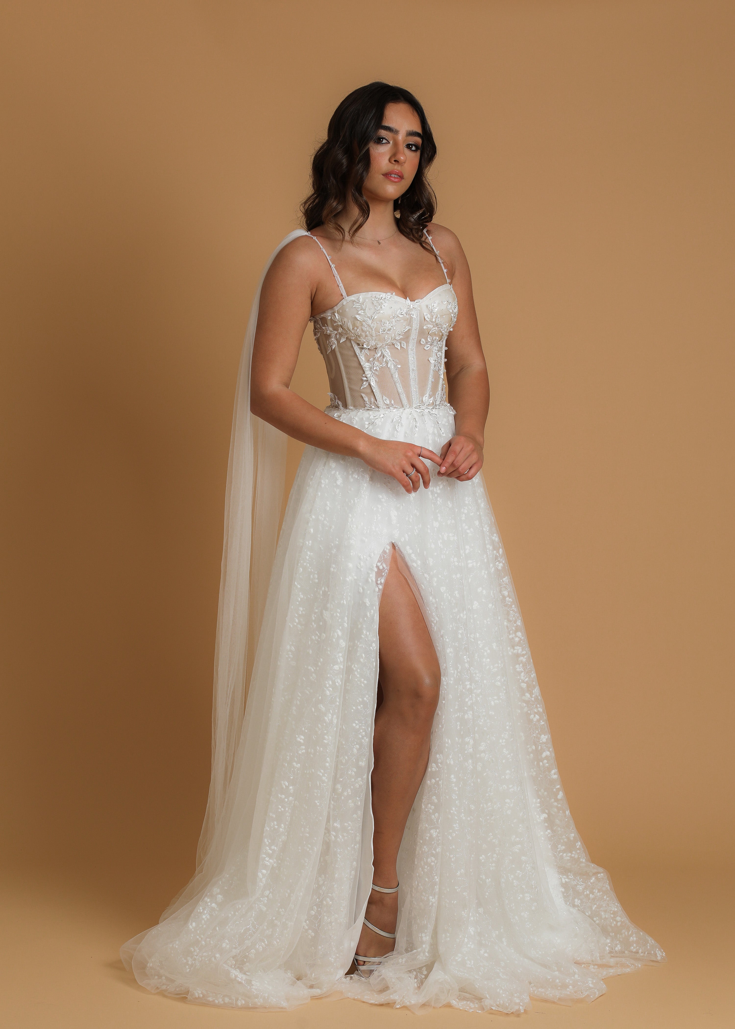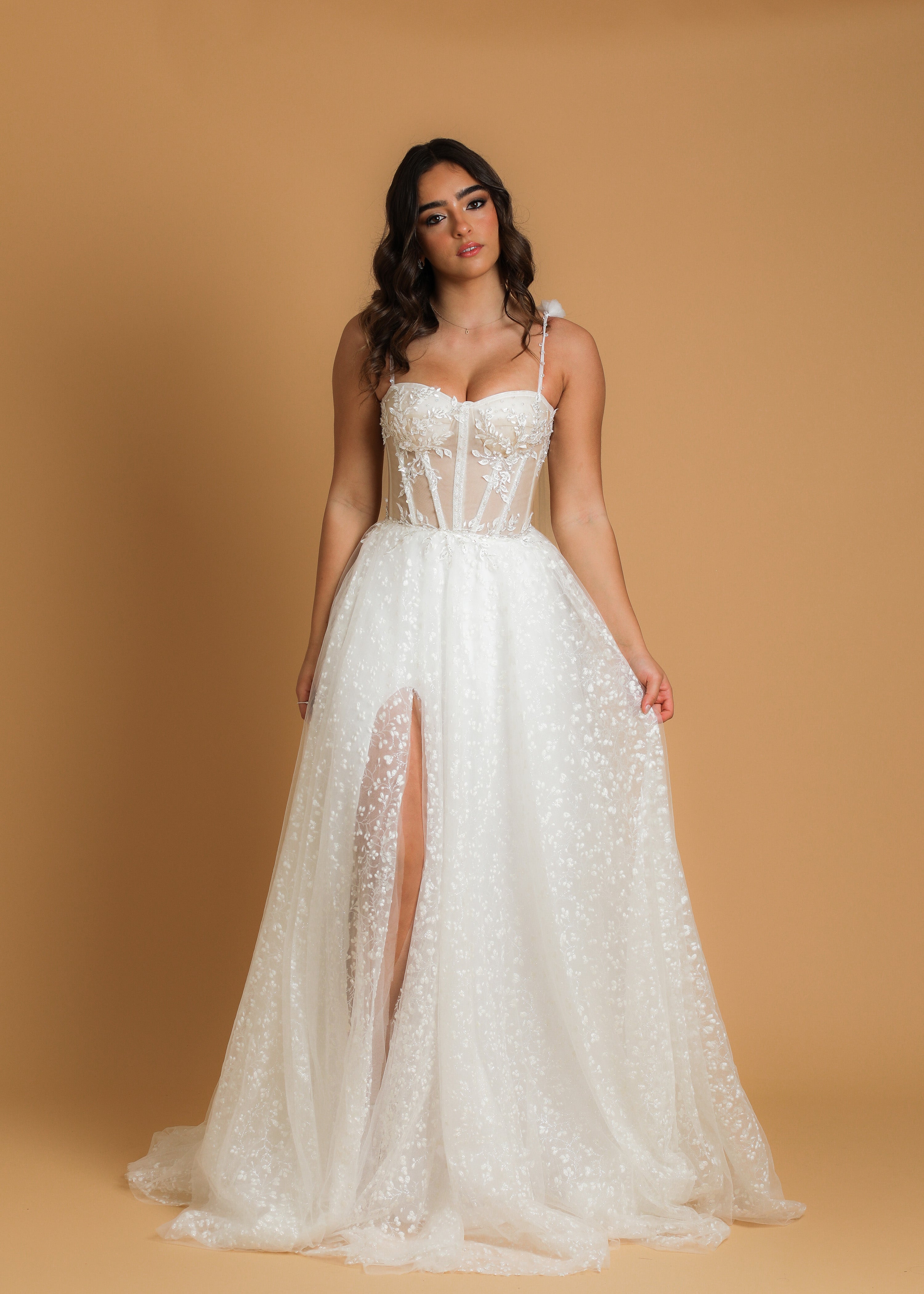 With a subtle hint of glitter throughout, the "Tyra" dress sparkles with every step, making you feel like royalty. This gown is perfect for the bride who dreams of a fairytale wedding, combining timeless beauty with contemporary flair. Step into your happily ever after in the "Tyra."