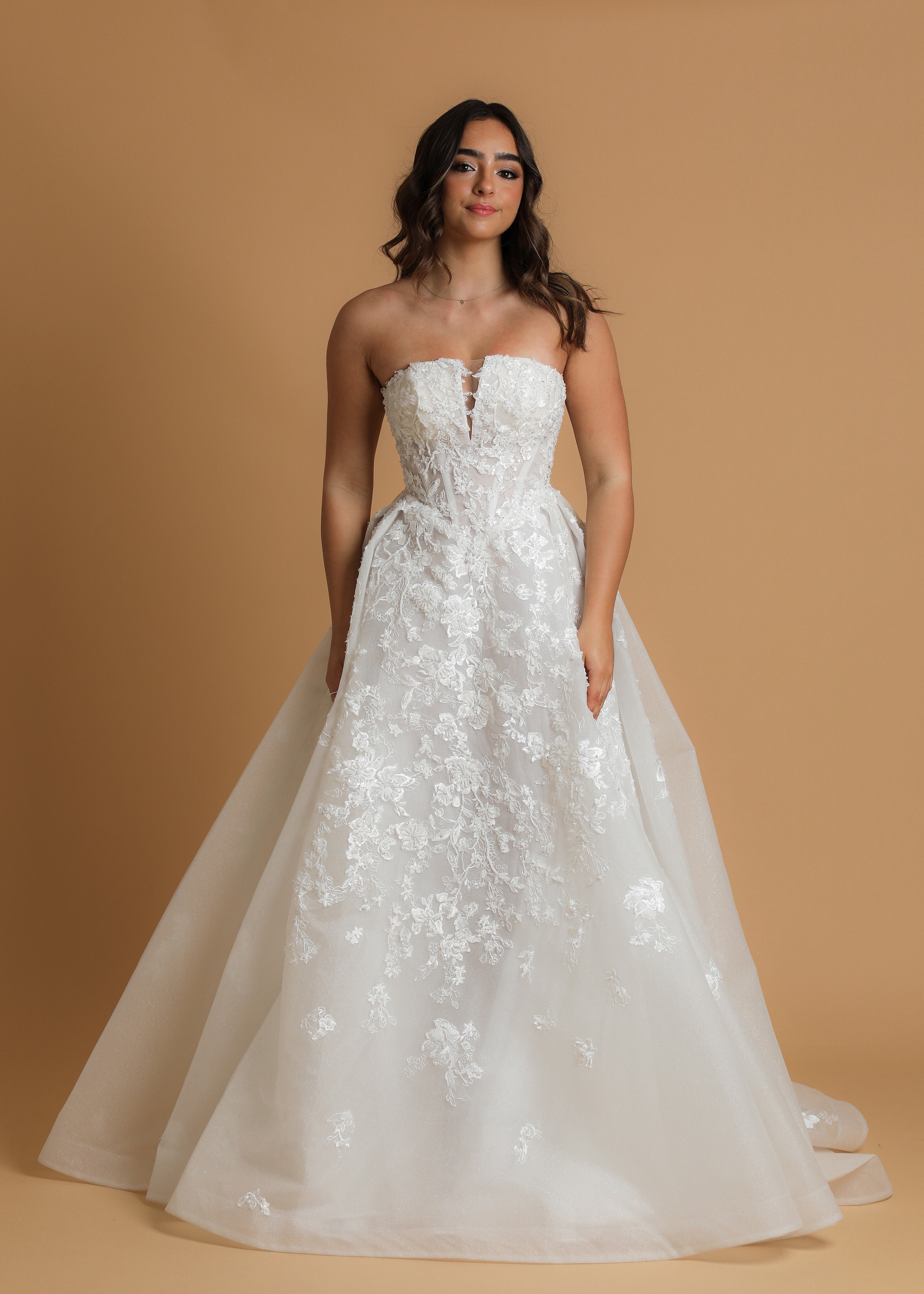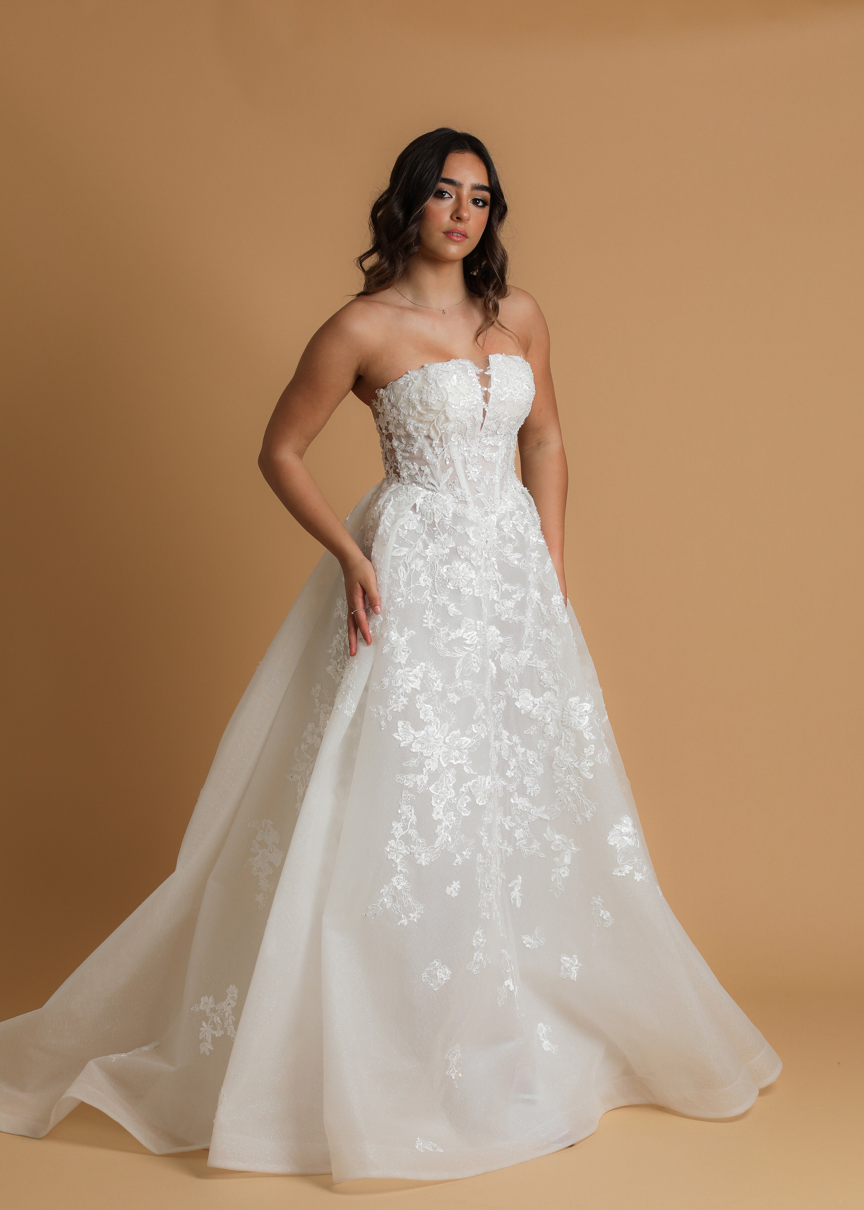Flowing from the bodice is a breathtaking princess skirt, embellished with sparkling glitter and delicate flower lace accents that create a whimsical, enchanting effect. The "Khloe" dress is ideal for the modern bride who desires a gown that radiates elegance and charm on her special day. Step into your fairytale moment with "Khloe"!
