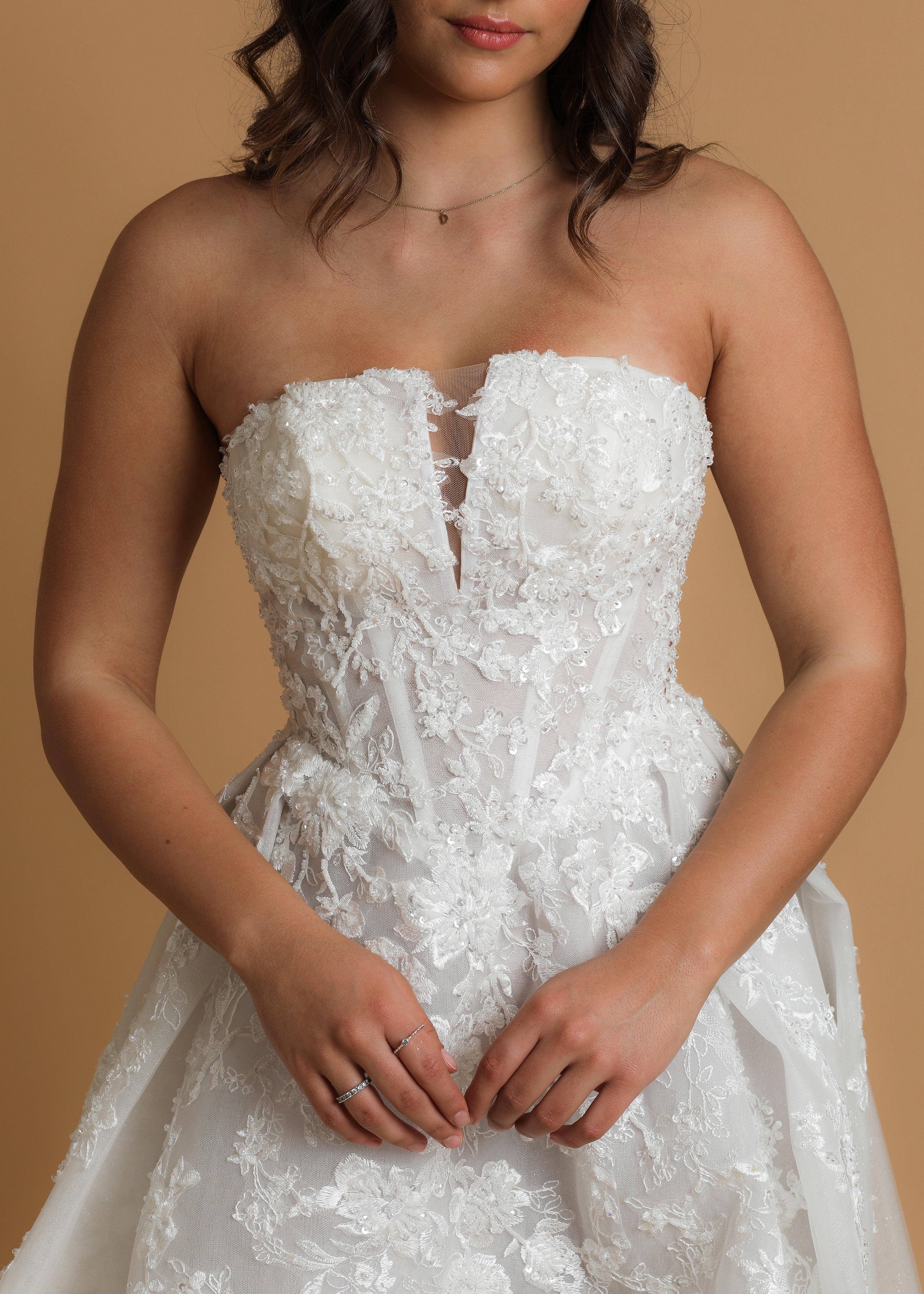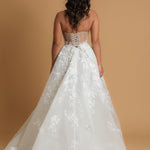 The design artfully combines a straight neckline with a flattering V-neckline, which is delicately covered in white mesh for a soft, ethereal look. The lace-up back provides an adjustable fit, allowing you to feel confident and secure as you walk down the aisle.