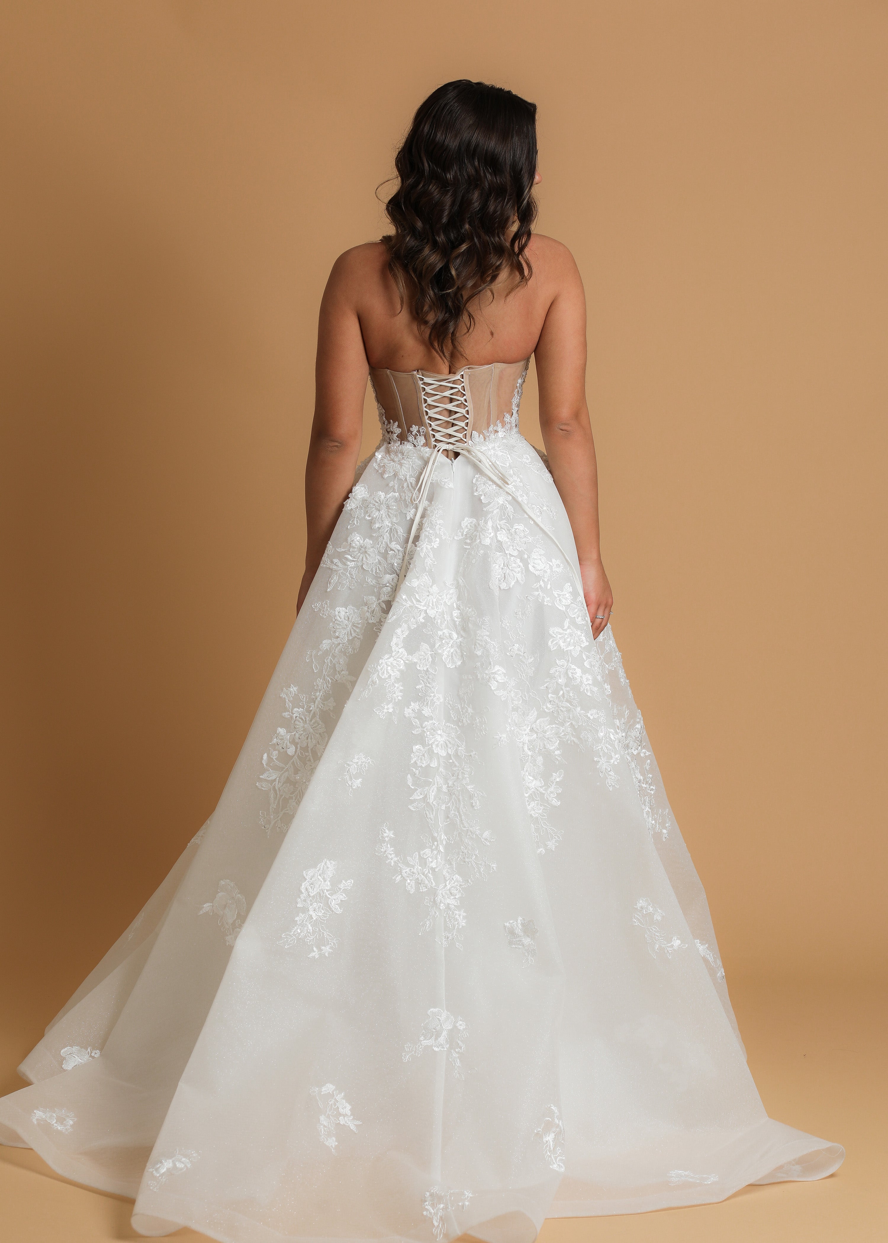 Introducing the elegant "Khloe" wedding dress, a perfect blend of sophistication and romance. This stunning gown features a white boned corset top adorned with intricate lace detailing that accentuates your figure beautifully. The back of the corset showcases a sheer nude mesh, adding a touch of allure while ensuring comfort and support.