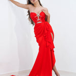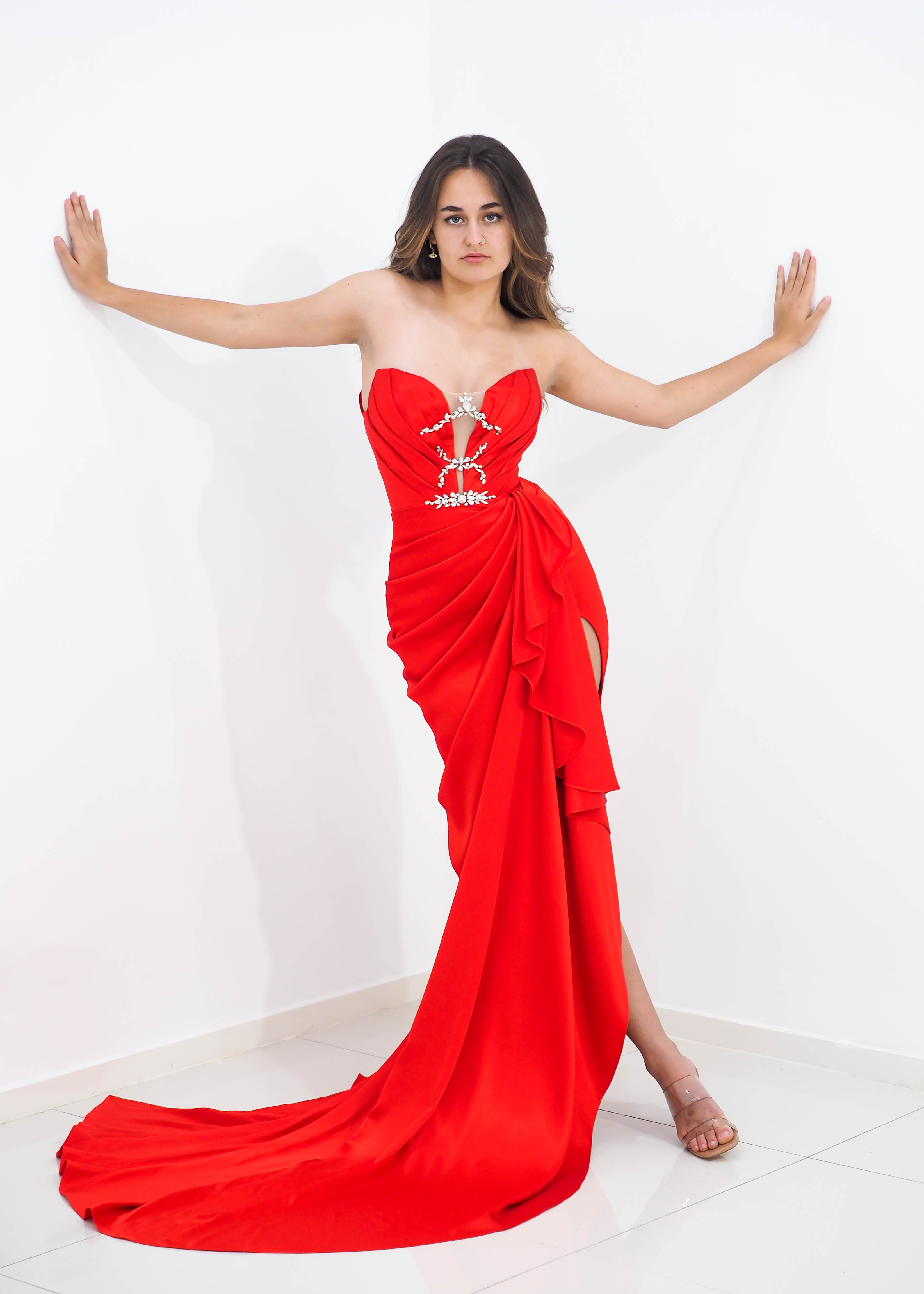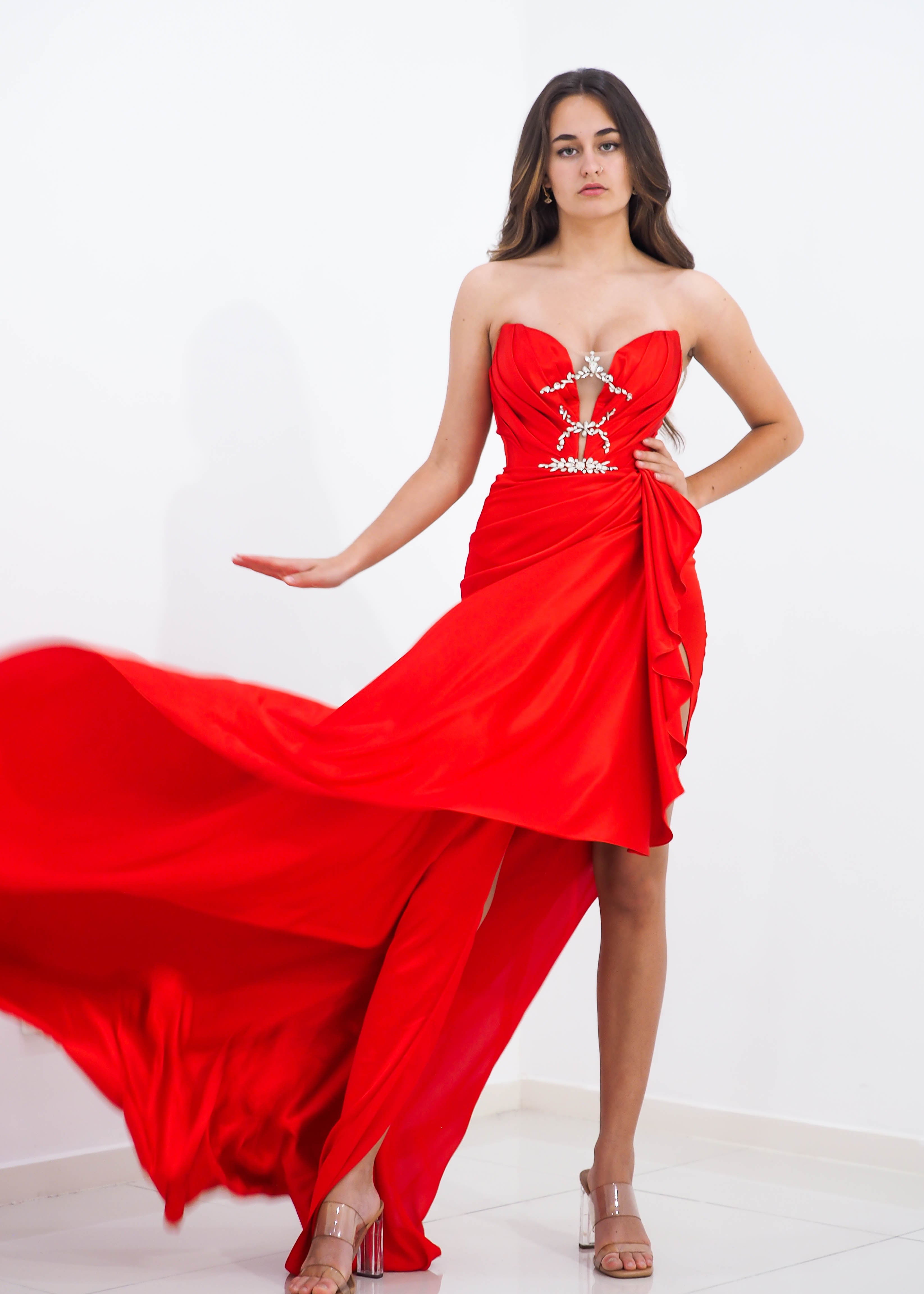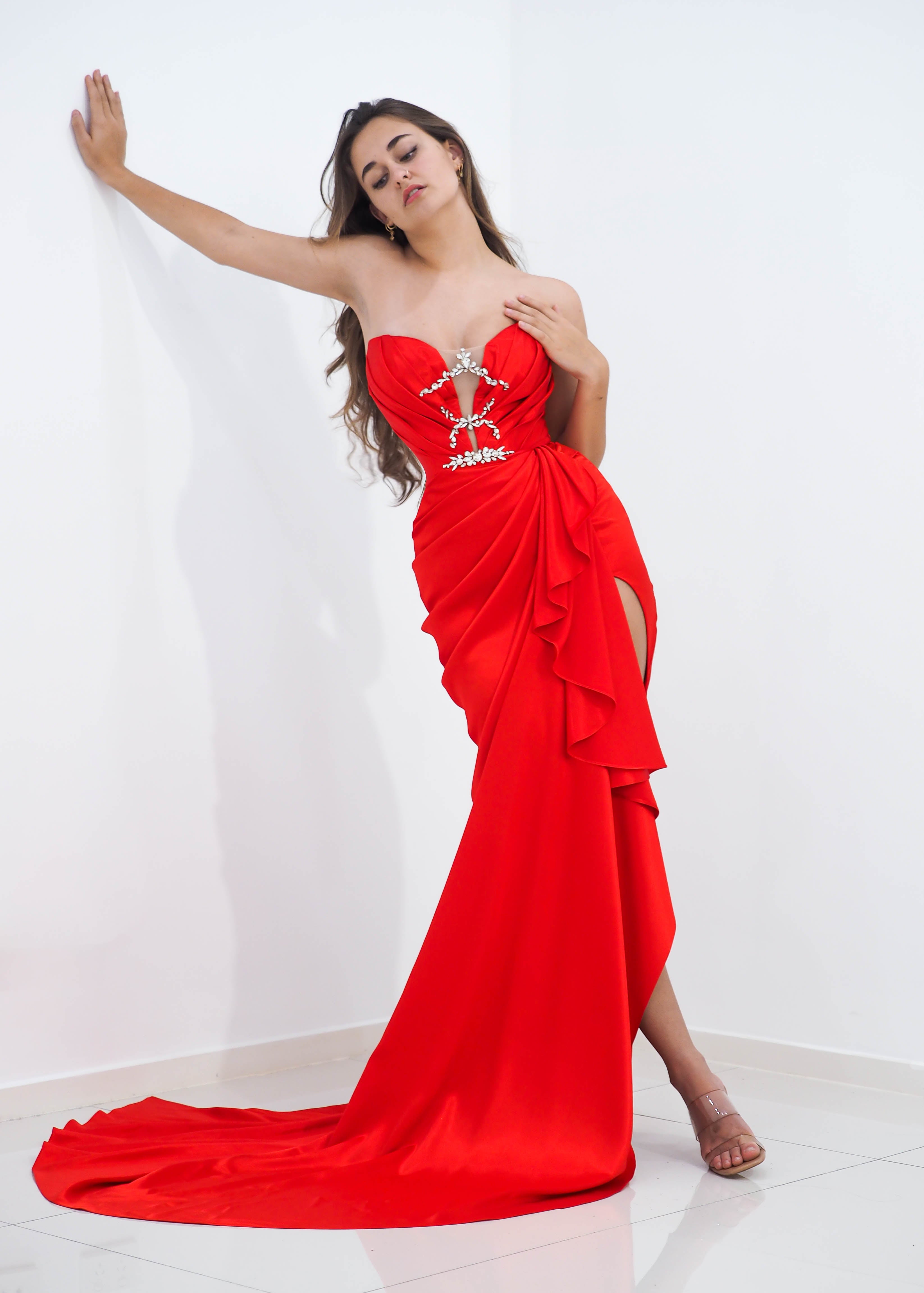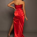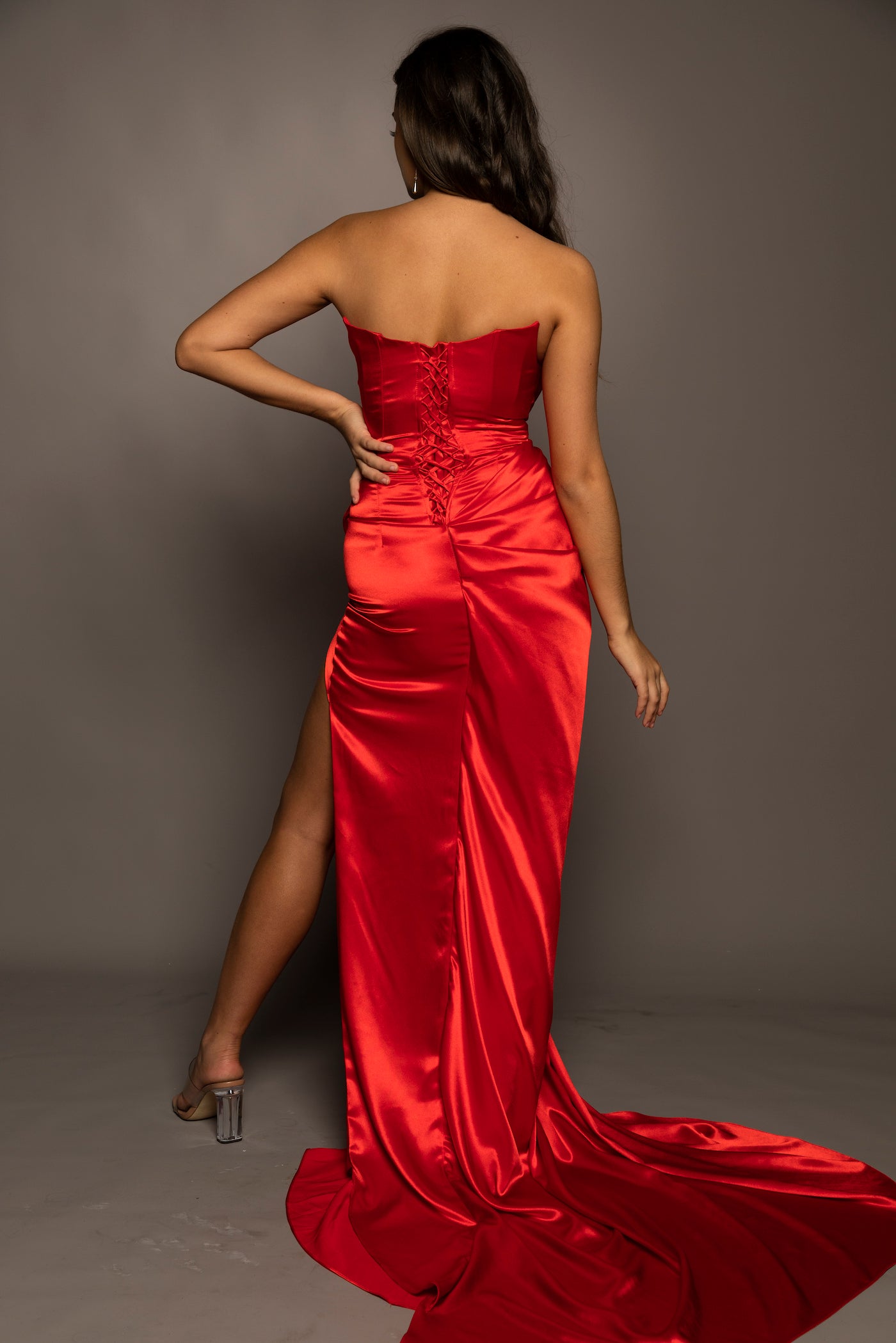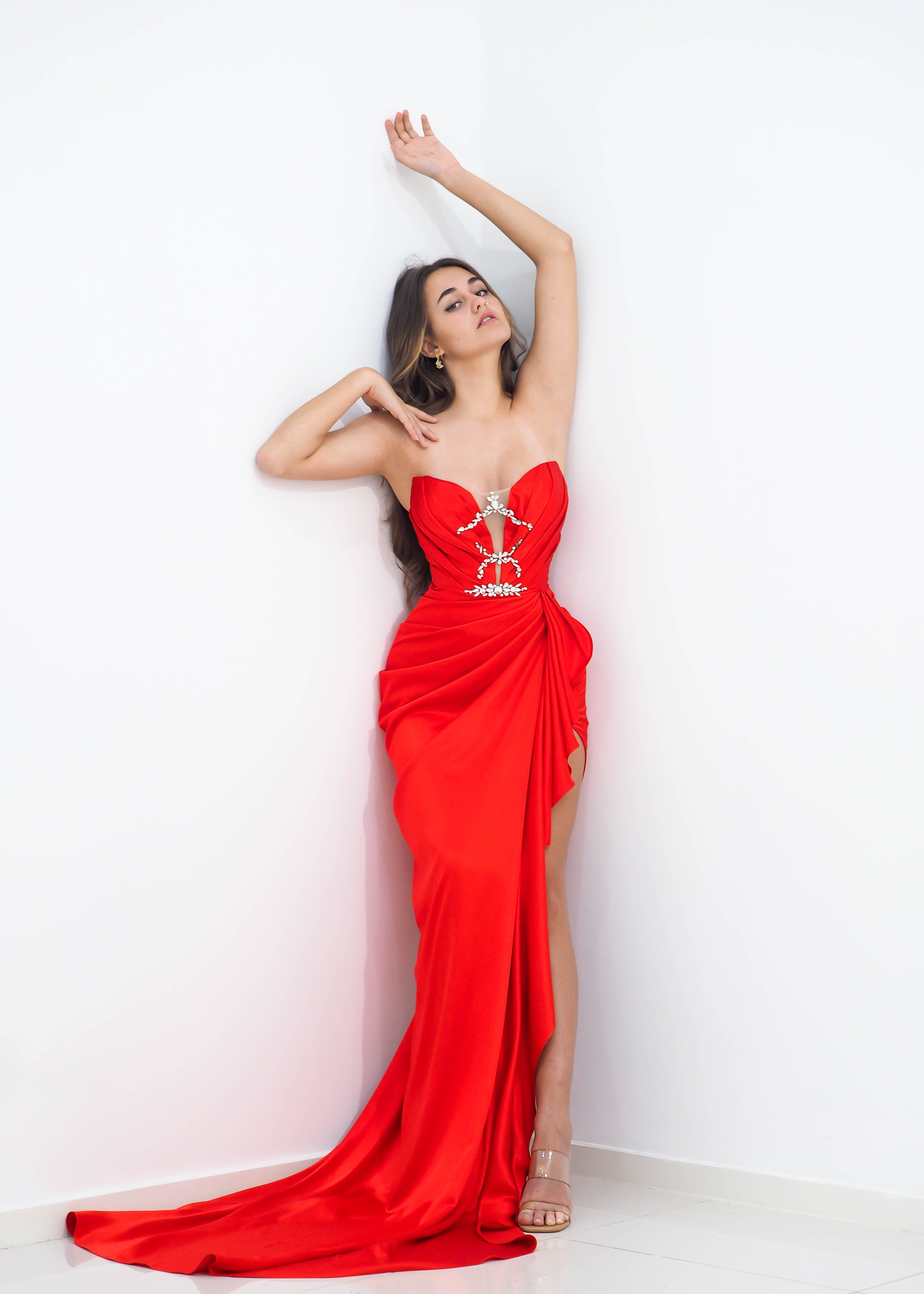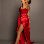 - High quality bright red satin dress with a high slit and hand-draped ruching to create this amazing silhouette which resembles a Greek goddess.