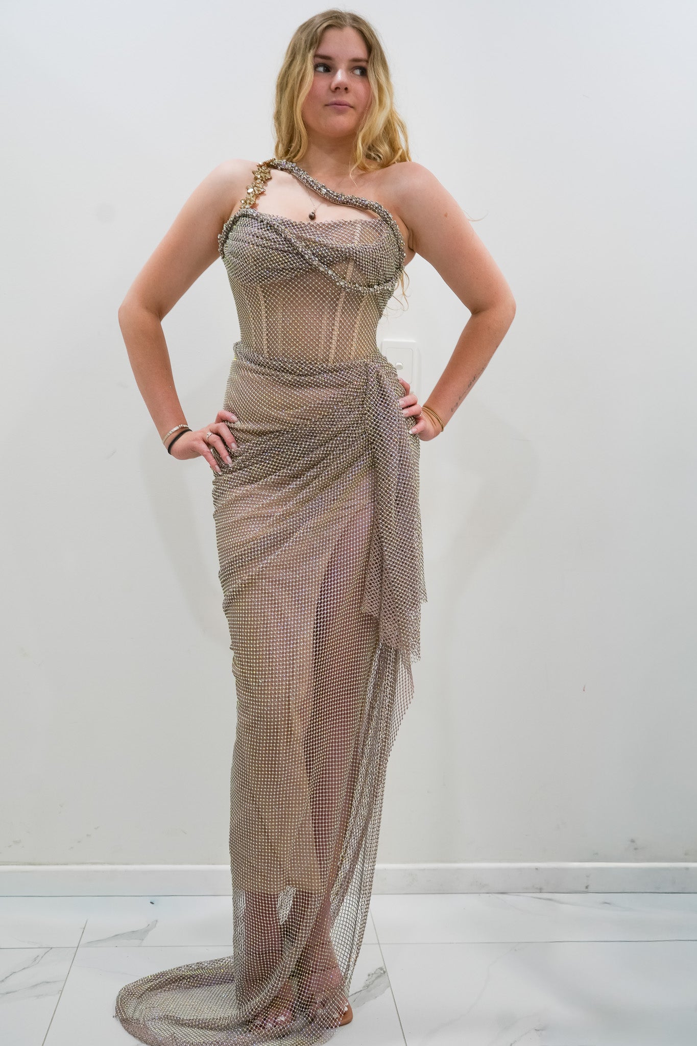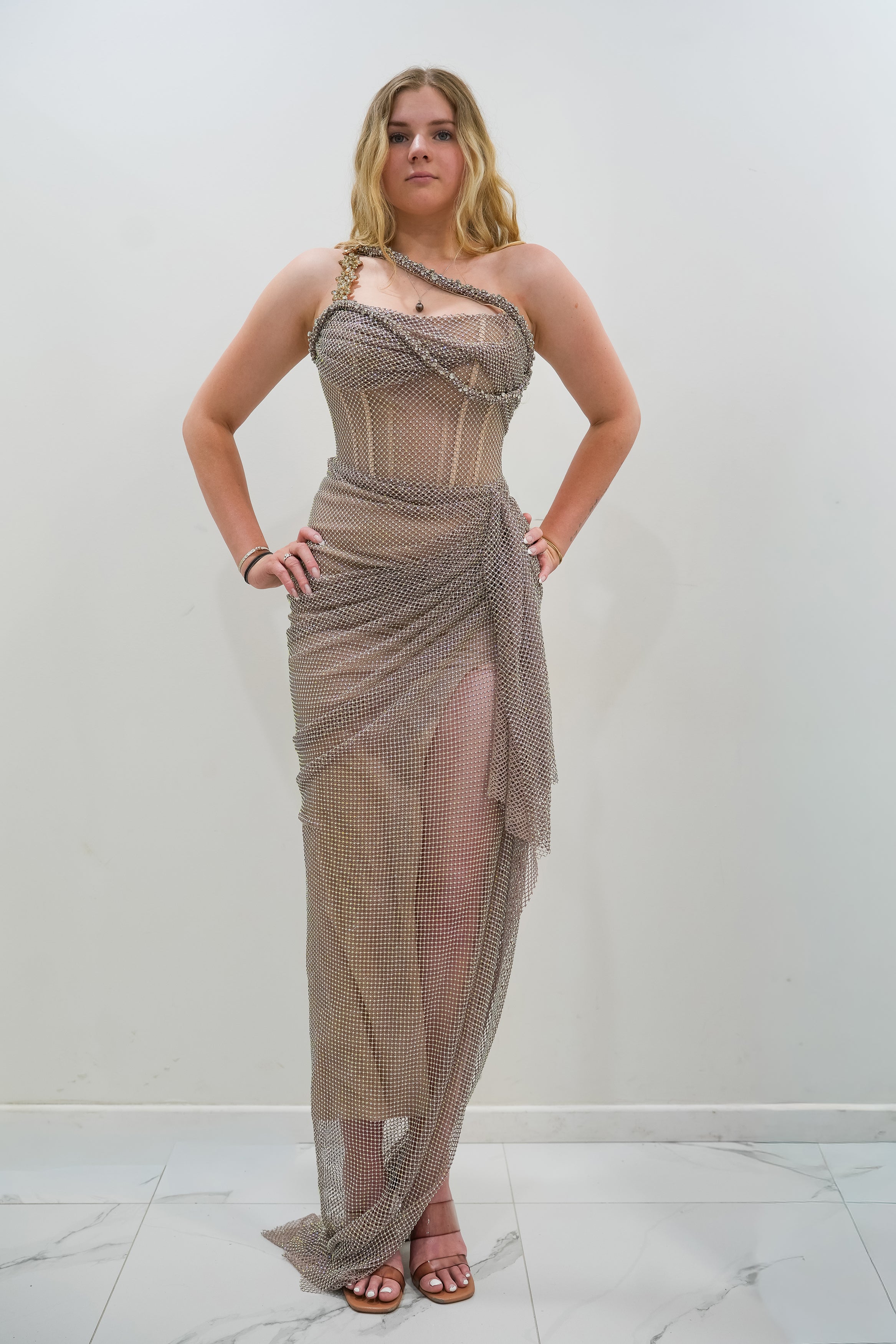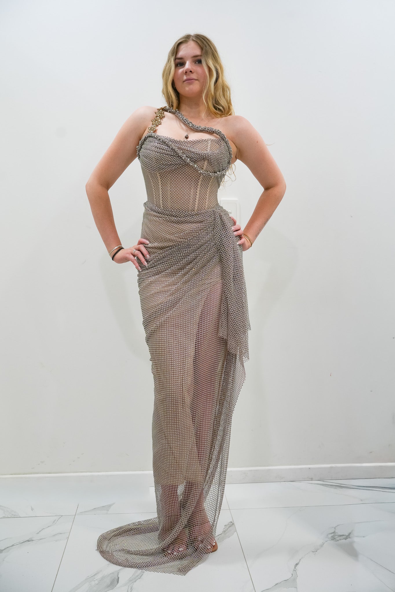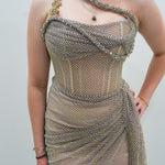 Step into the spotlight with Seralyn, a breathtaking masterpiece crafted for those who demand attention and elegance in equal measure. This dress is wrapped in a rich, dark gold mesh and adorned with thousands of multi-colored rhinestones, each one shimmering like a gemstone under the light—making Seralyn not just a dress, but a work of wearable art.