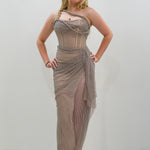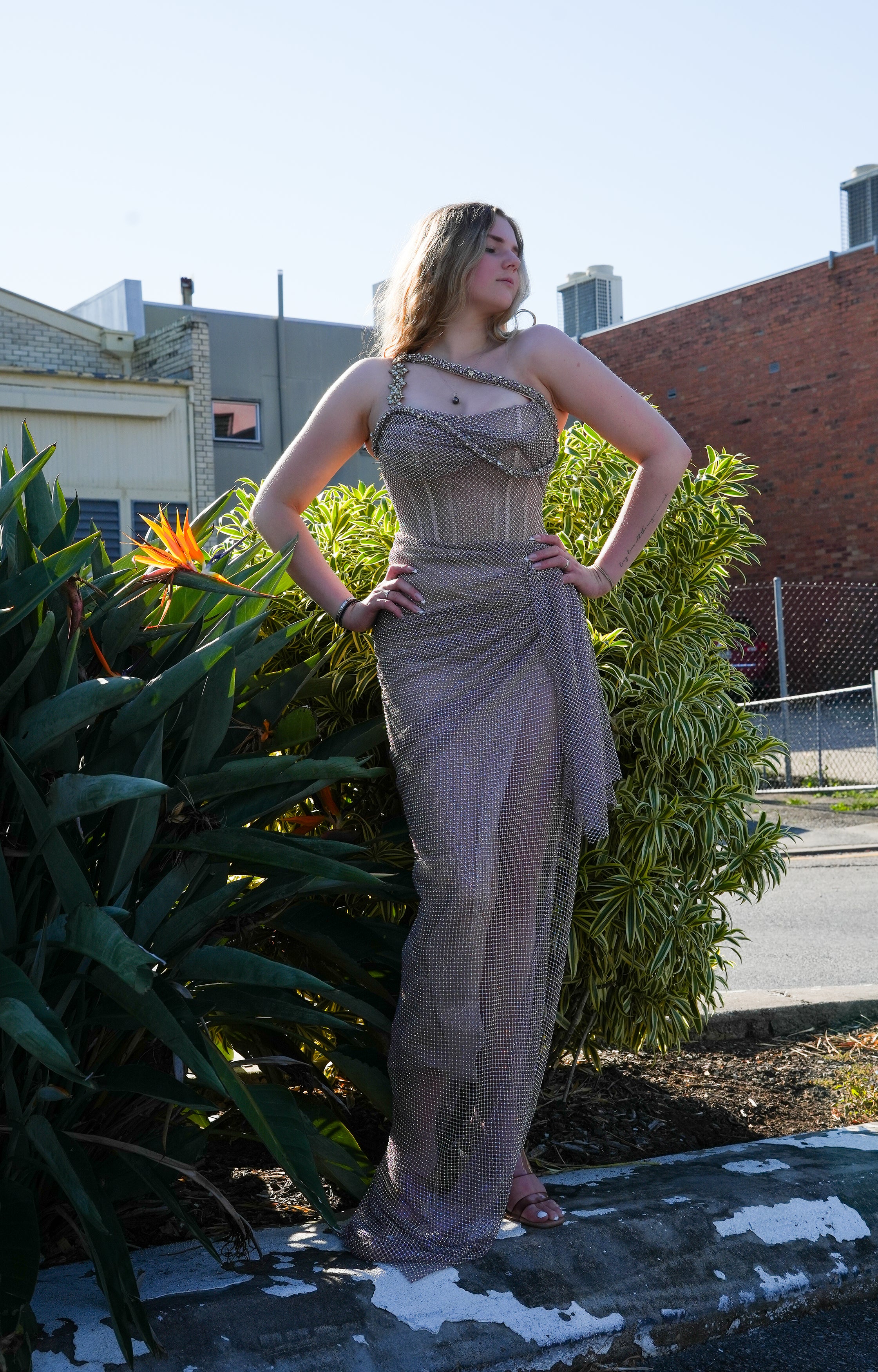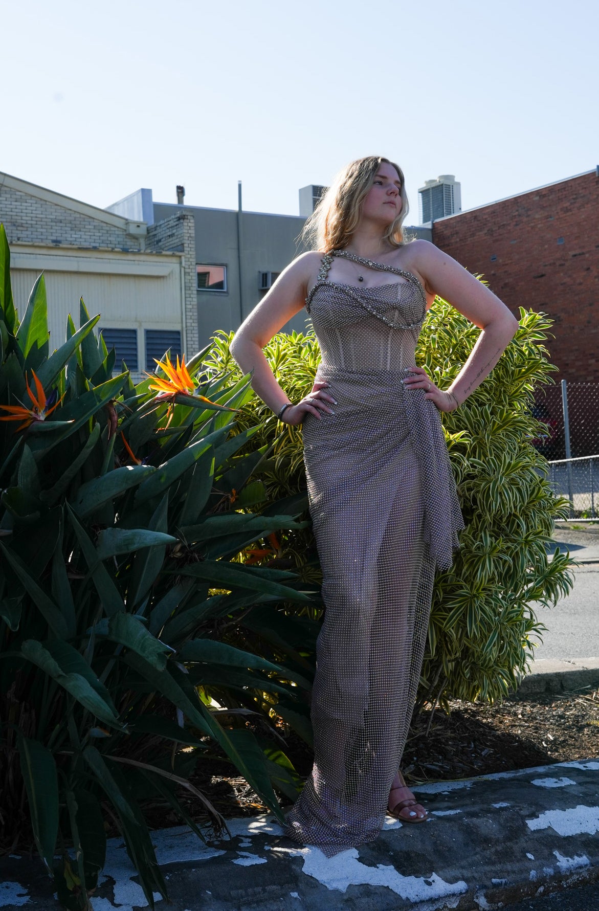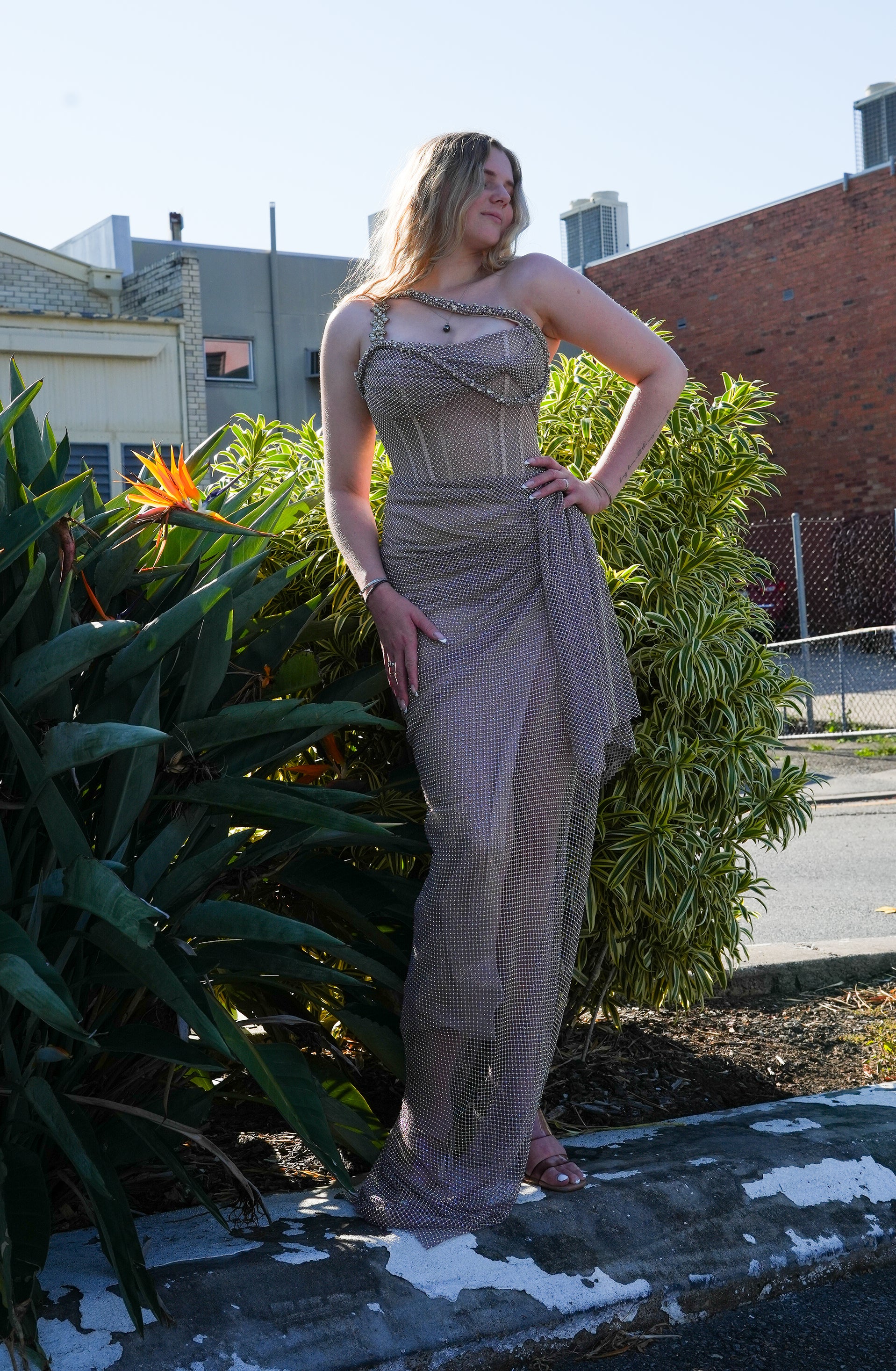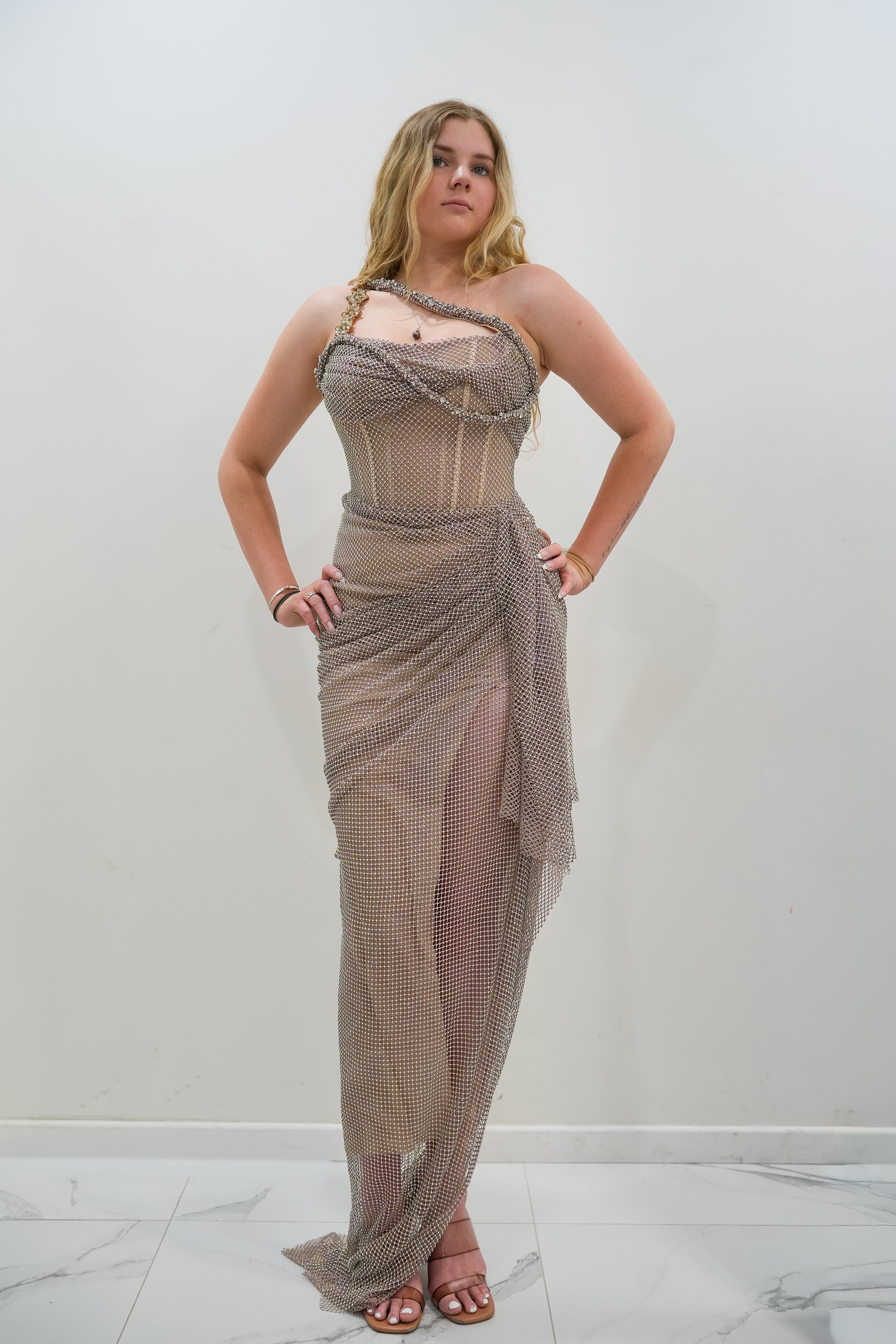 Step into the spotlight with Seralyn, a breathtaking masterpiece crafted for those who demand attention and elegance in equal measure. This dress is wrapped in a rich, dark gold mesh and adorned with thousands of multi-colored rhinestones, each one shimmering like a gemstone under the light—making Seralyn not just a dress, but a work of wearable art.