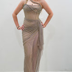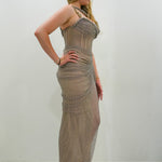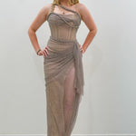 The ruching along the neckline adds a soft, romantic texture, while the thigh-high slit balances the look with an alluring edge. A built-in corset cinches the waist beautifully, sculpting an ultra-flattering silhouette that exudes confidence and grace.
