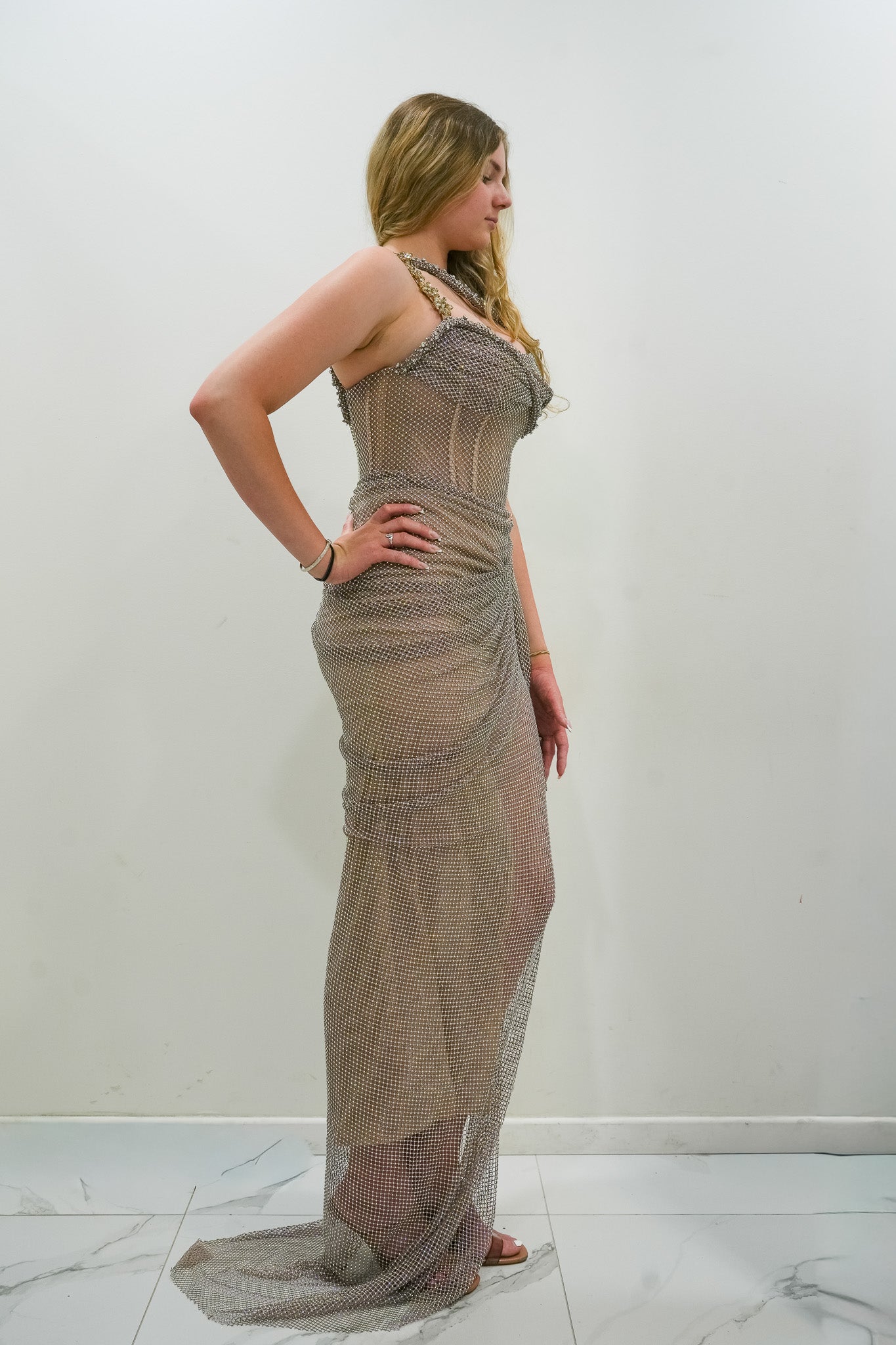 - High quality dark gold meshed cover in thousands of multi-colored rhinestone really make this dress a work of art.