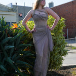 Dark muted gold purple ruching top with lace up back dress with crystal gold strap details