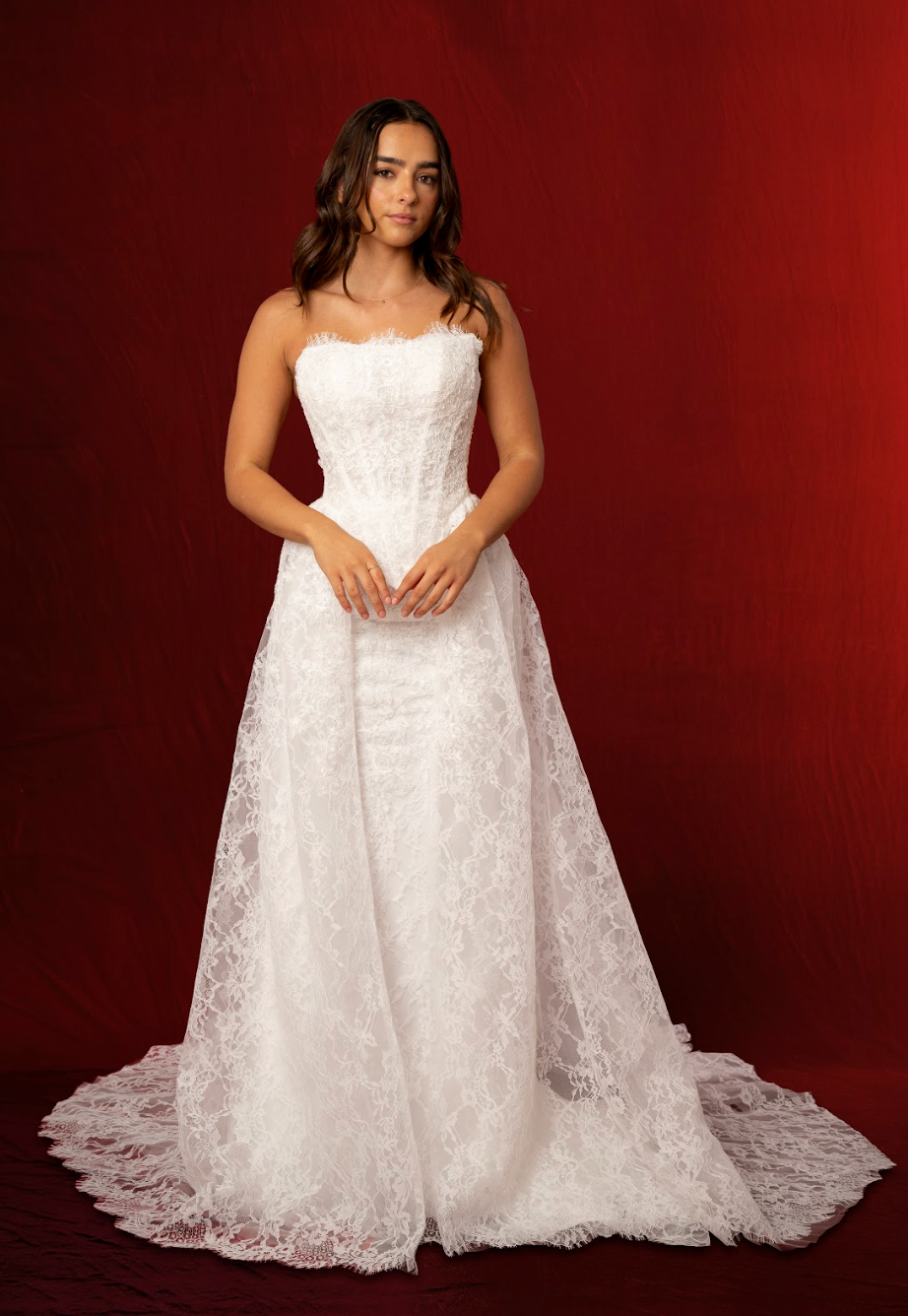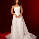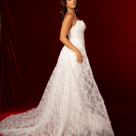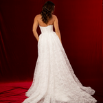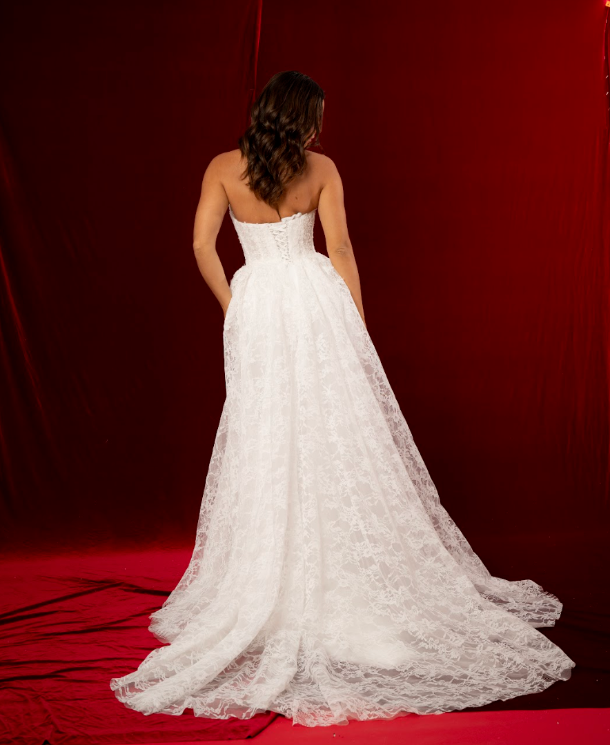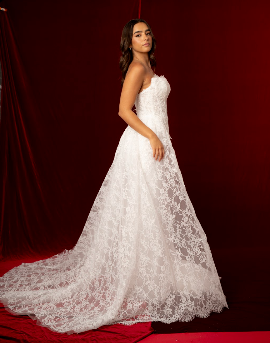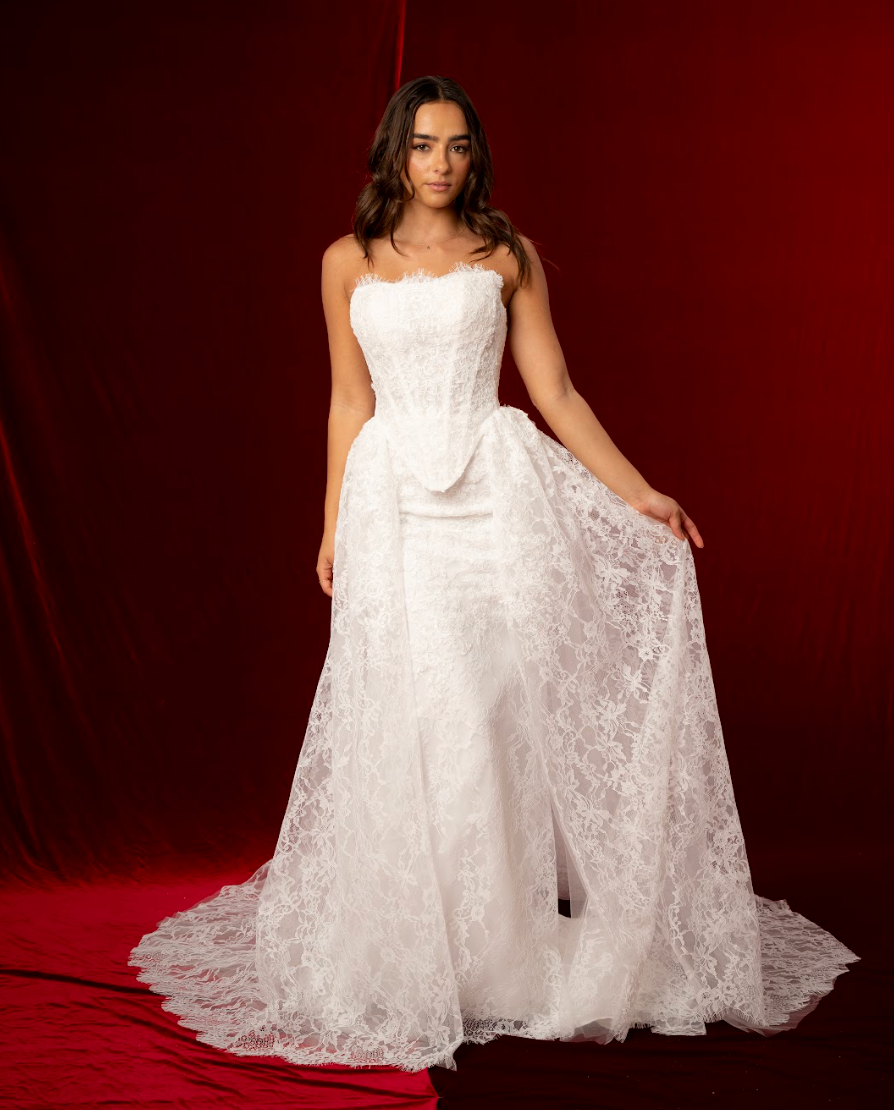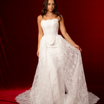 Crafted from intricate lace fabric, the dress is adorned with delicate floral patterns that give it an elegant, textured finish. The mermaid skirt hugs the hips and thighs before gently flaring out, enhancing the figure with graceful movement. A detachable lace train adds versatility, allowing the bride to enjoy dramatic ceremony elegance and then remove it for a lighter, more comfortable reception look. With its blend of structure, lace detail, and detachable train, Solene is perfect for brides seeking both glamour and romance.