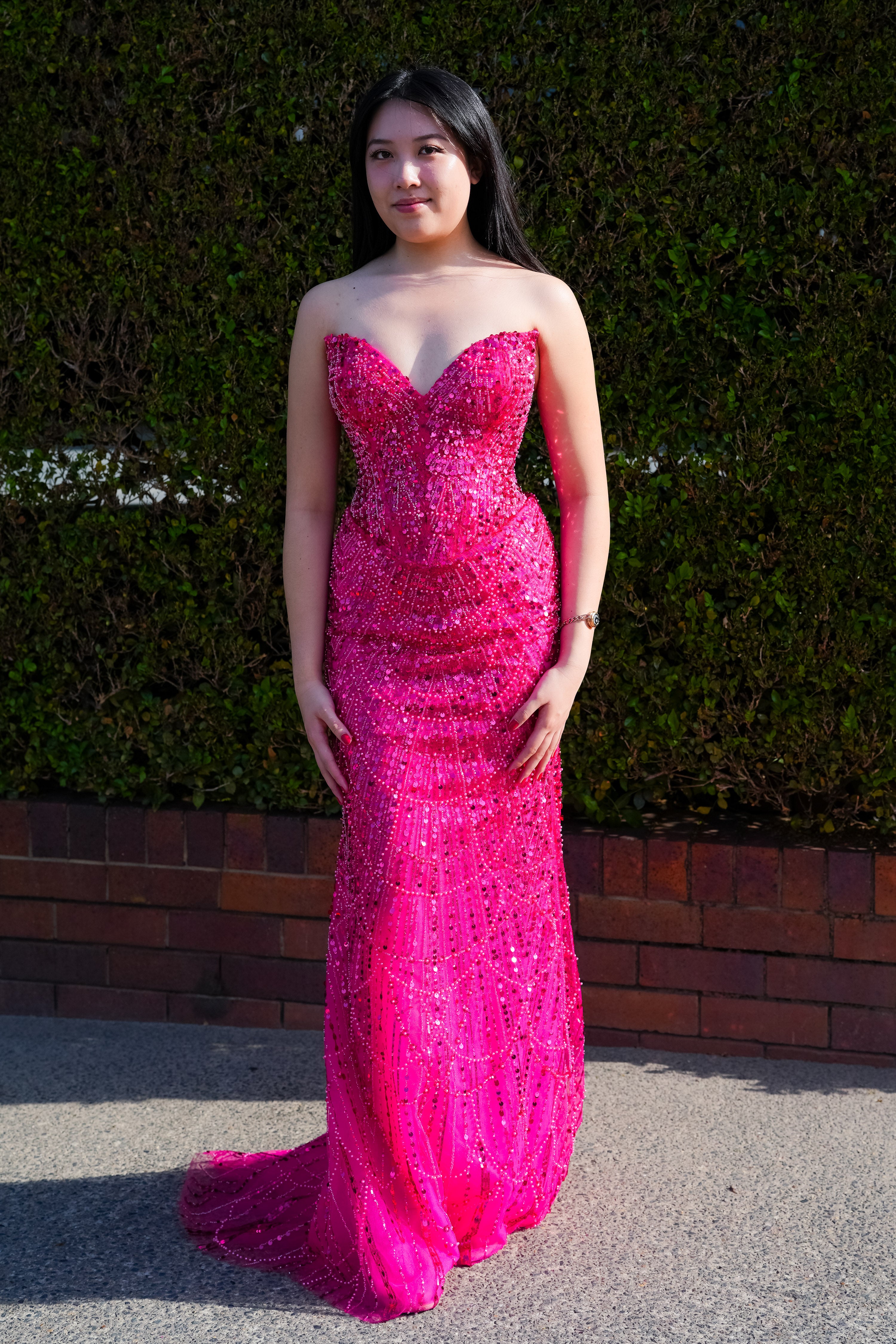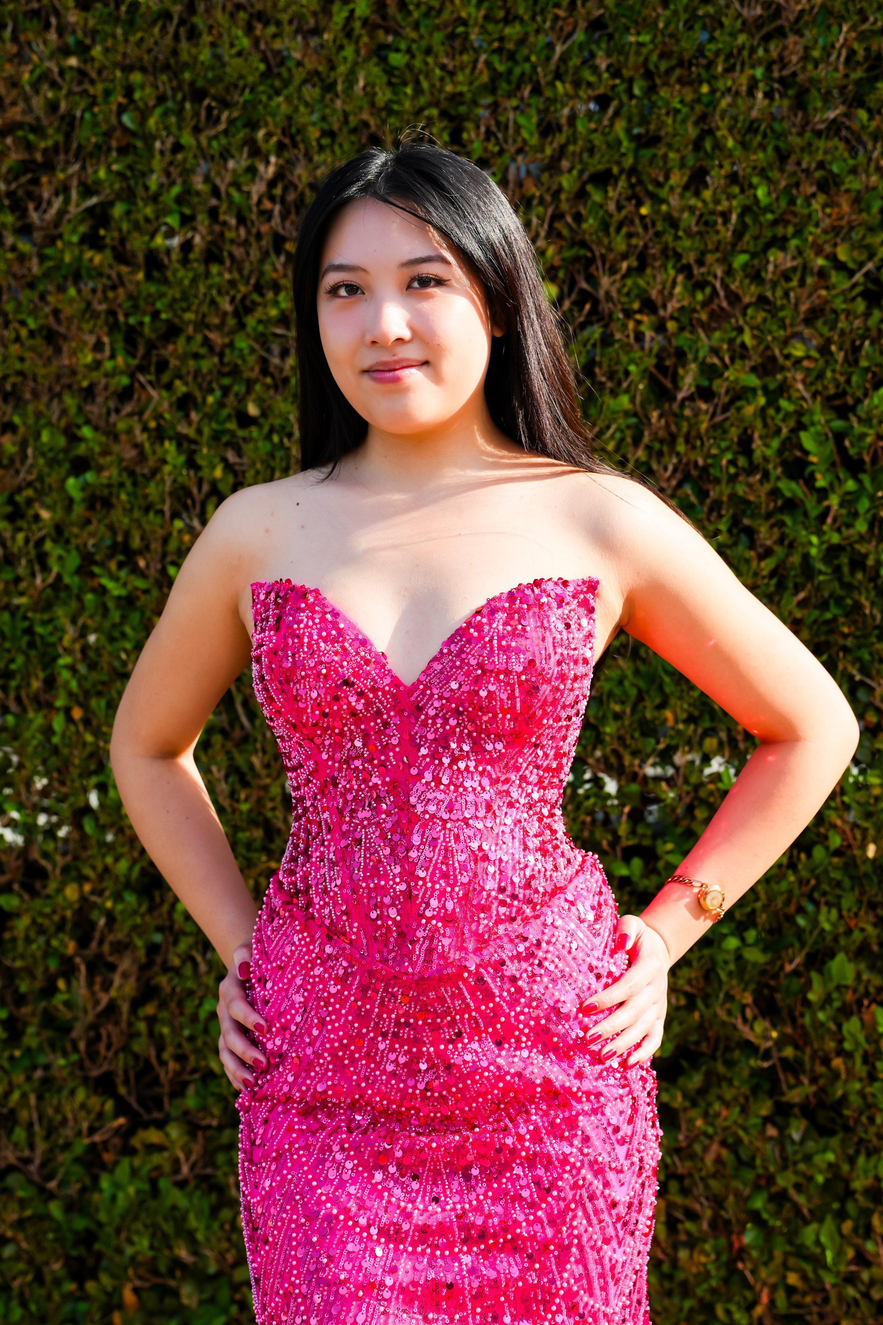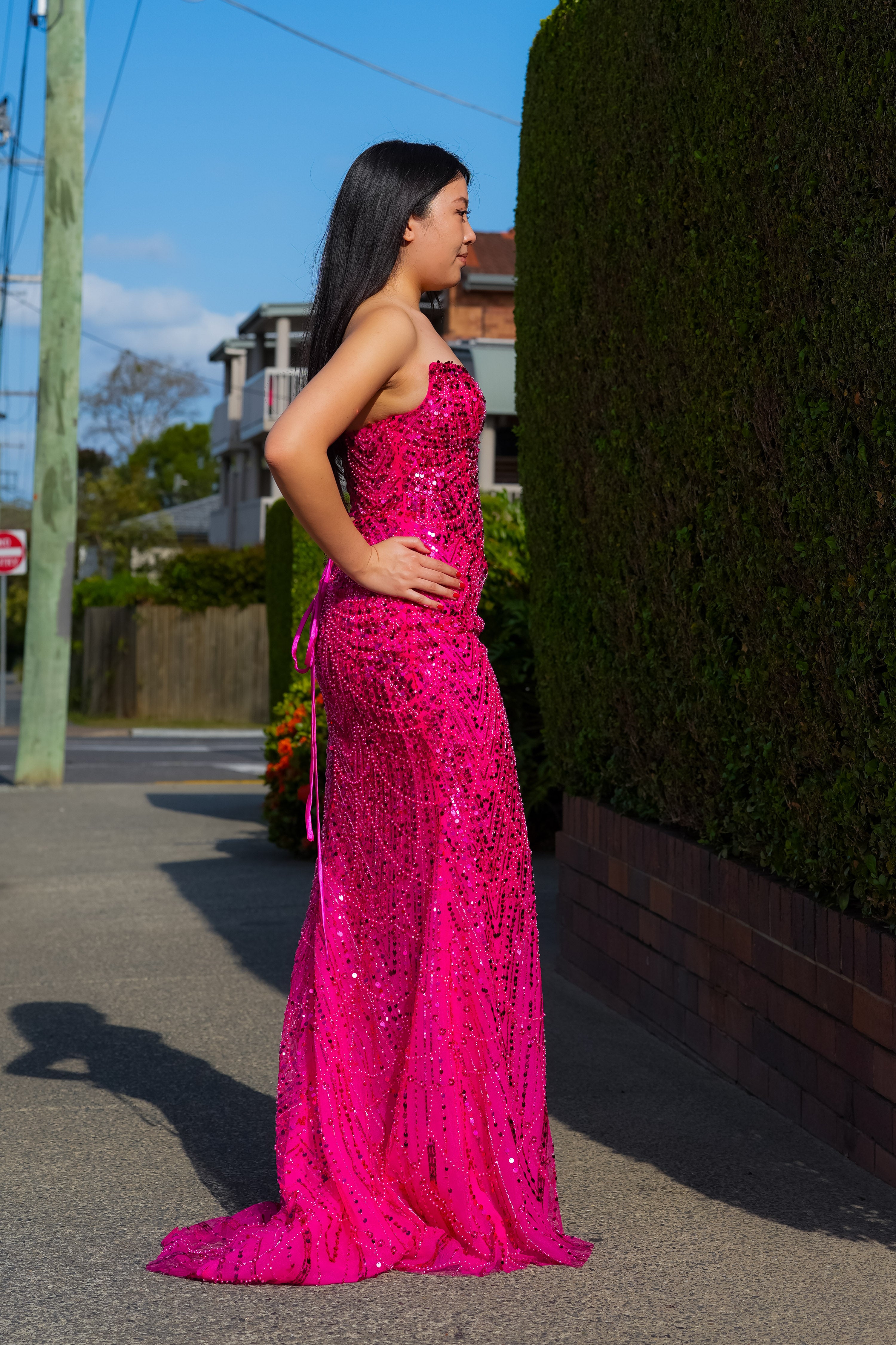Introducing Kalea — a dress that embodies strength, beauty, and pure radiance. Crafted from luxurious hot pink beaded fabric, Kalea is adorned with delicate daisy sequin flowers from top to hem, catching the light in the most magical way. Intricate dangling lace trails gracefully from the skirt and bodice, adding an ethereal, romantic movement with every step. It's a gown that glows with elegance while commanding the room with confidence.