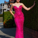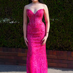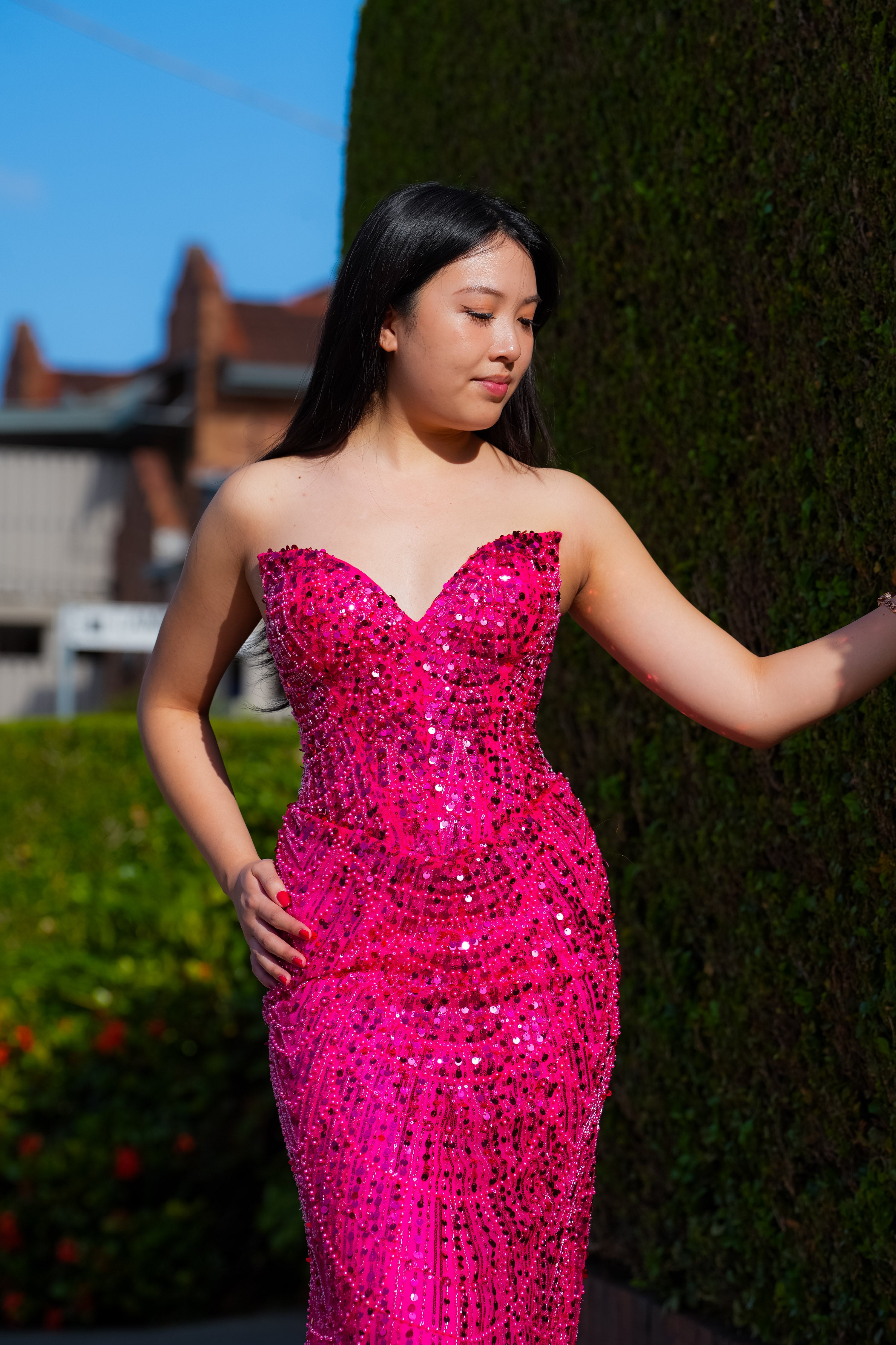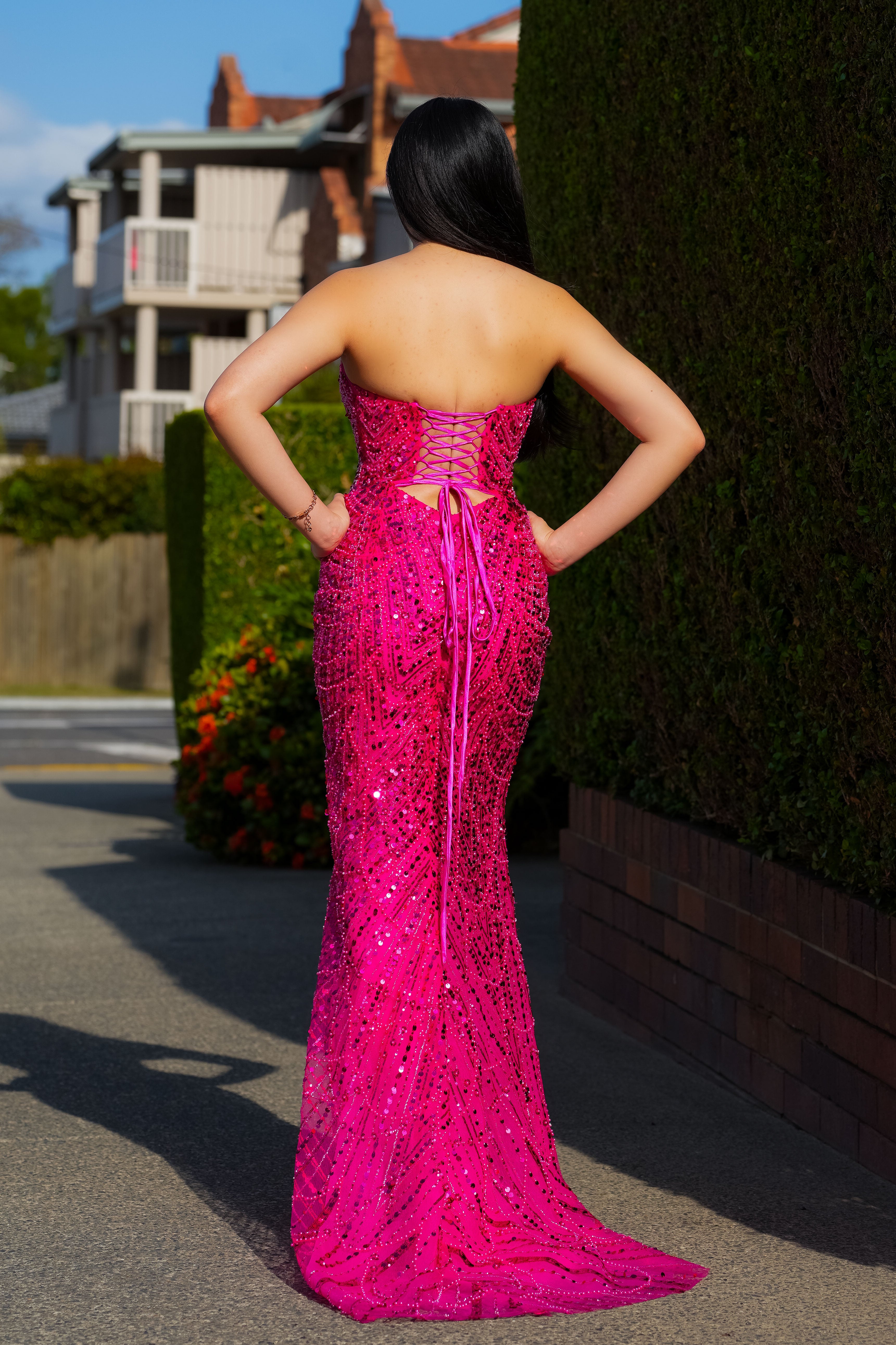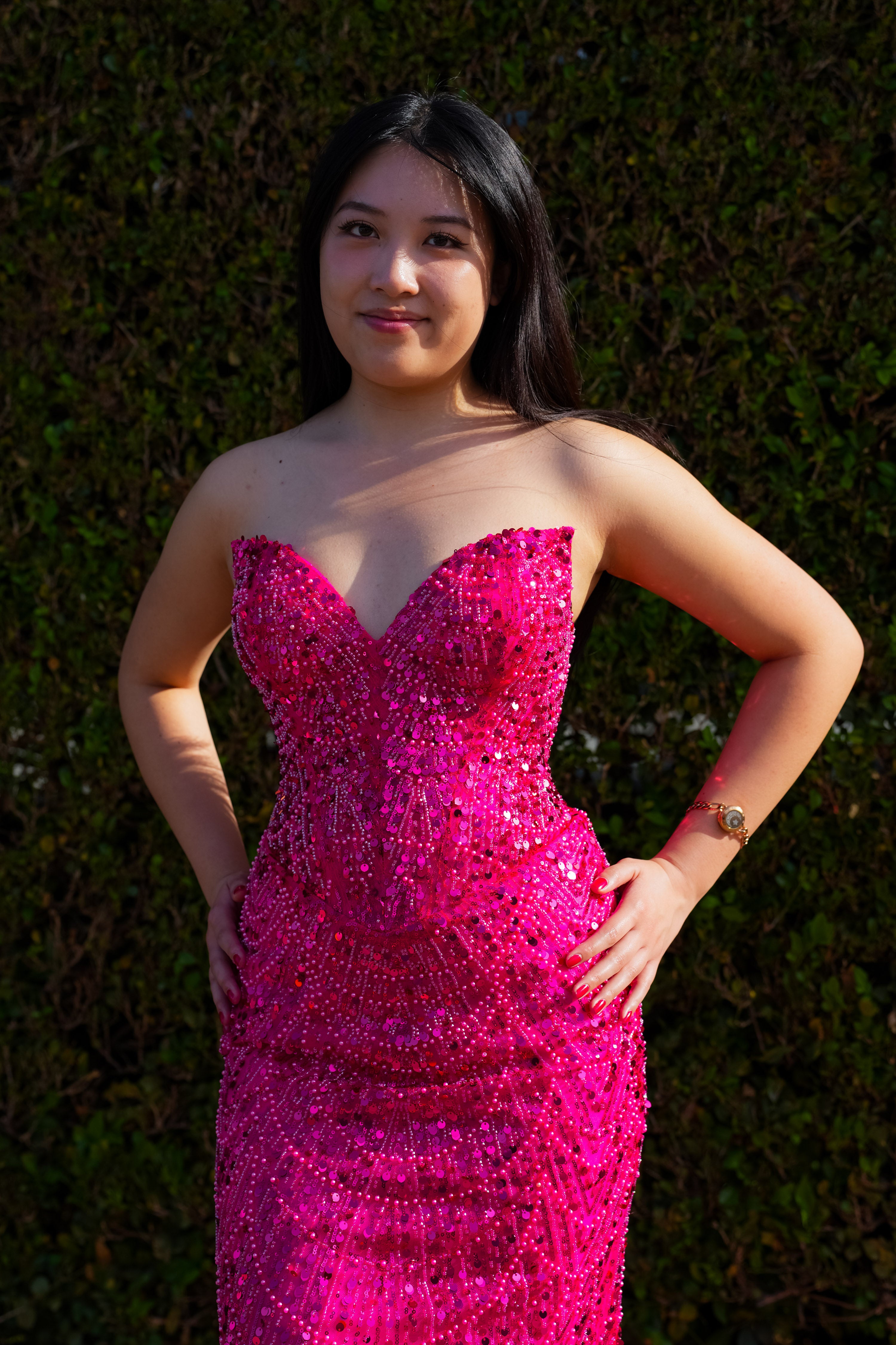 Introducing Kalea — a dress that embodies strength, beauty, and pure radiance. Crafted from luxurious hot pink beaded fabric, Kalea is adorned with delicate daisy sequin flowers from top to hem, catching the light in the most magical way. Intricate dangling lace trails gracefully from the skirt and bodice, adding an ethereal, romantic movement with every step. It's a gown that glows with elegance while commanding the room with confidence.