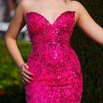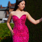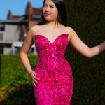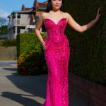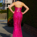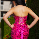 Hot pink beaded Basque waist open back dangling lace v neck corset top mermaid dress