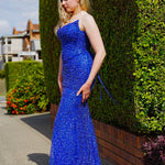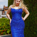 Royal blue beaded daisy sequin flowers dress with basque waist and open back