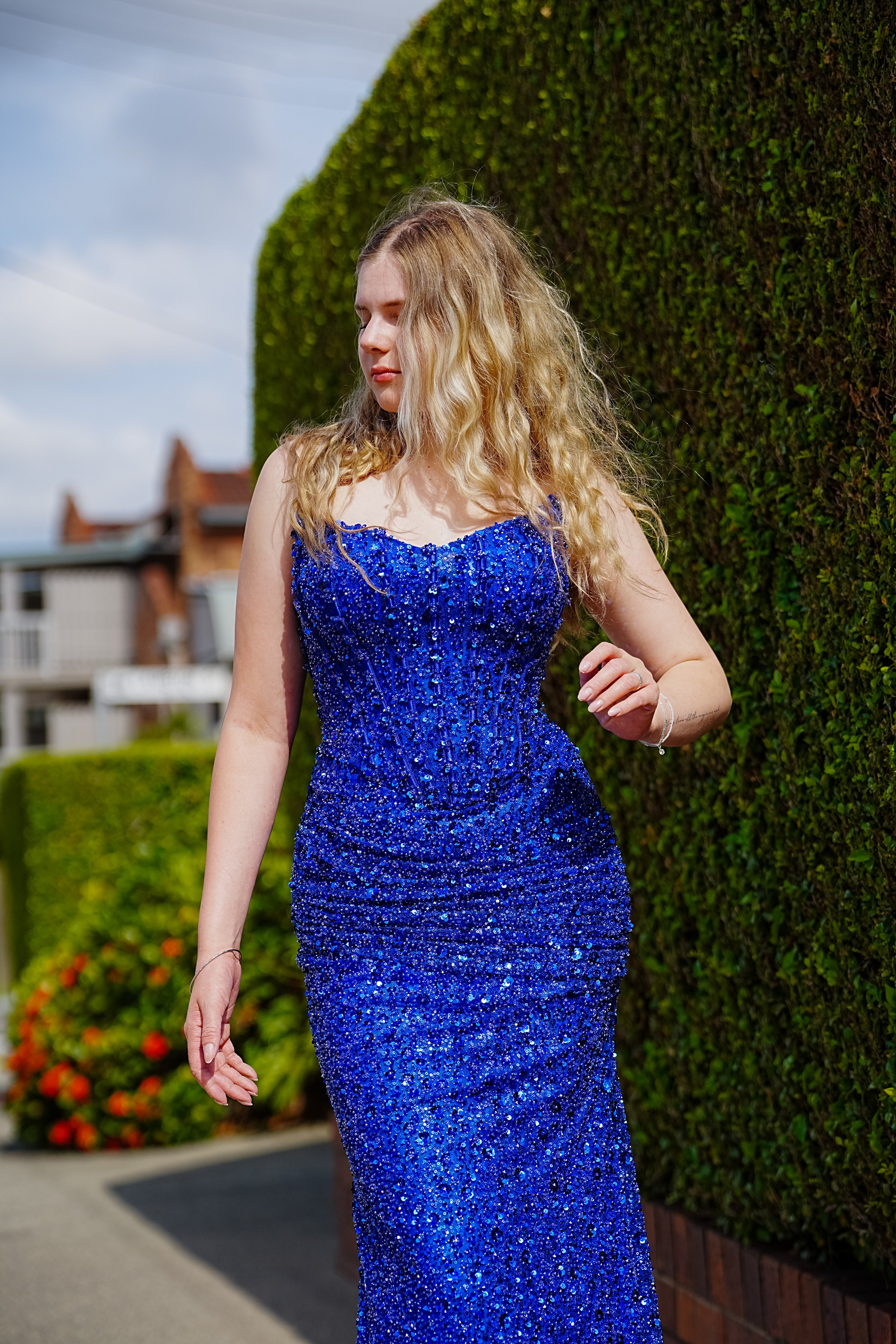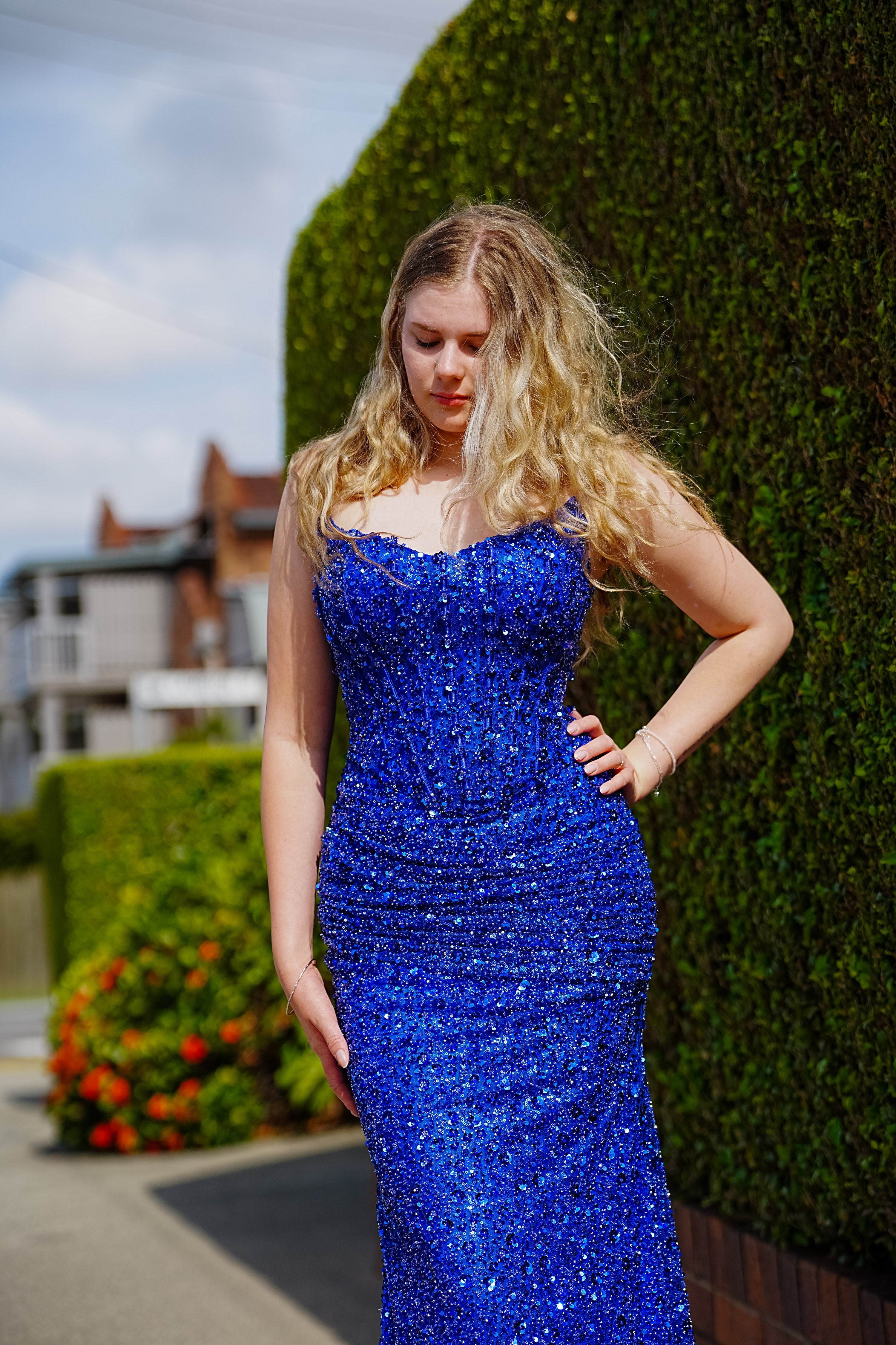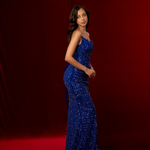 Introducing Europa – a dress that embodies strength, beauty, and pure radiance. Crafted from luxurious royal blue beaded fabric, Europa is adorned with delicate daisy sequin flowers from top to hem, catching the light in the most magical way. It's a gown that glows with elegance while commanding the room with confidence.