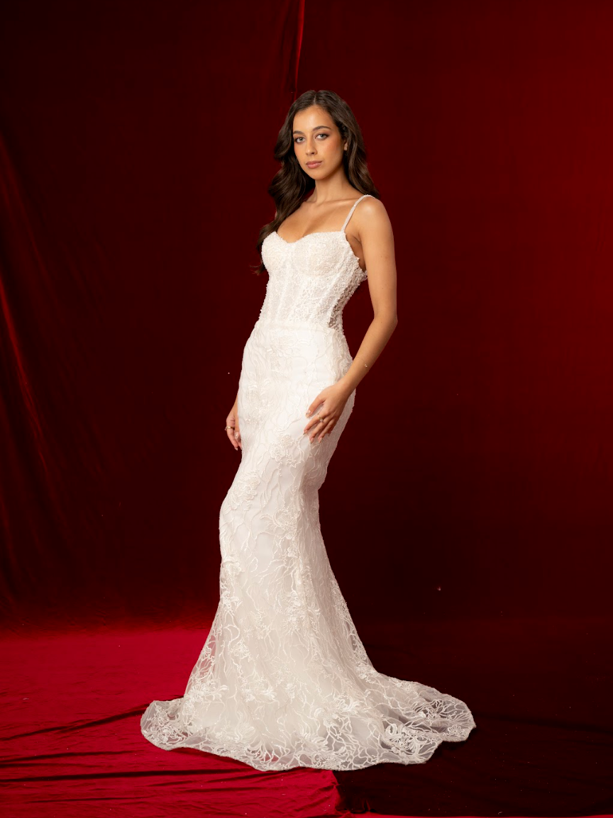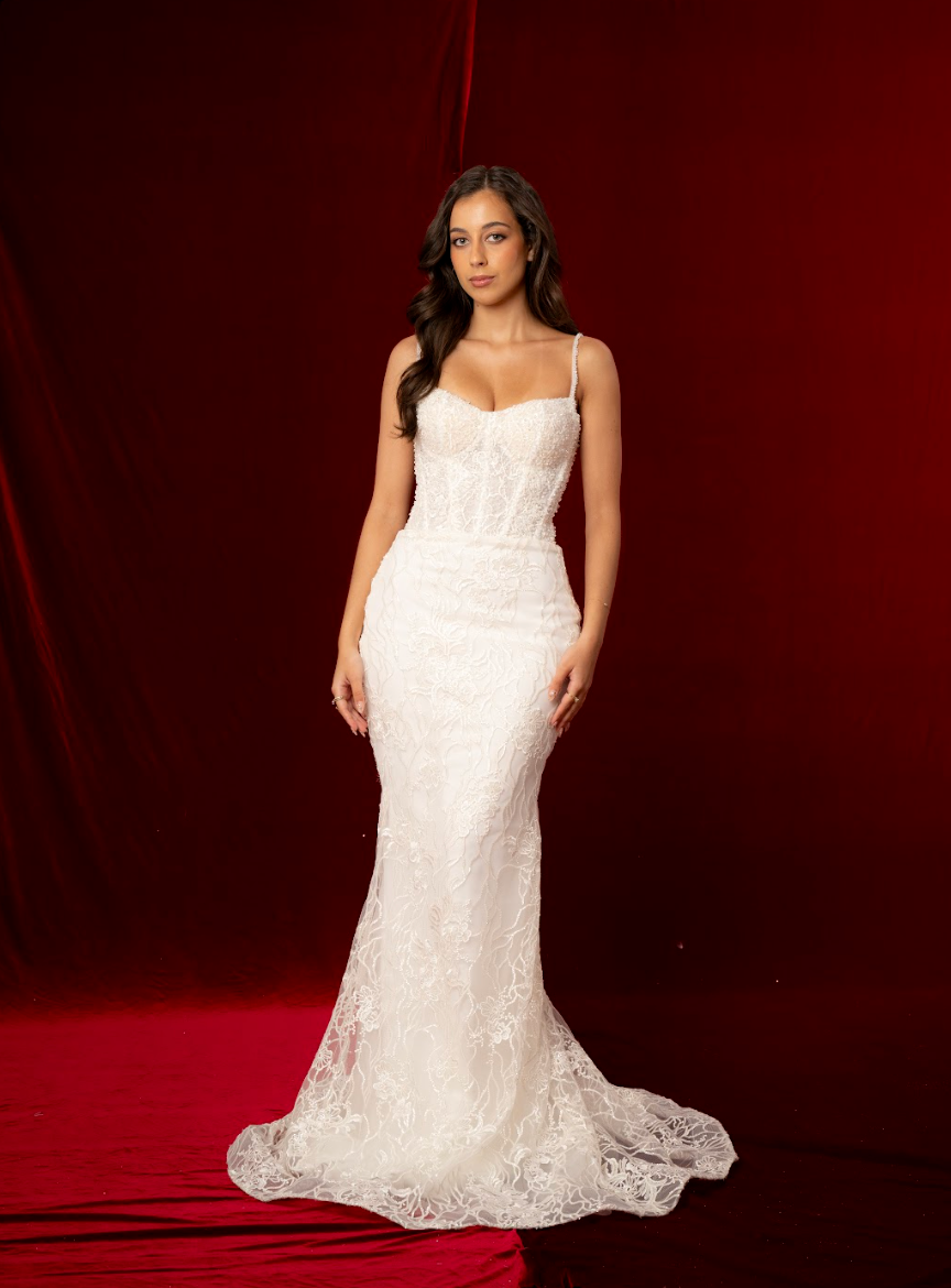 The Yara wedding dress is an elegant mermaid silhouette designed to contour the body and flare gracefully at the hem. The bodice features beautifully structured, sculpted cups with a romantic sweetheart neckline that enhances the décolletage while providing flattering support and shape. Crafted from intricately beaded lace fabric, the gown showcases detailed floral embroidery layered over a soft, sheer base, creating depth, texture, and dimension throughout. The hand-applied beading adds a refined shimmer that catches the light subtly with every movement.