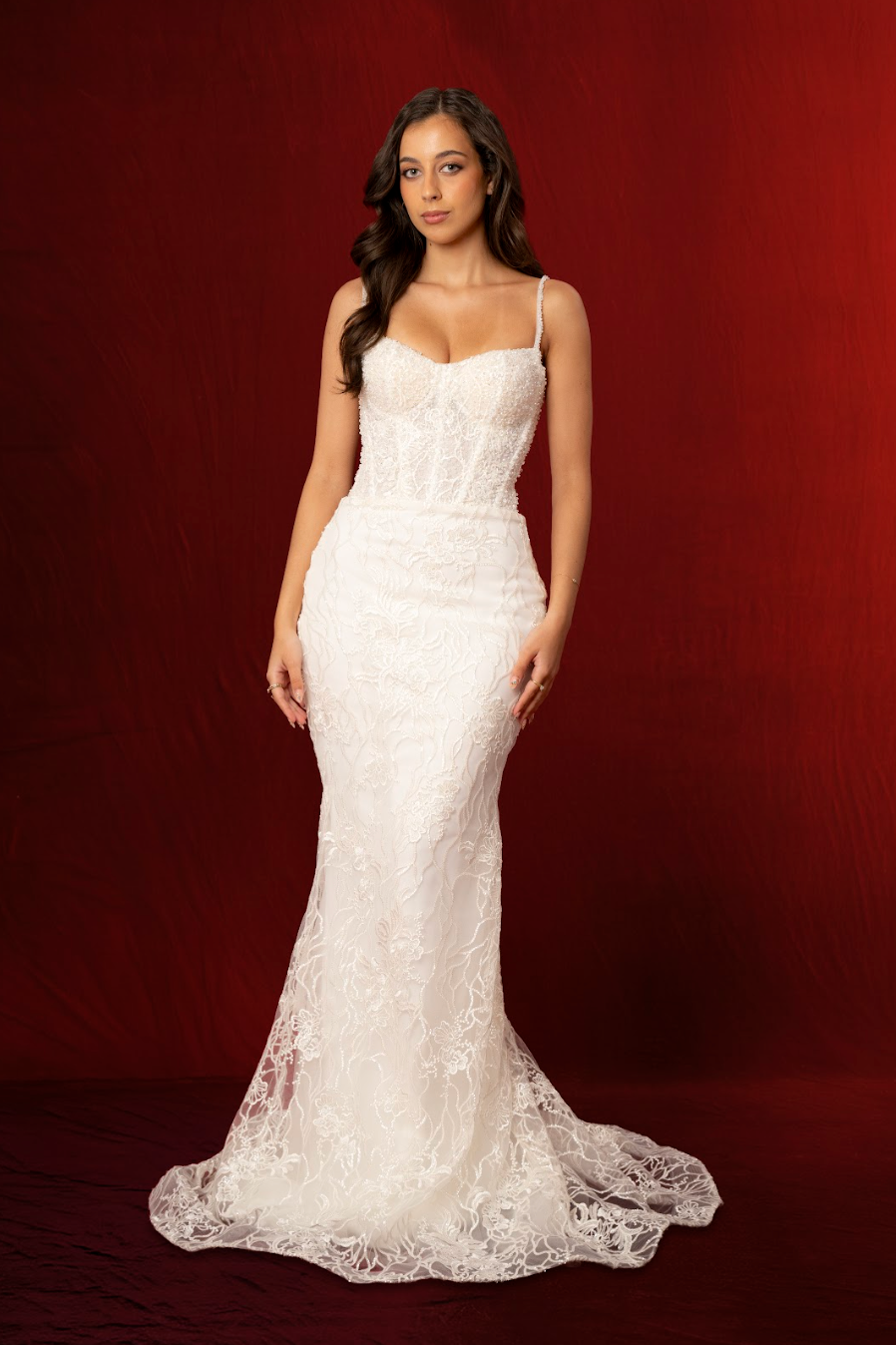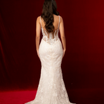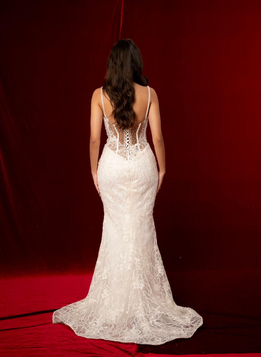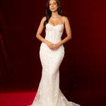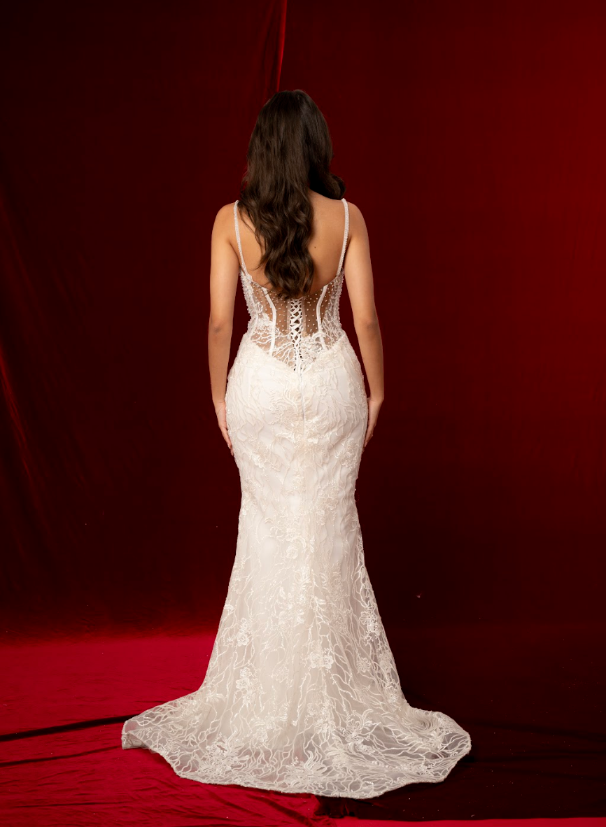 A classic corset back allows for an adjustable, cinched fit, accentuating the waist and enhancing the gown’s hourglass effect. Slim, delicate straps offer comfort and balance to the fitted bodice while adding a modern touch. The lace continues seamlessly through the hips into the dramatic mermaid skirt, flowing into a soft, sweeping train finished with ornate embroidered edging for a timeless and romantic statement.