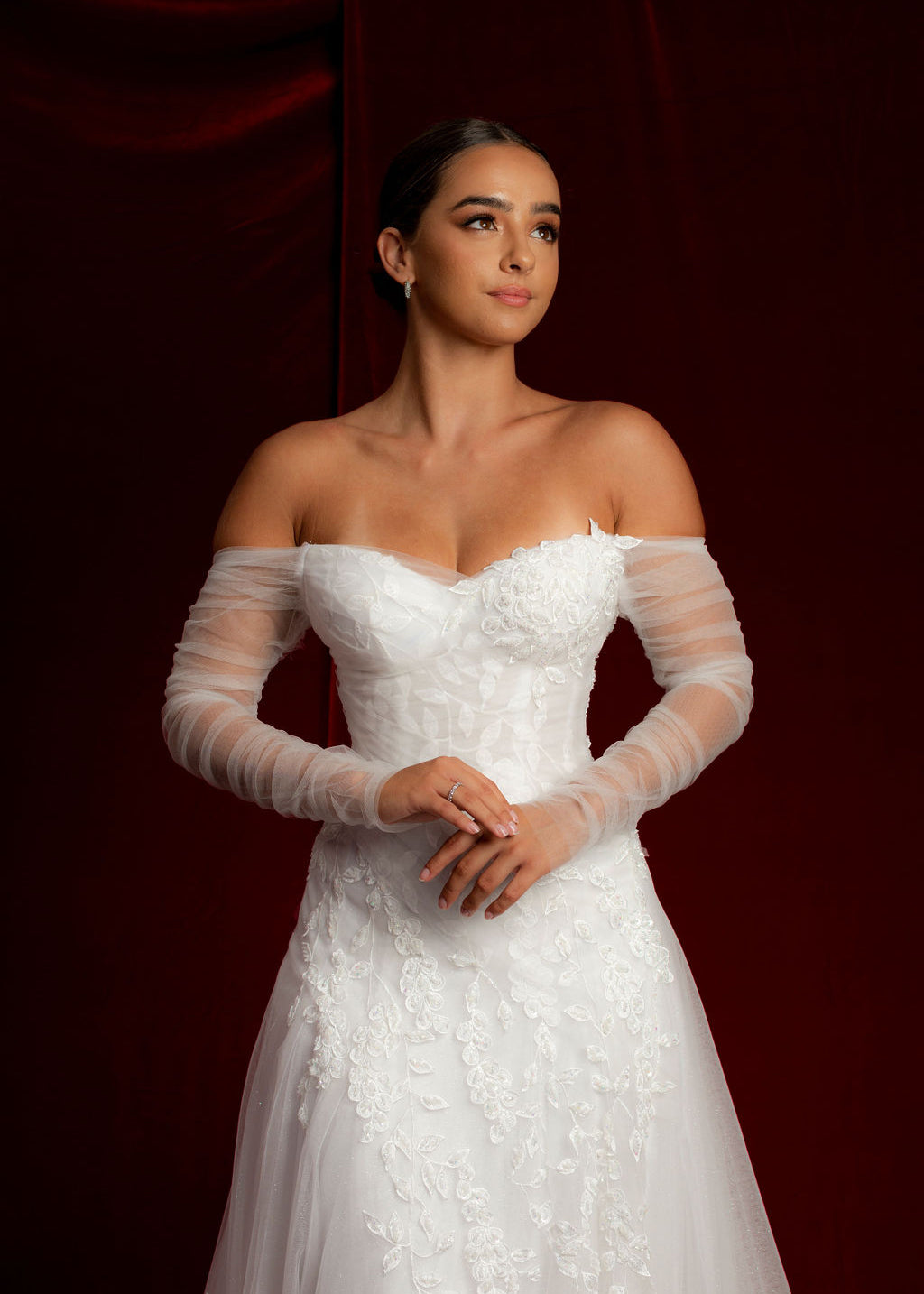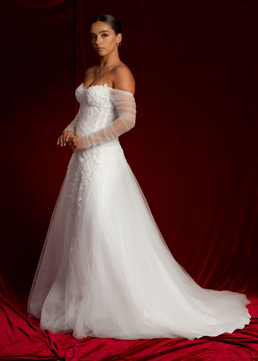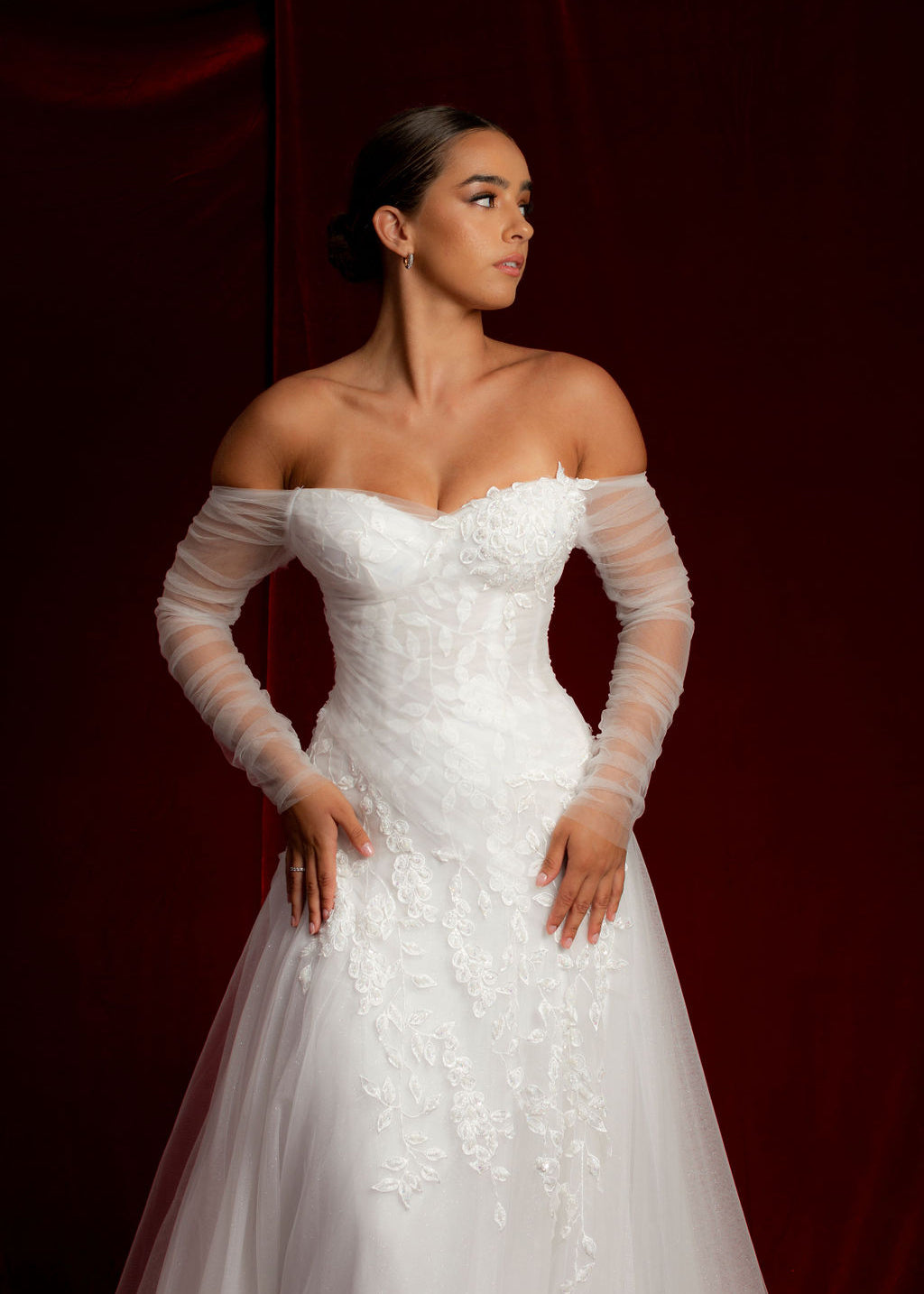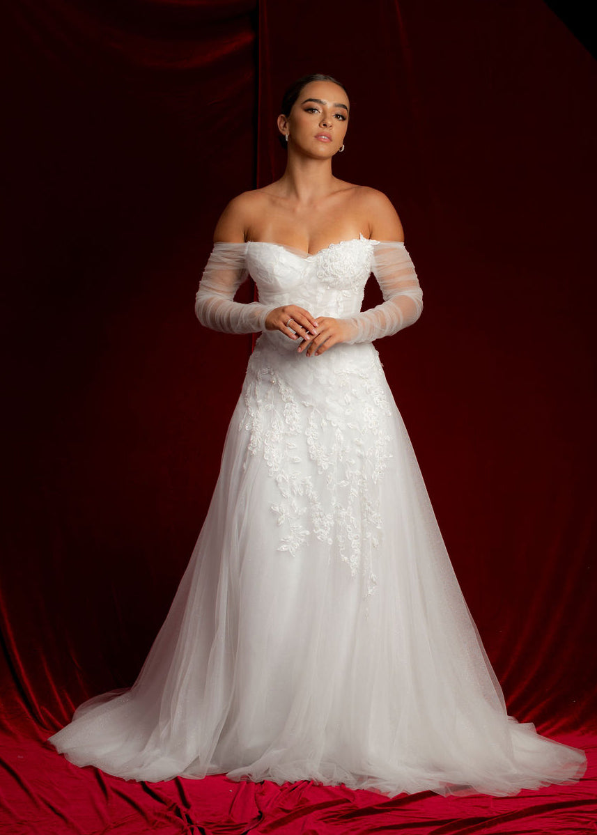 "Orla" features off-the-shoulder sleeves adorned with delicate floral accents, adding a touch of whimsy and romance to its ethereal charm. This gown offers a dash of daring allure, perfect for the bride who seeks both sophistication and playfulness on her special day.