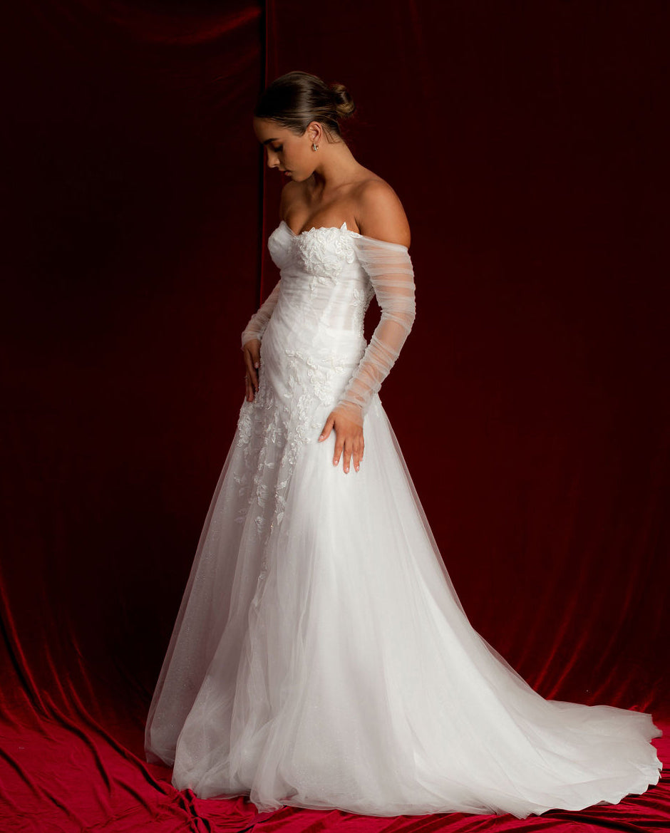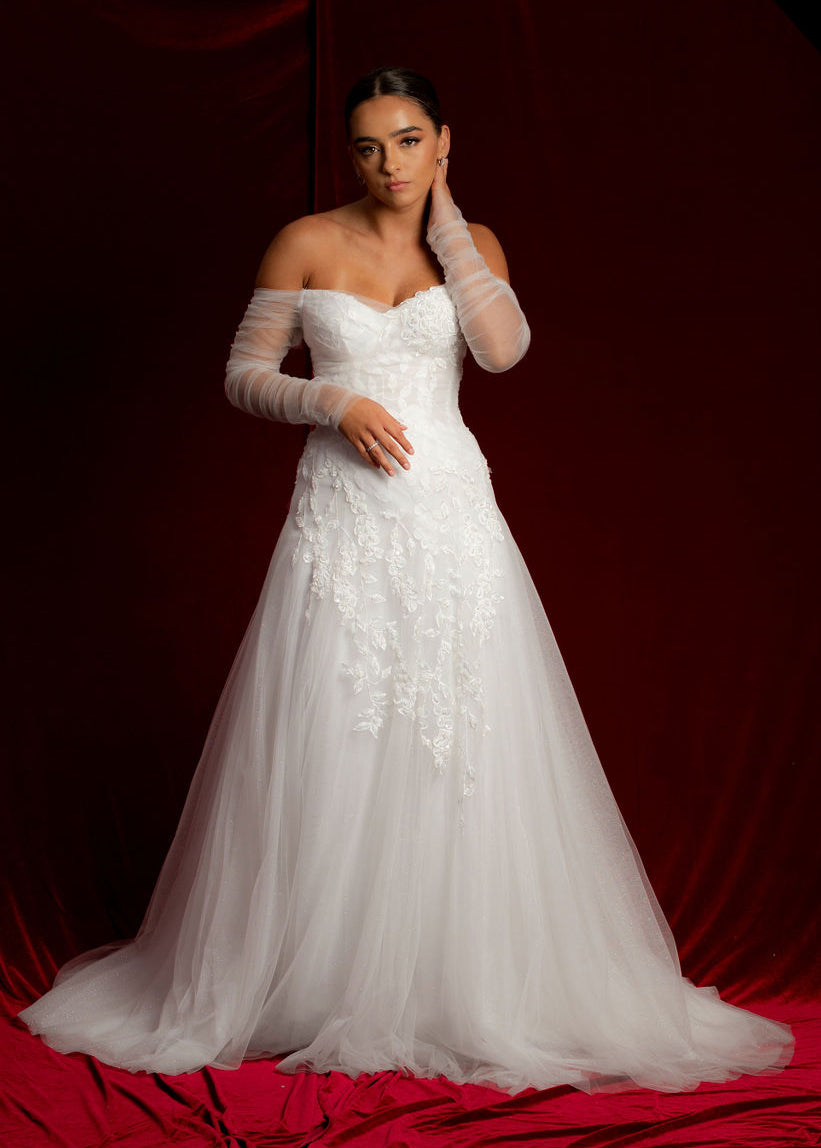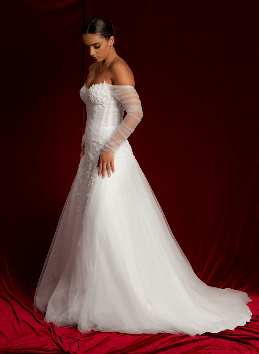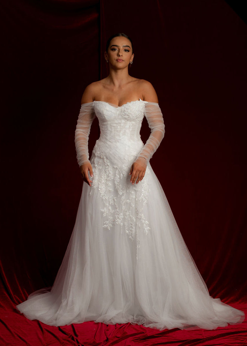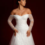 "Orla" features off-the-shoulder sleeves adorned with delicate floral accents, adding a touch of whimsy and romance to its ethereal charm. This gown offers a dash of daring allure, perfect for the bride who seeks both sophistication and playfulness on her special day.