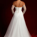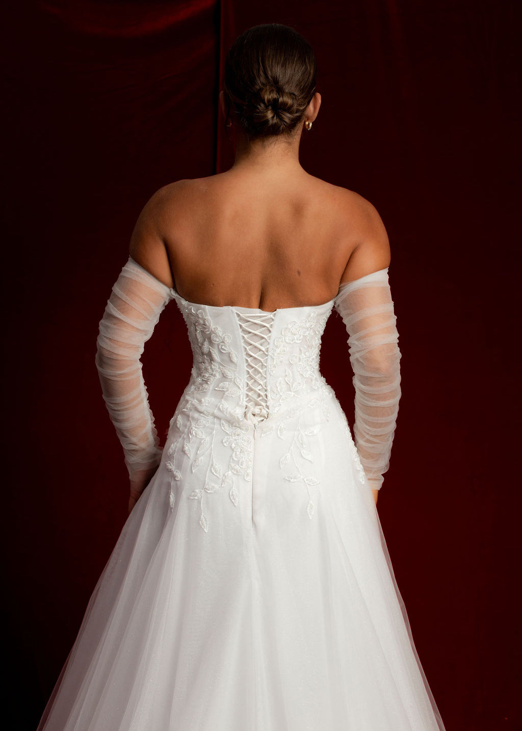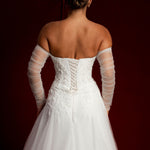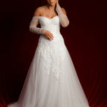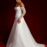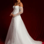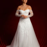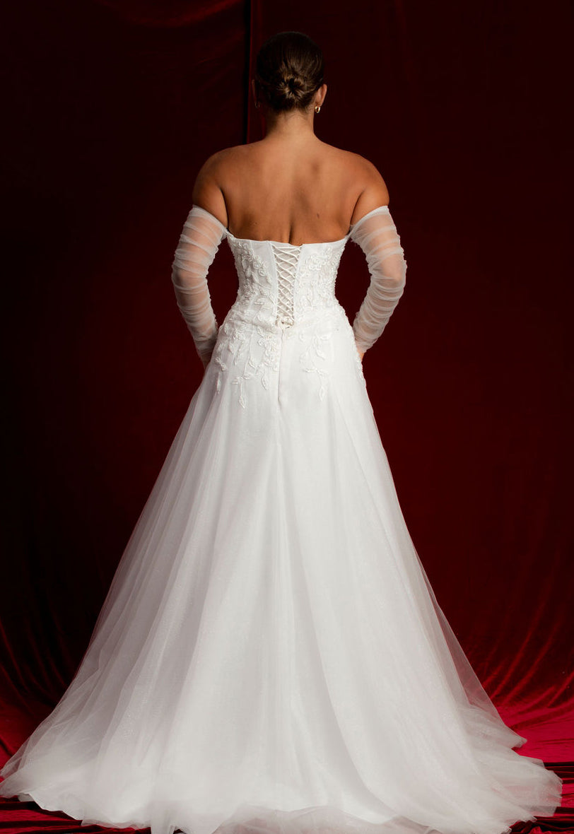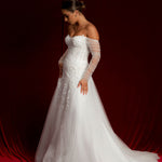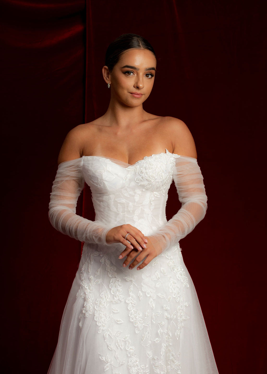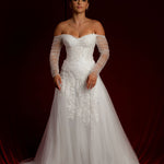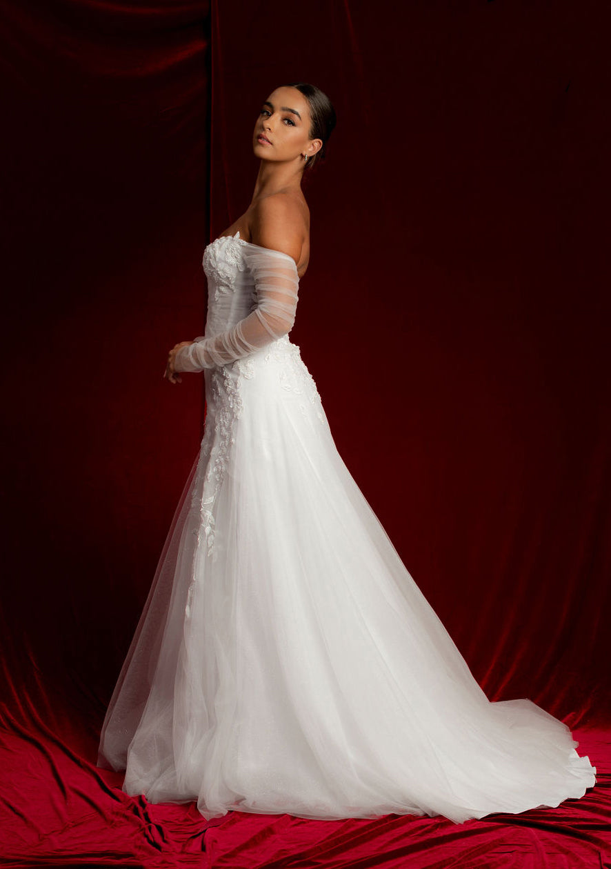 "Orla" features off-the-shoulder sleeves adorned with delicate floral accents, adding a touch of whimsy and romance to its ethereal charm. This gown offers a dash of daring allure, perfect for the bride who seeks both sophistication and playfulness on her special day.