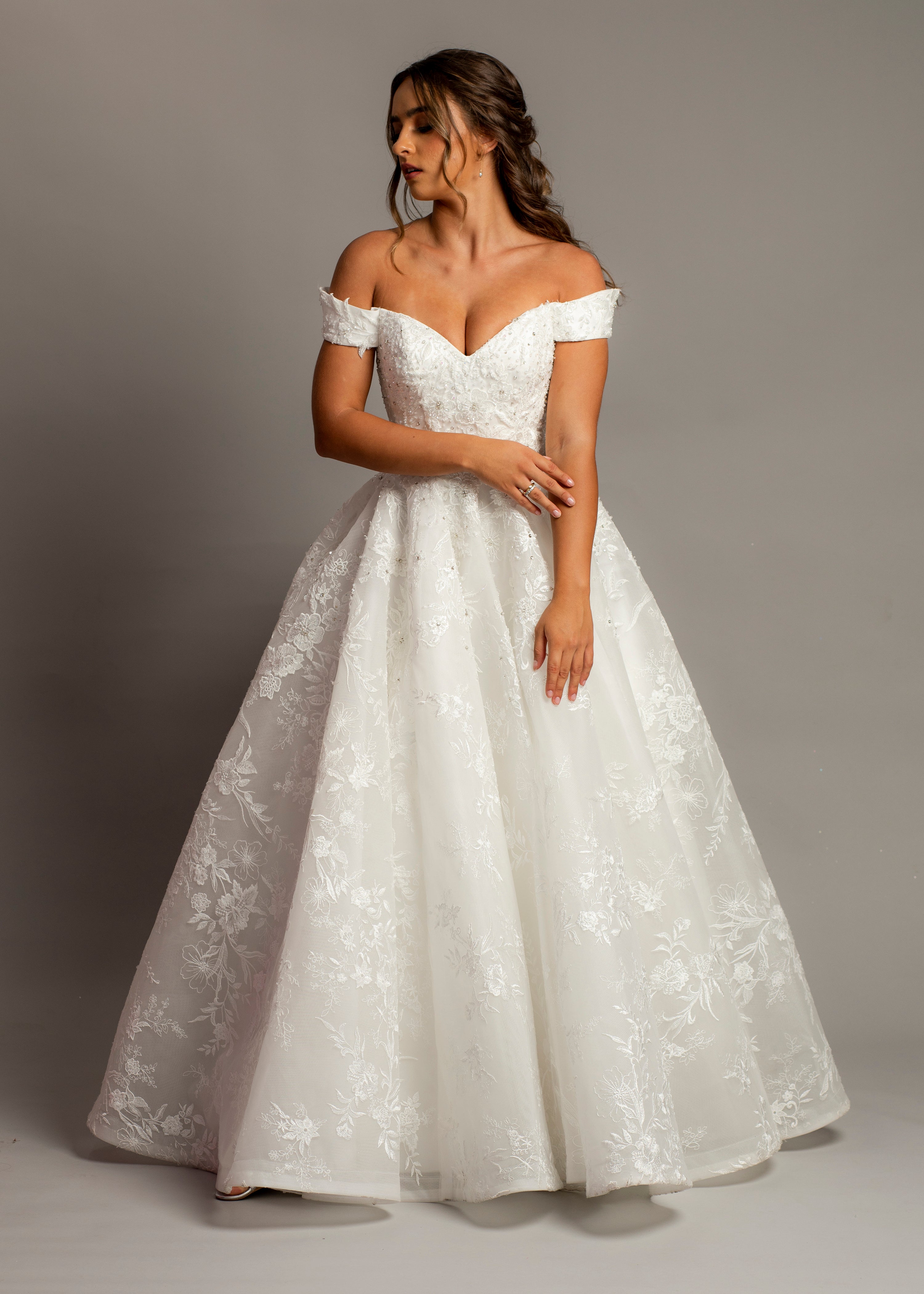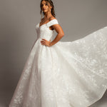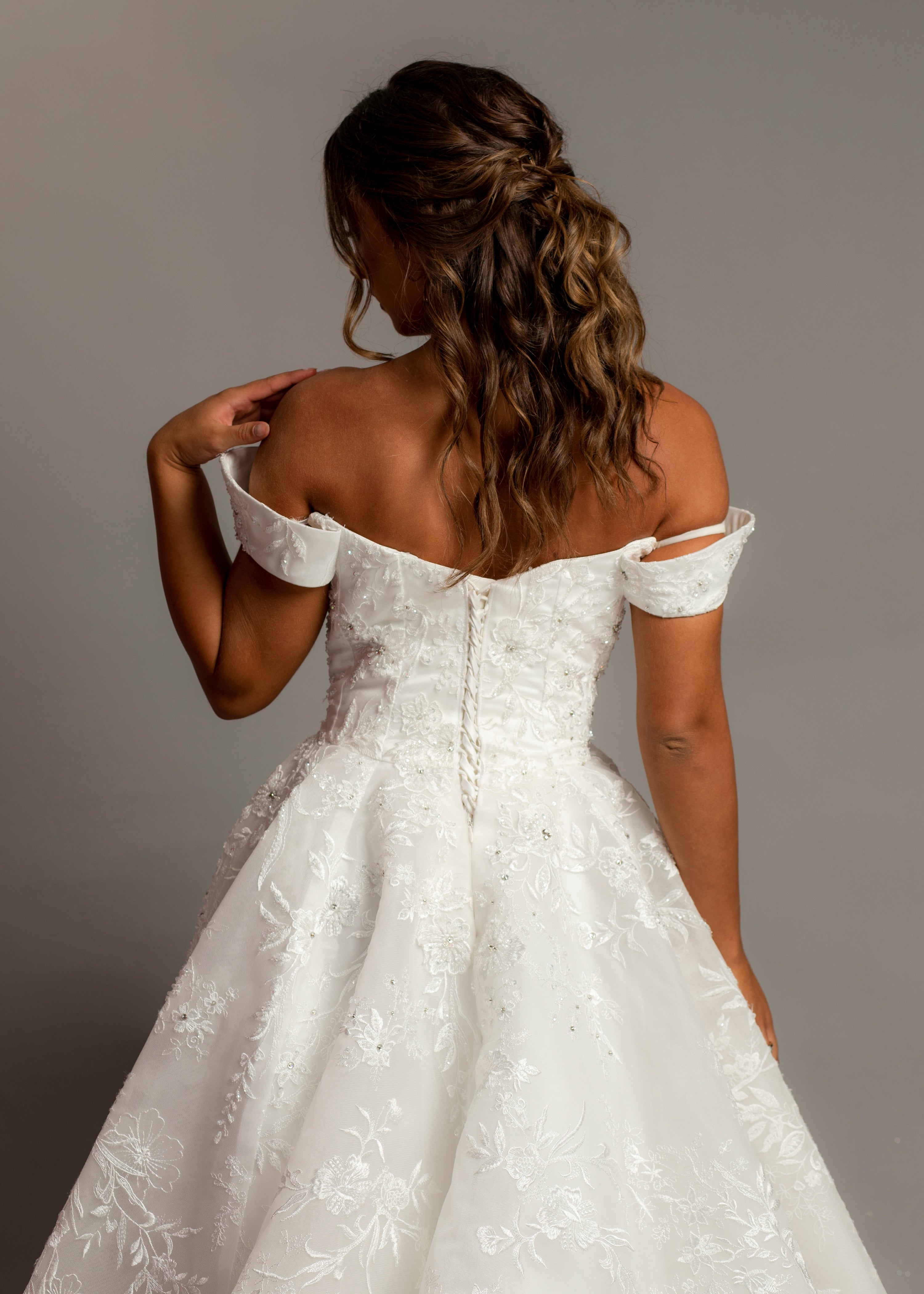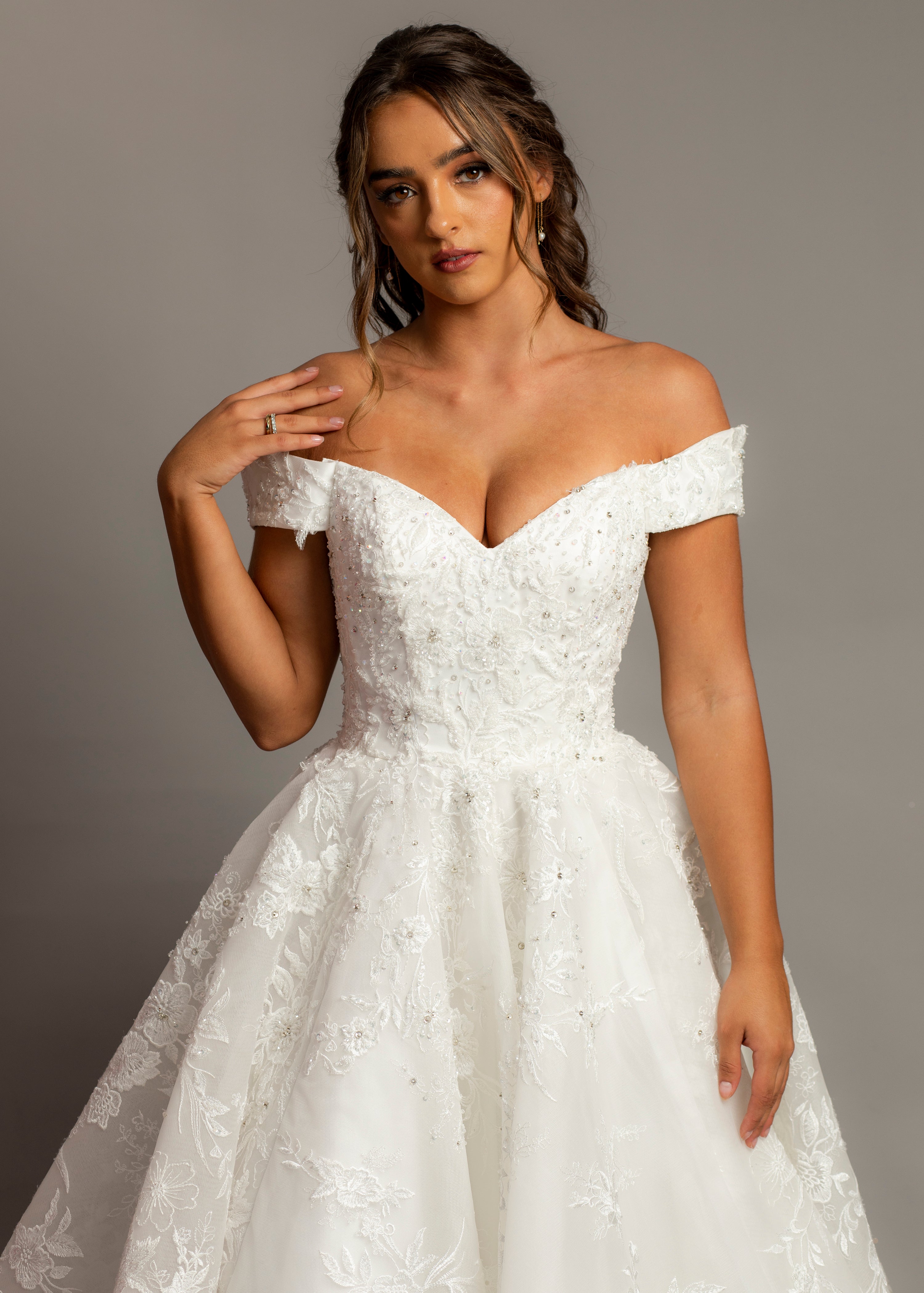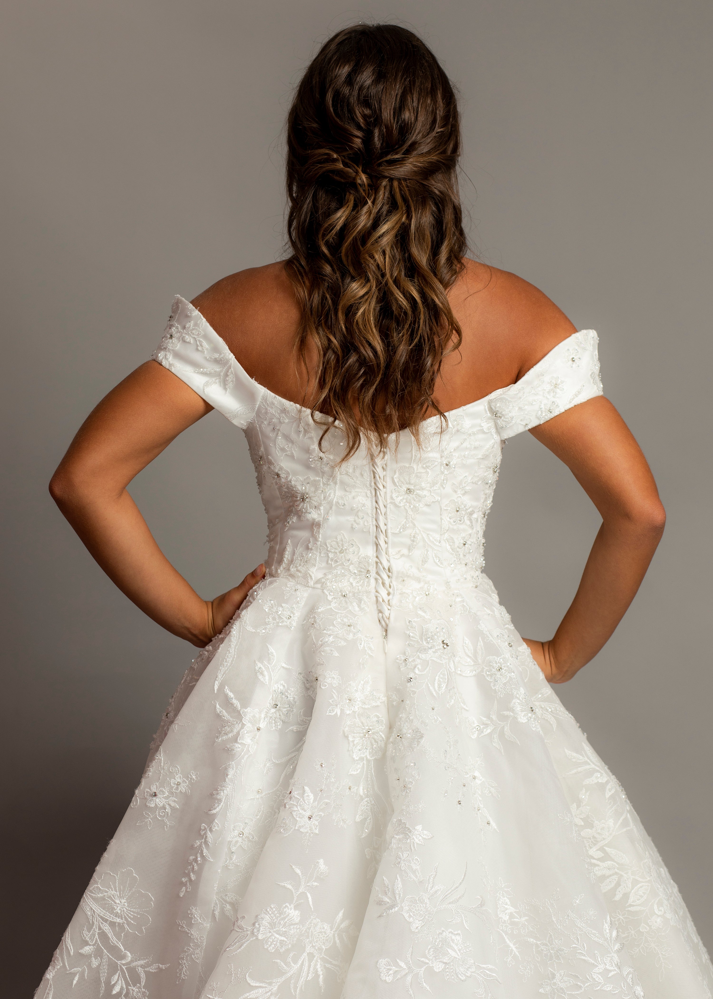 Off the shoulder lace all over ballgown wedding dress with a corset back for hire
