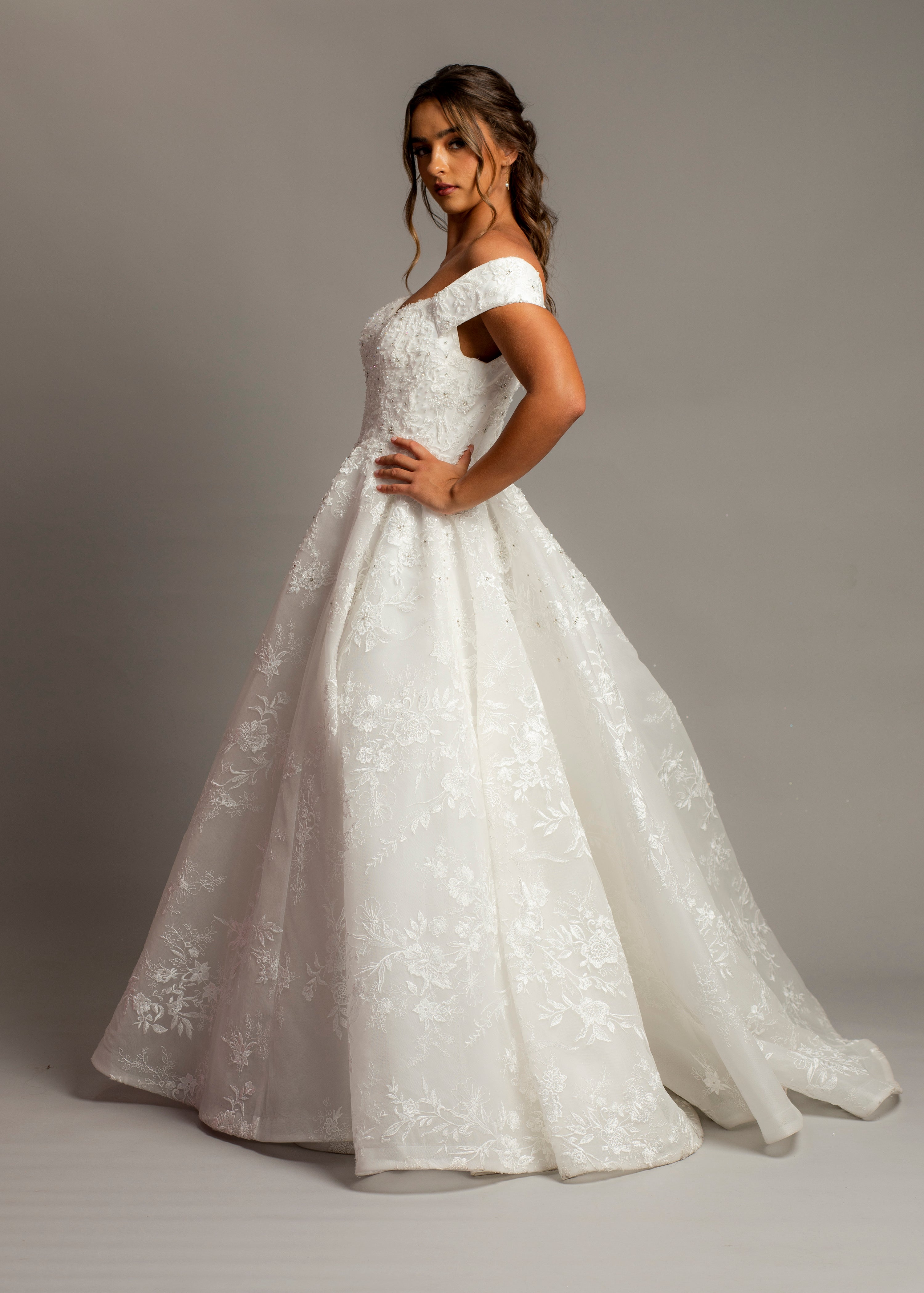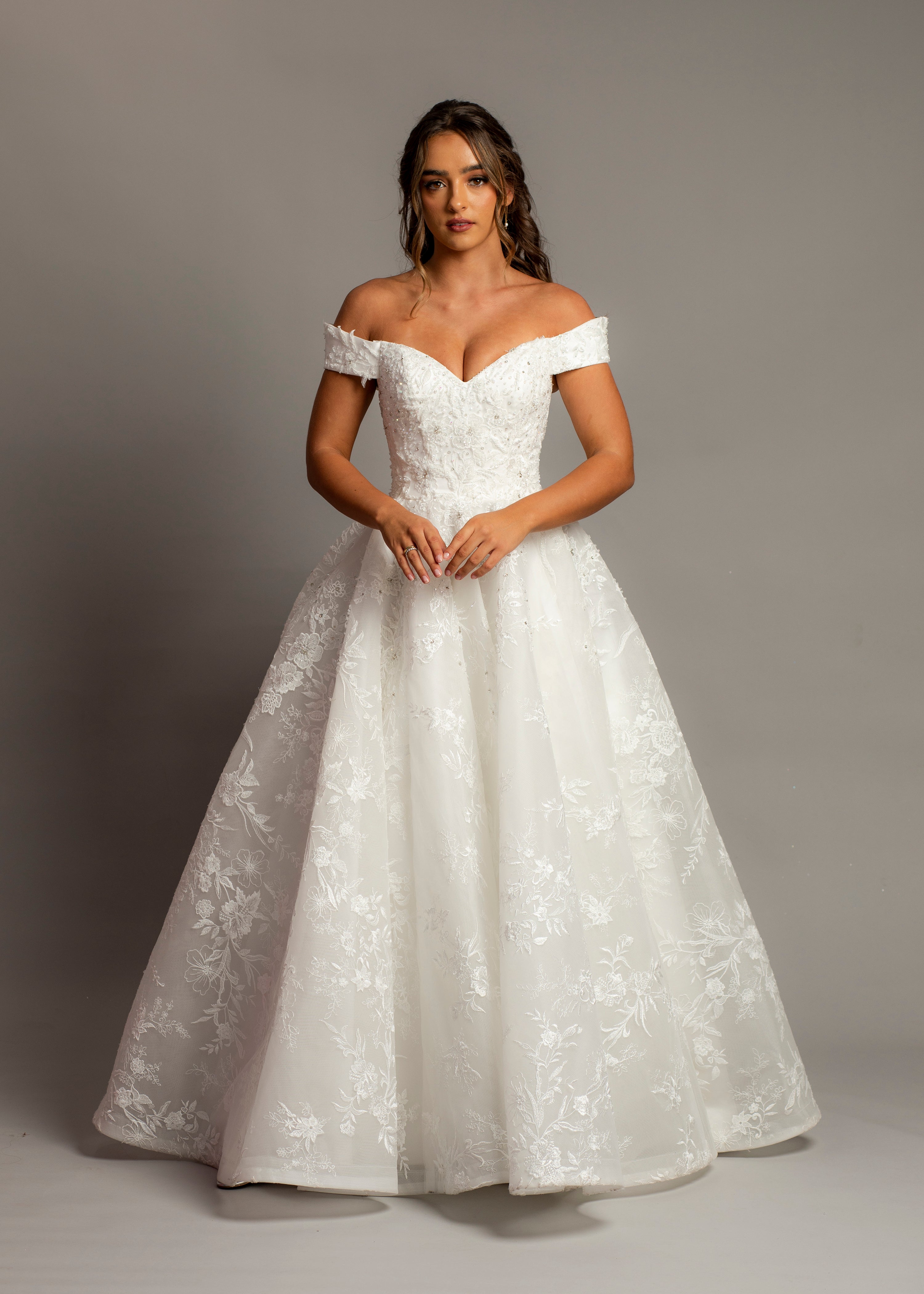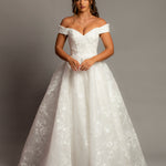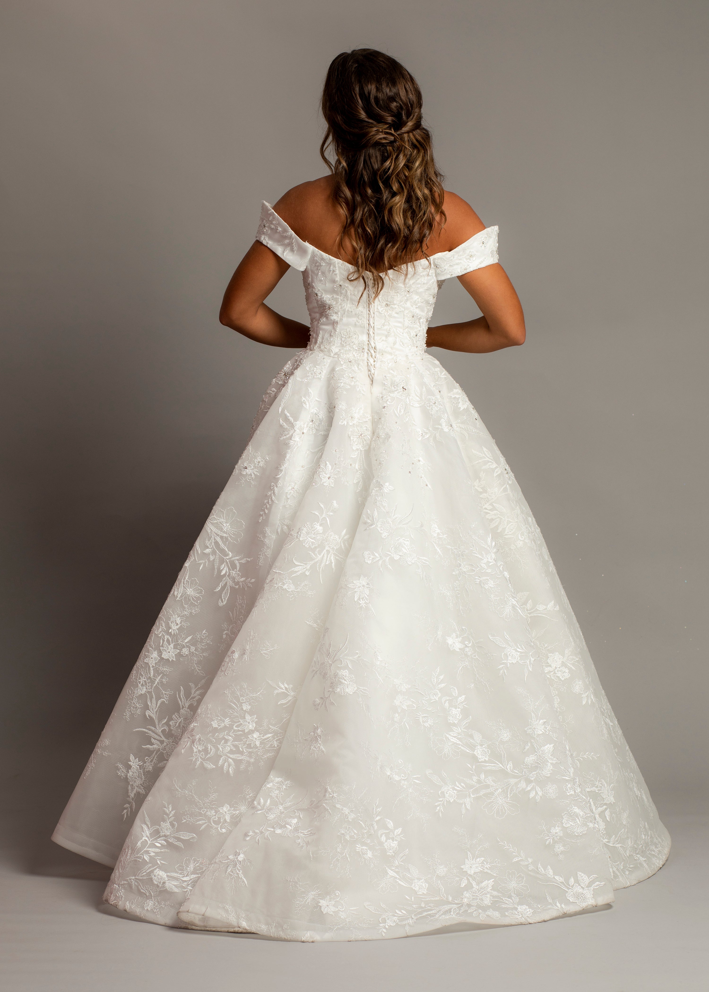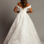 Off the shoulder lace all over ballgown wedding dress with a corset back for hire