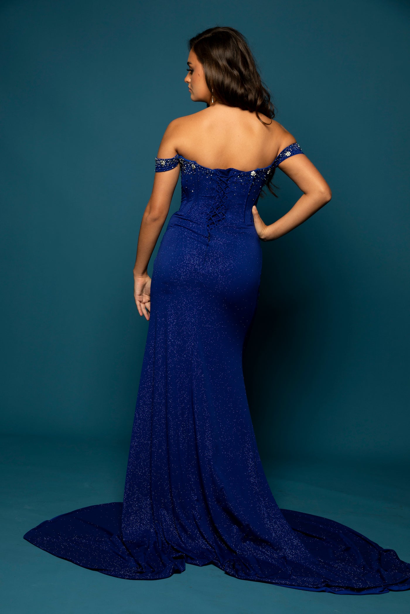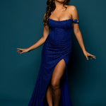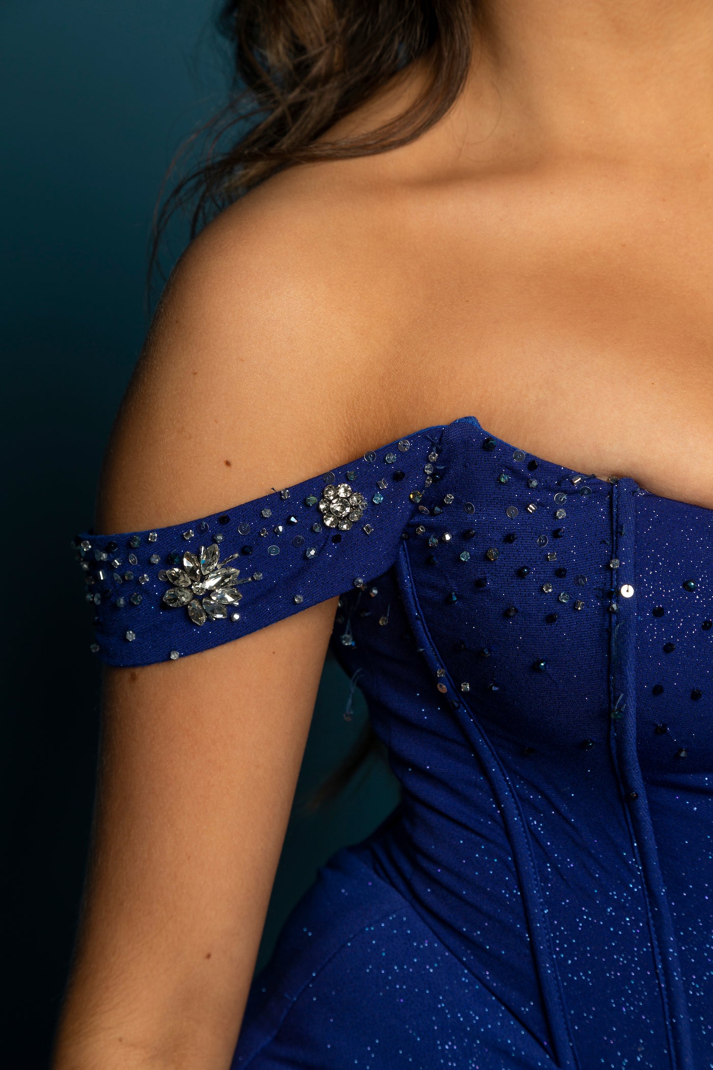 Sparkling jersey royal blue column shaped dress with crescent moon neckline and high slit