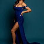 - High quality jersey royal blue dress with a high slit and ruching to create a little drama for the formal girl to show off her night.