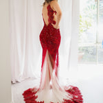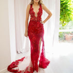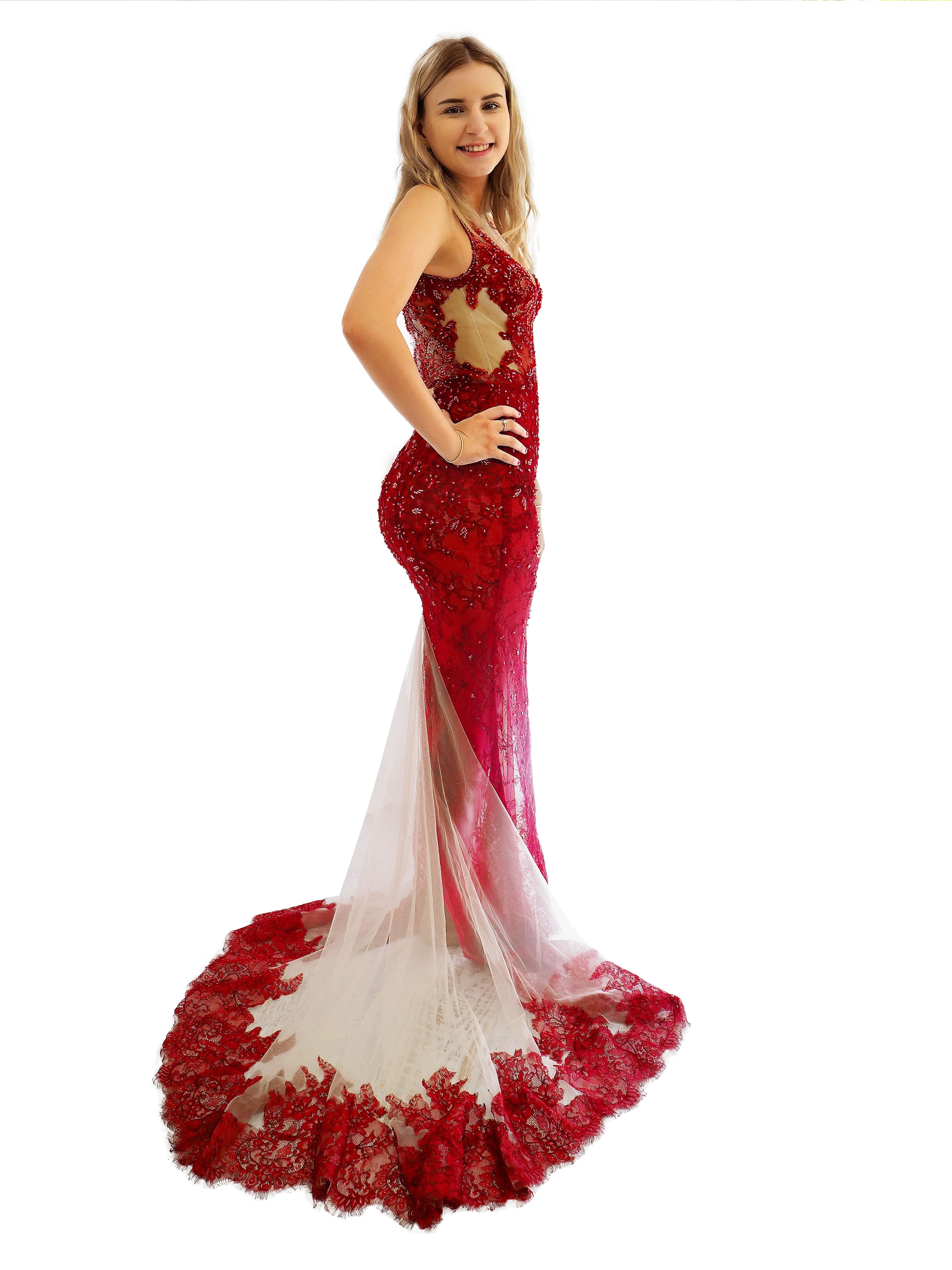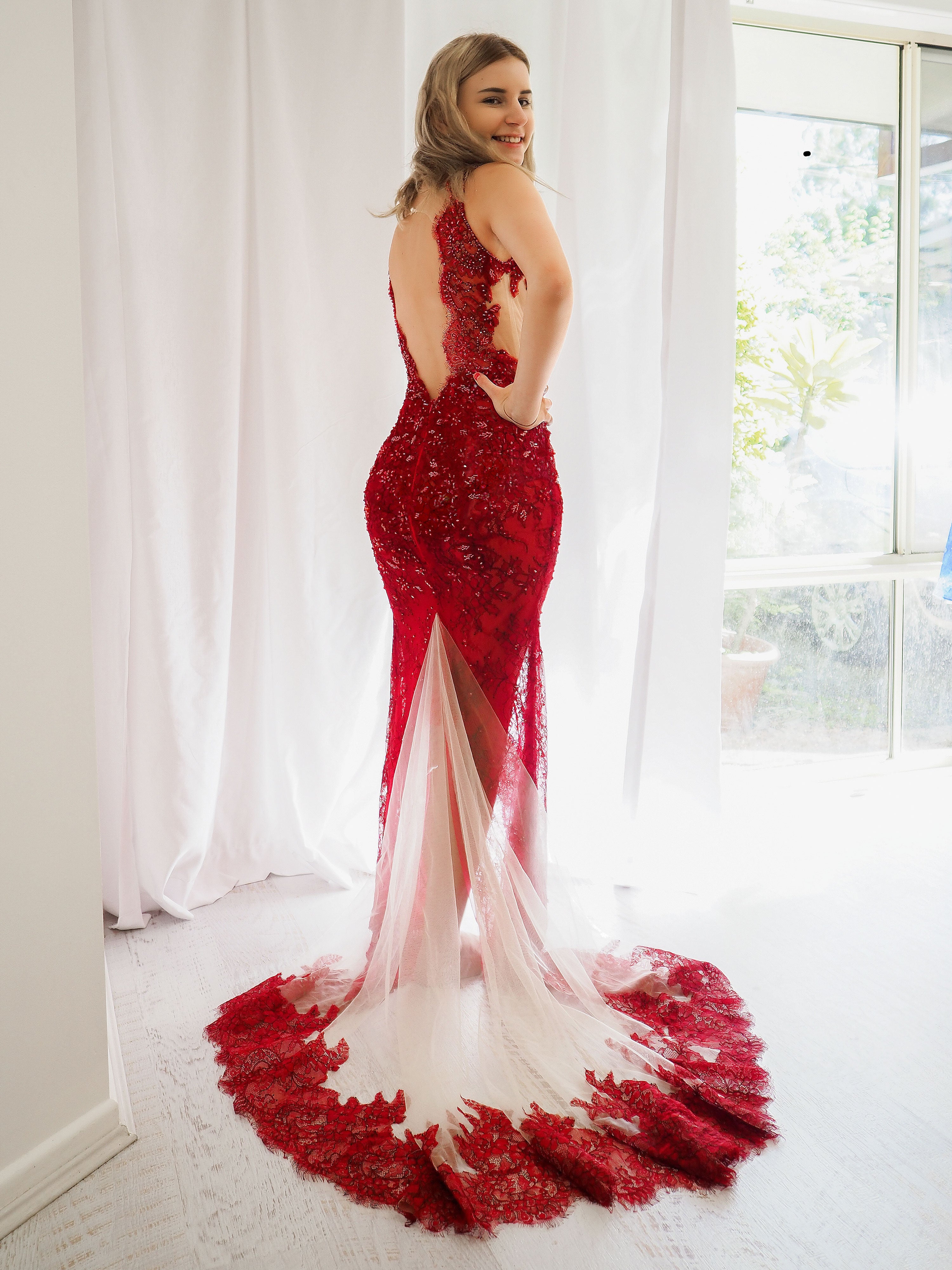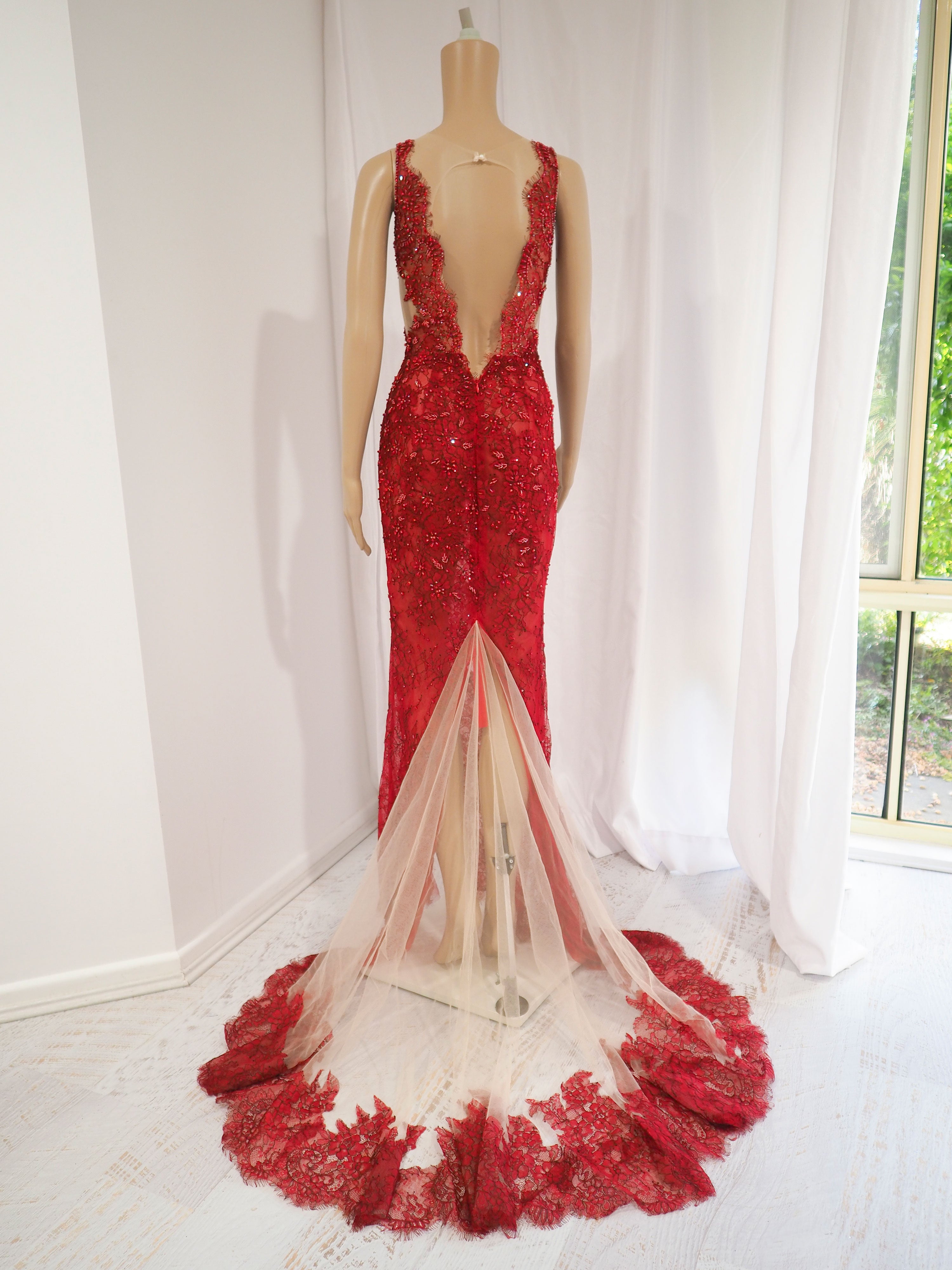 Experience the exquisite craftsmanship of our dark red Priscilla dress. Delicately crafted from high-quality French Chantilly lace, this couture piece features hand-sewn red crystals and beads that create a mesmerizing sparkle under the night sky. The lace is carefully cut and strategically applied to the bodice and skirt, providing a touch of modesty to the wearer. For a seamless look, we recommend wearing nude or similarly hued underwear. This dress is versatile, available in four different colors, and can be customized with a slit and train length of your choice. Please note that the lace pattern may vary due to the availability of fabric, but the overall elegance and sophistication of this dress remain constant. For added comfort, a lining can also be added upon request. Elevate your style with our Priscilla dress.