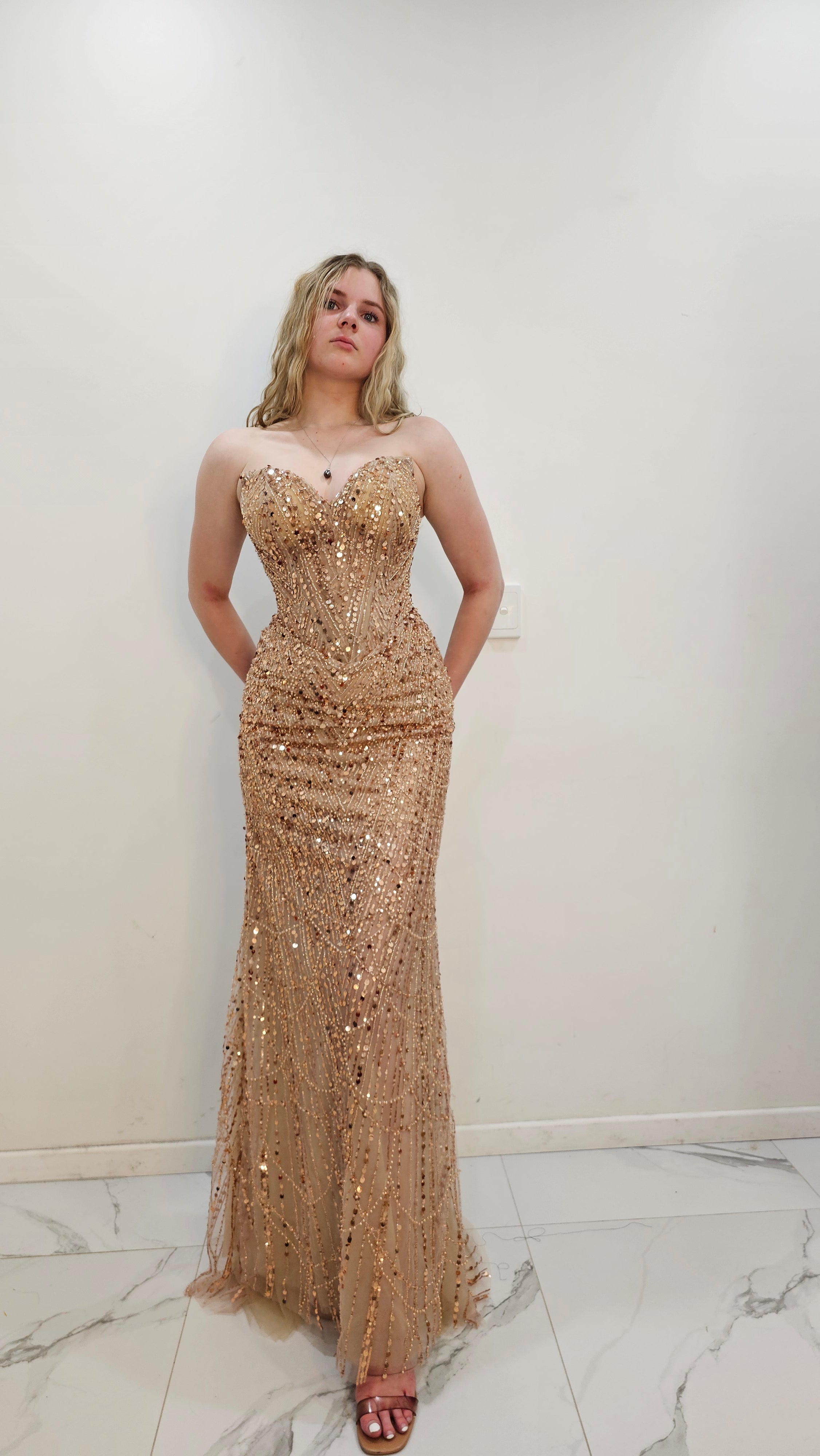 Introducing Artemis — a dress that embodies strength, beauty, and pure radiance. Crafted from luxurious rose gold beaded fabric, Artemis is adorned with delicate daisy sequin flowers from top to hem, catching the light in the most magical way. Intricate dangling lace trails gracefully from the skirt and bodice, adding an ethereal, romantic movement with every step. It’s a gown that glows with elegance while commanding the room with confidence.