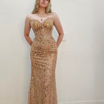 Rose gold beaded Basque waist open back dangling lace v neck corset top mermaid dress