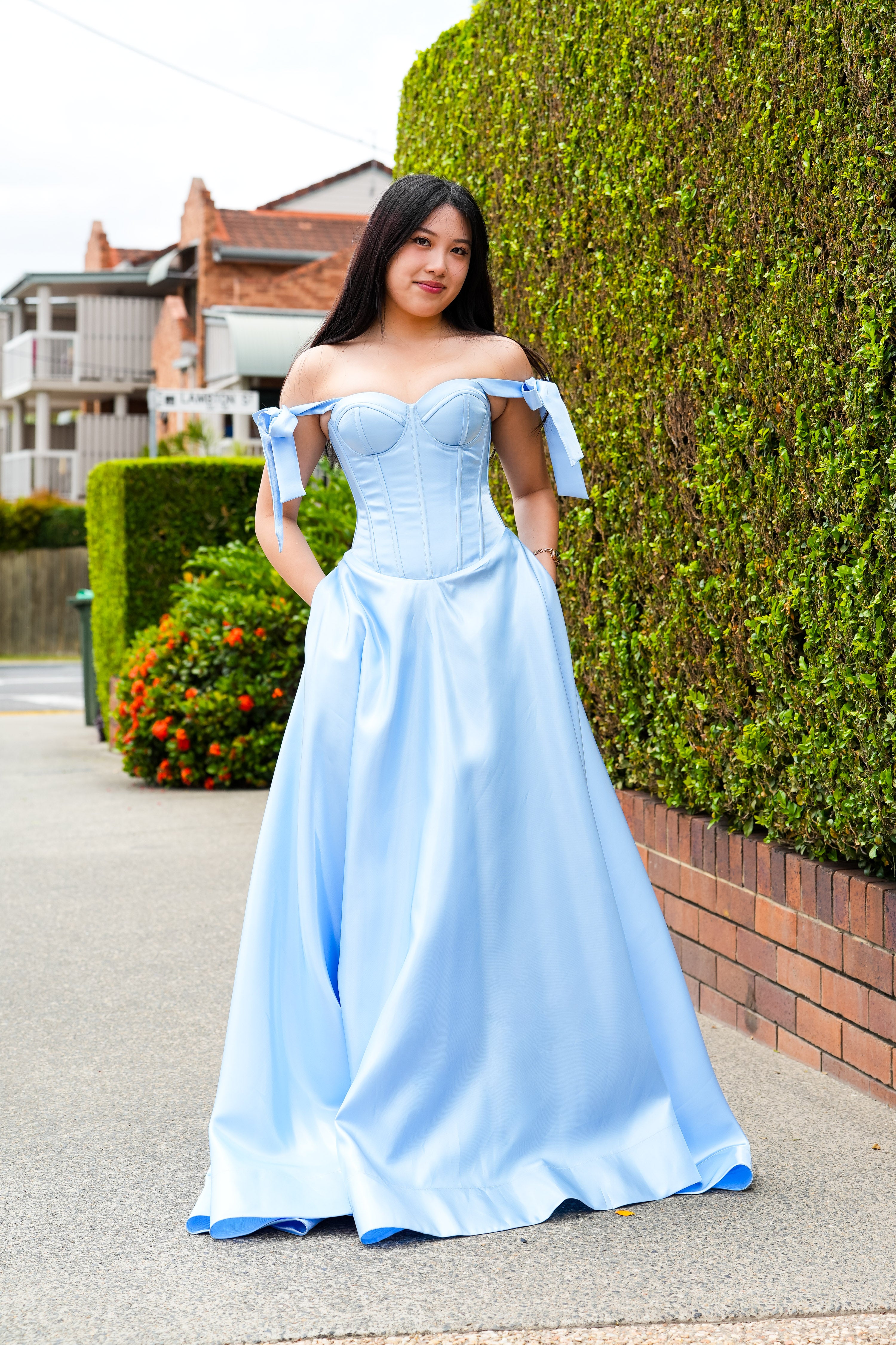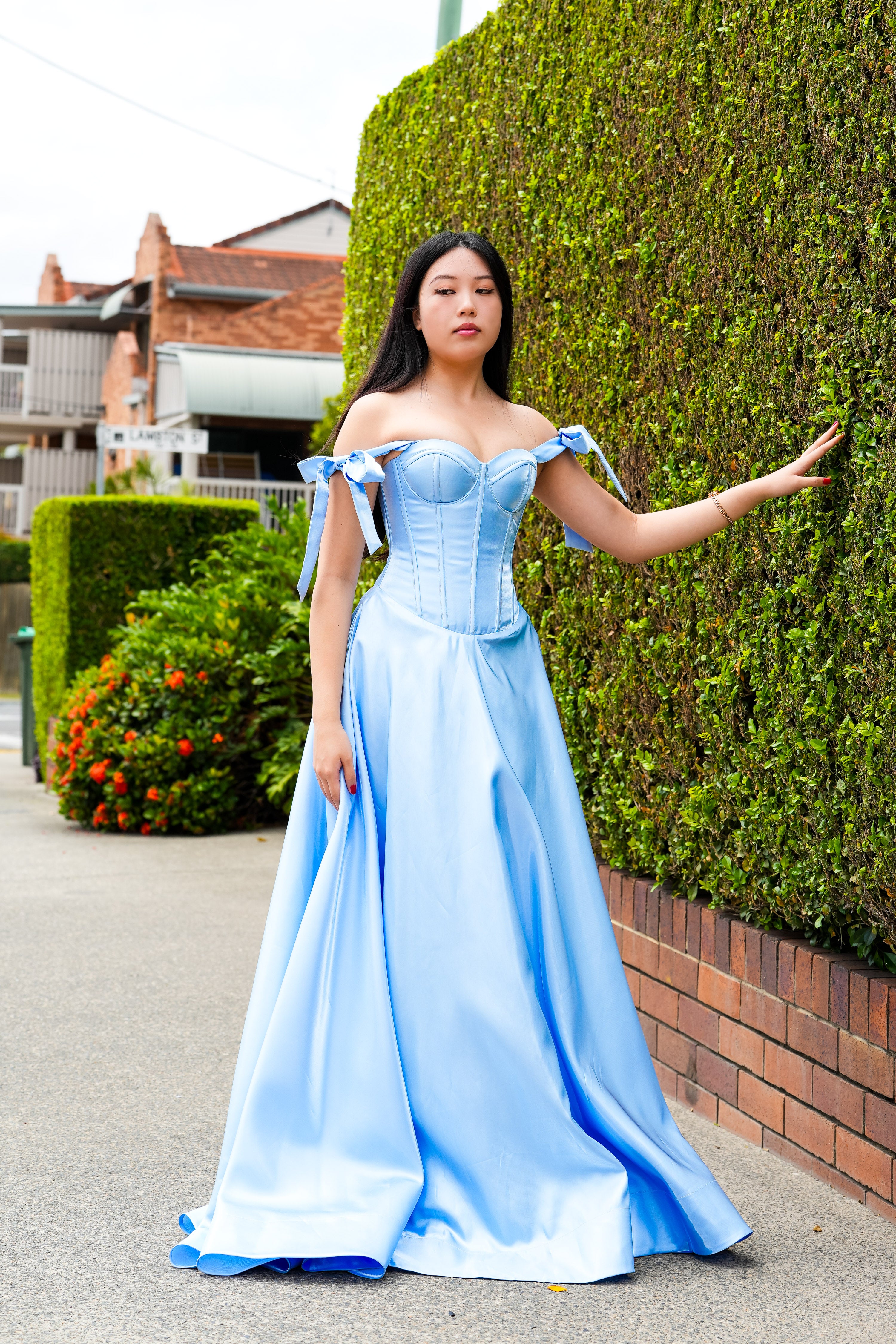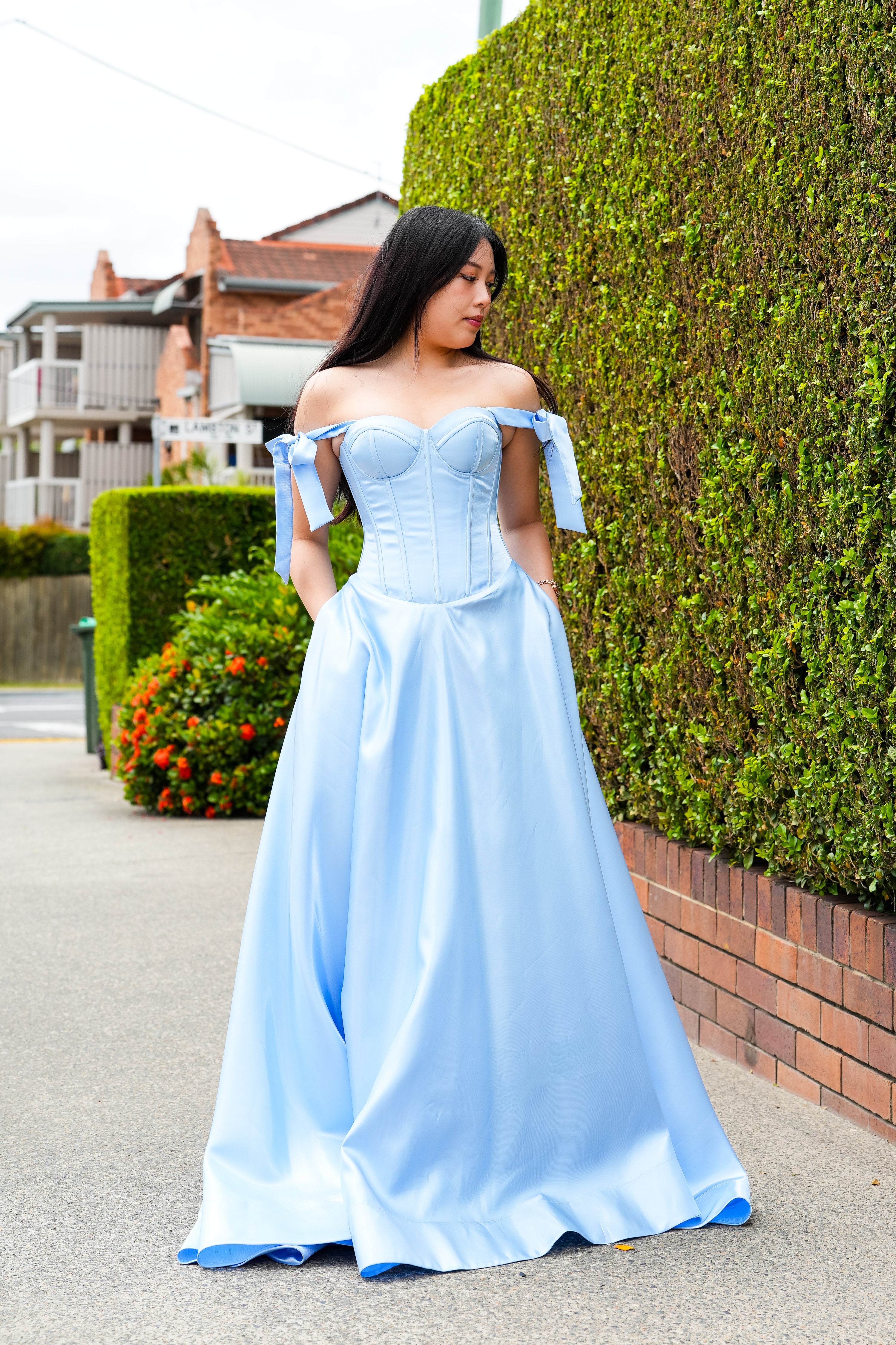 A charming self-tied bow adds a touch of sweetness, designed to be worn on or off the shoulders for versatile styling. Made from luminous water taffeta, Lindella catches the light with every movement, evoking elegance and soft femininity from every angle. Whether for a formal gala, wedding, or high-fashion event, Lindella offers a couture-inspired look that exudes grace and quiet power.