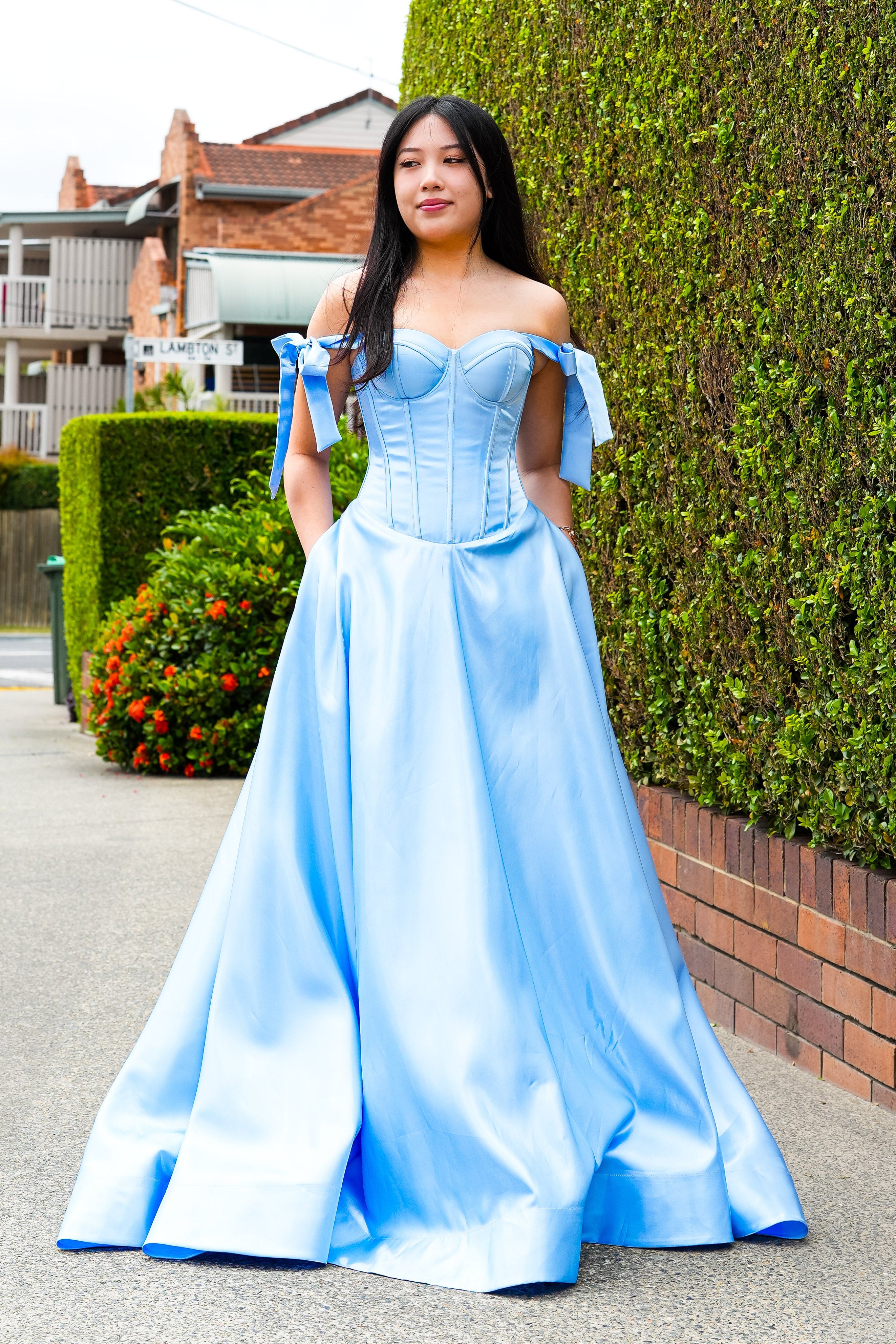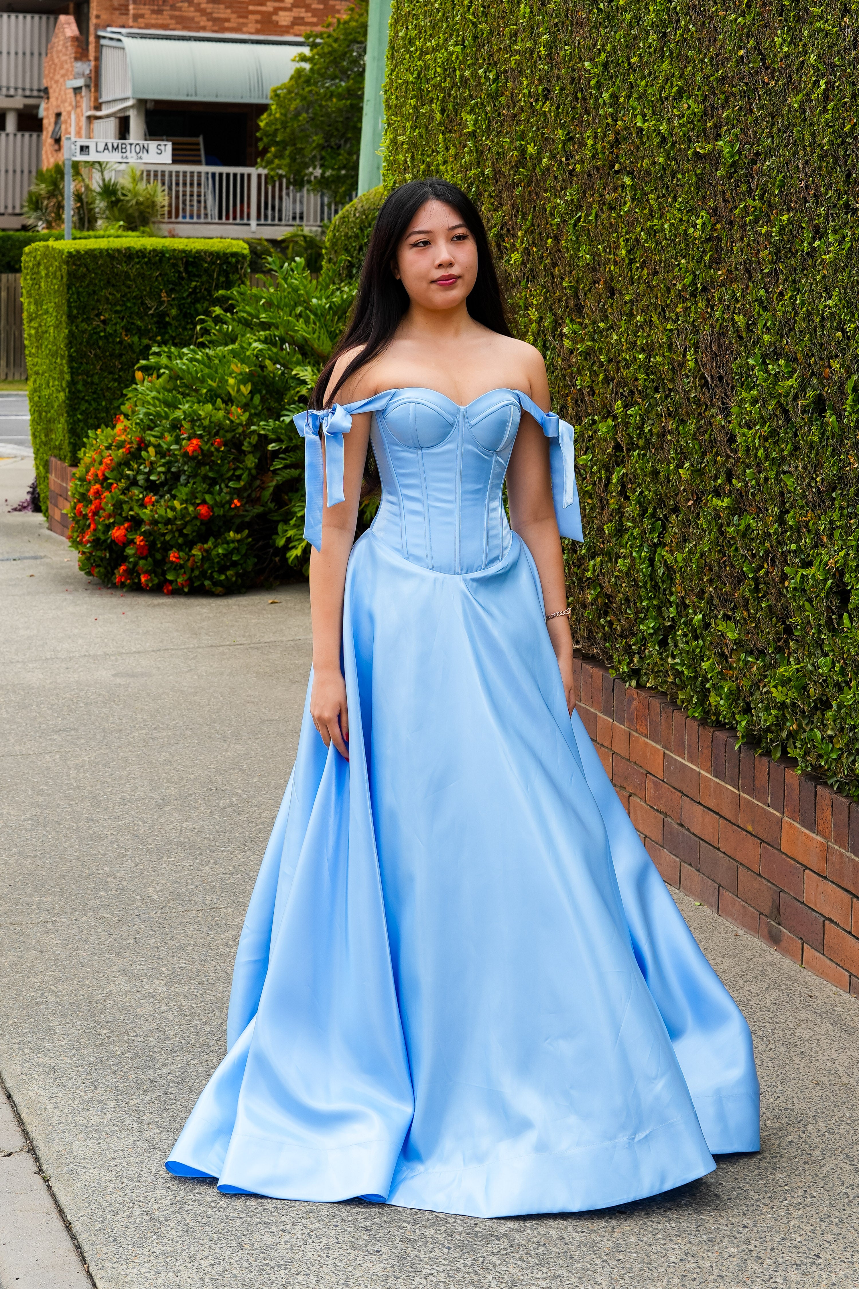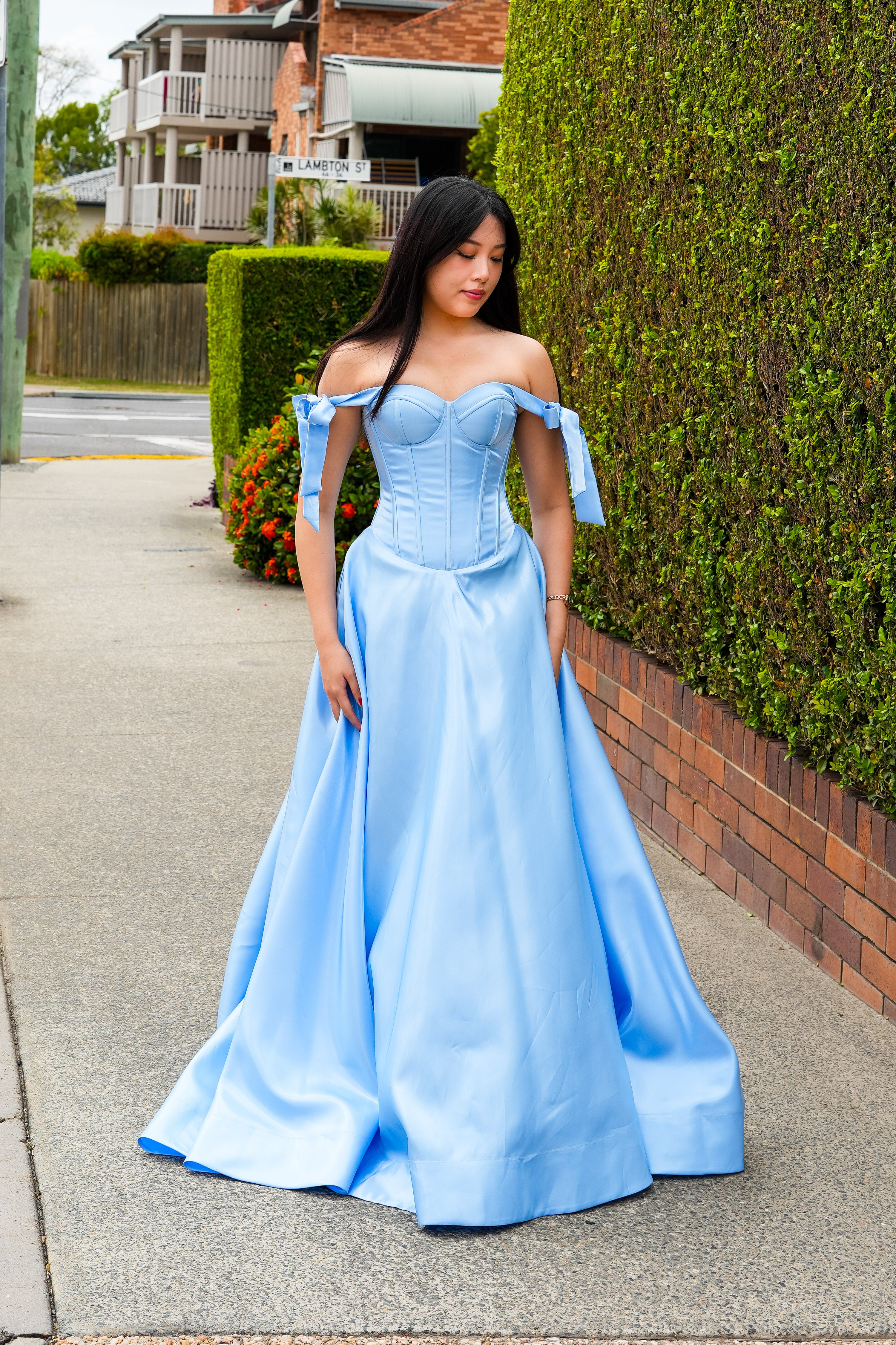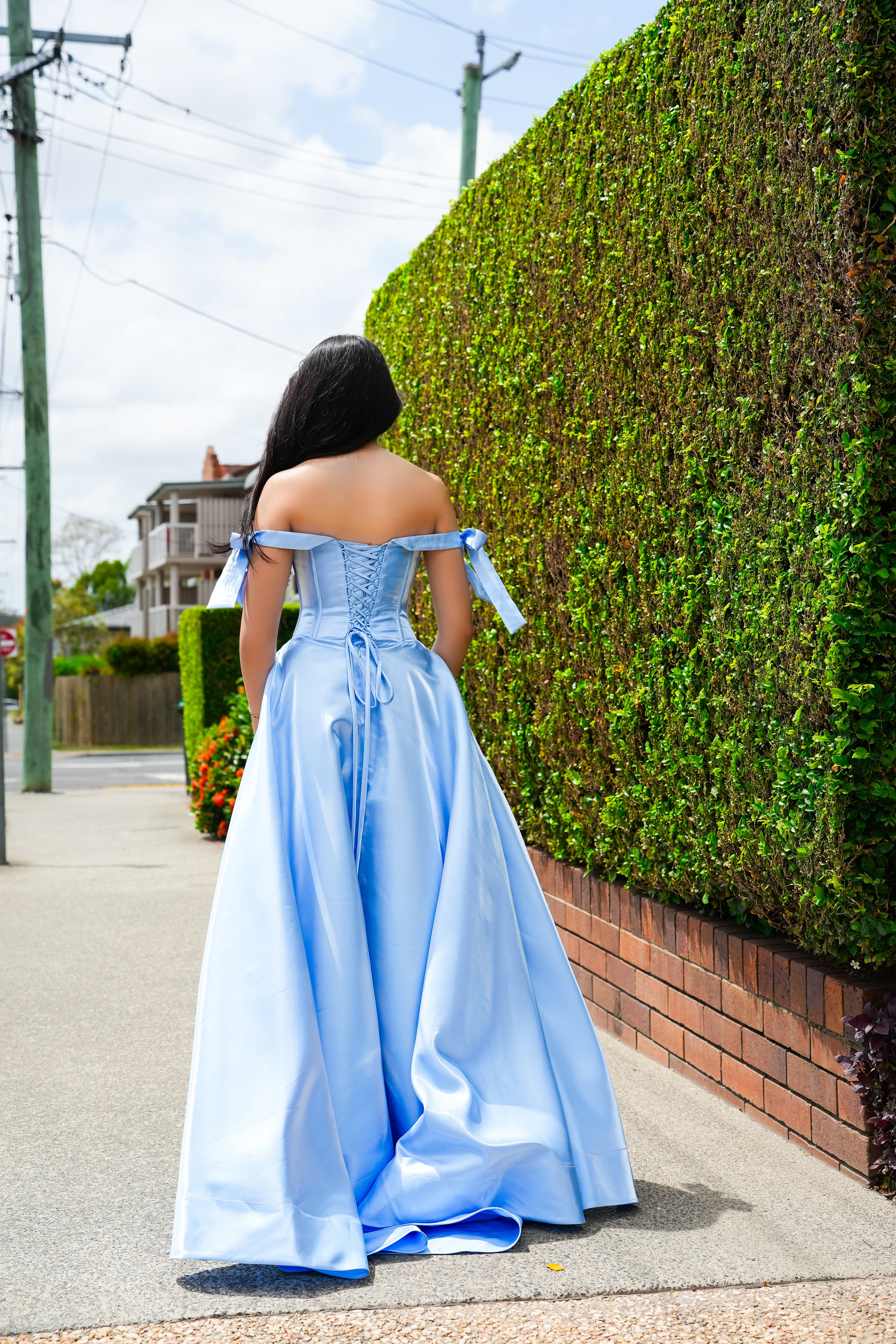 A charming self-tied bow adds a touch of sweetness, designed to be worn on or off the shoulders for versatile styling. Made from luminous water taffeta, Lindella catches the light with every movement, evoking elegance and soft femininity from every angle. Whether for a formal gala, wedding, or high-fashion event, Lindella offers a couture-inspired look that exudes grace and quiet power.
