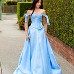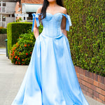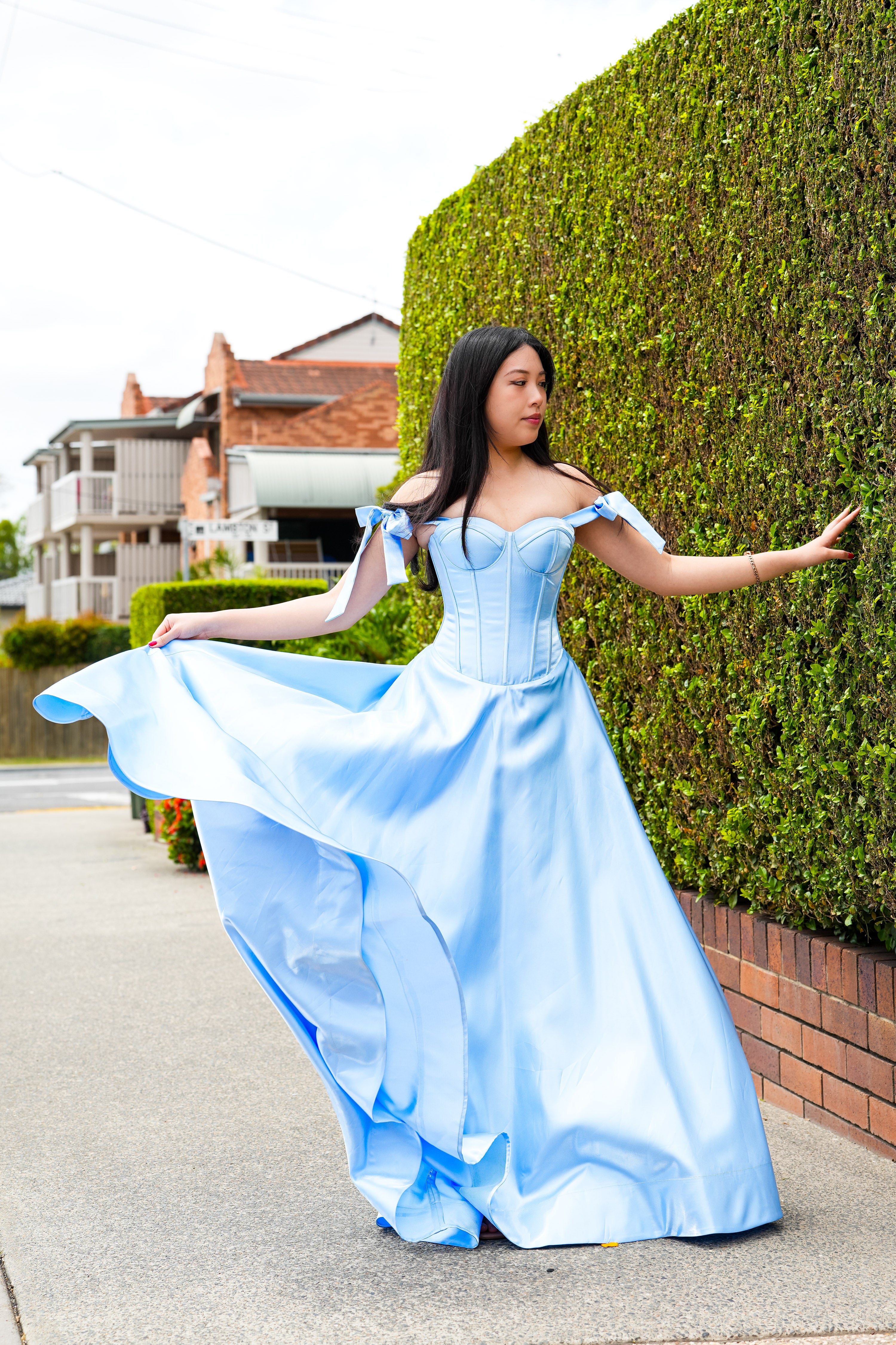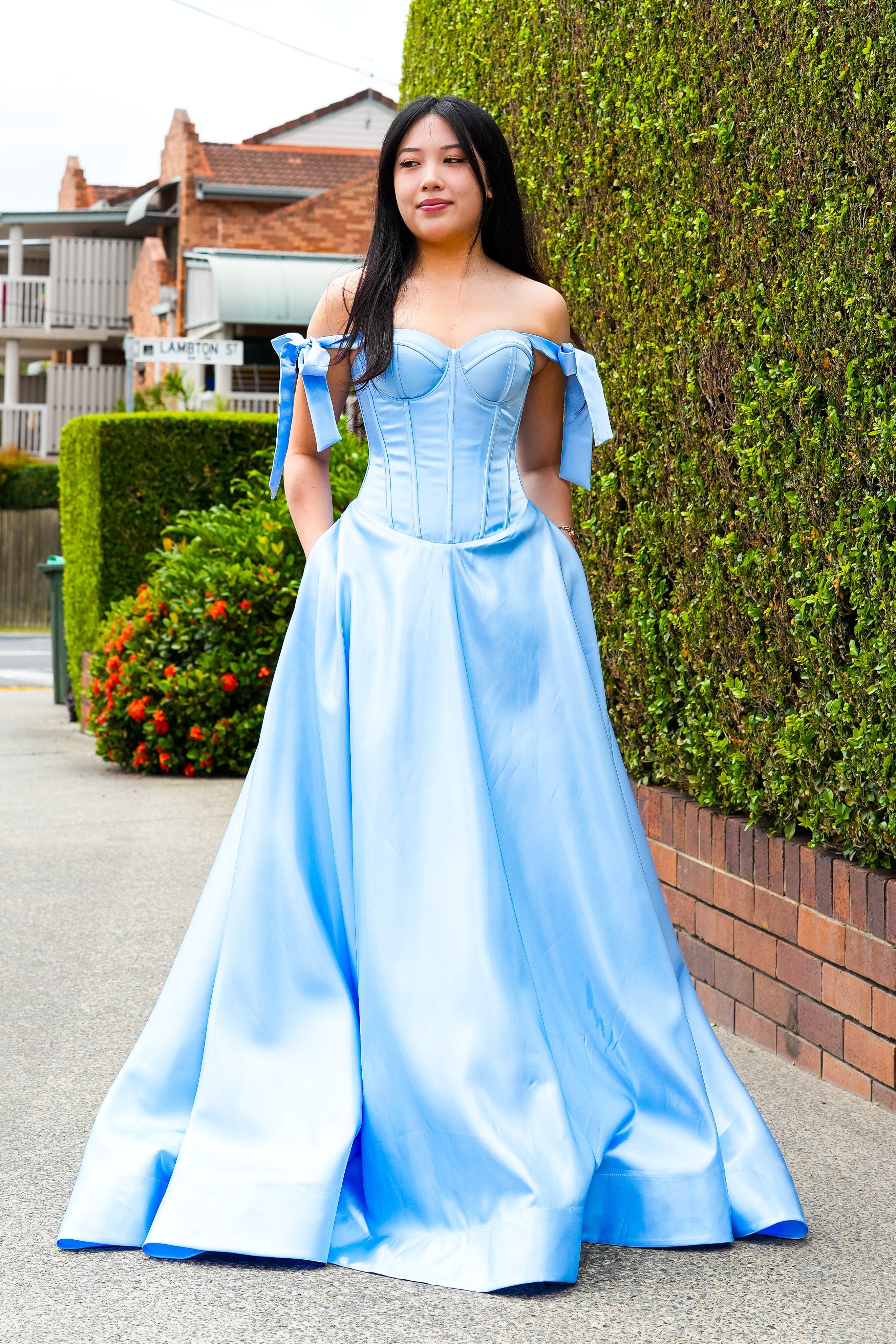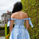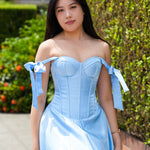 Bustier Cup baby blue liquid taffeta drop waist dress with slit and lace up back