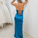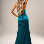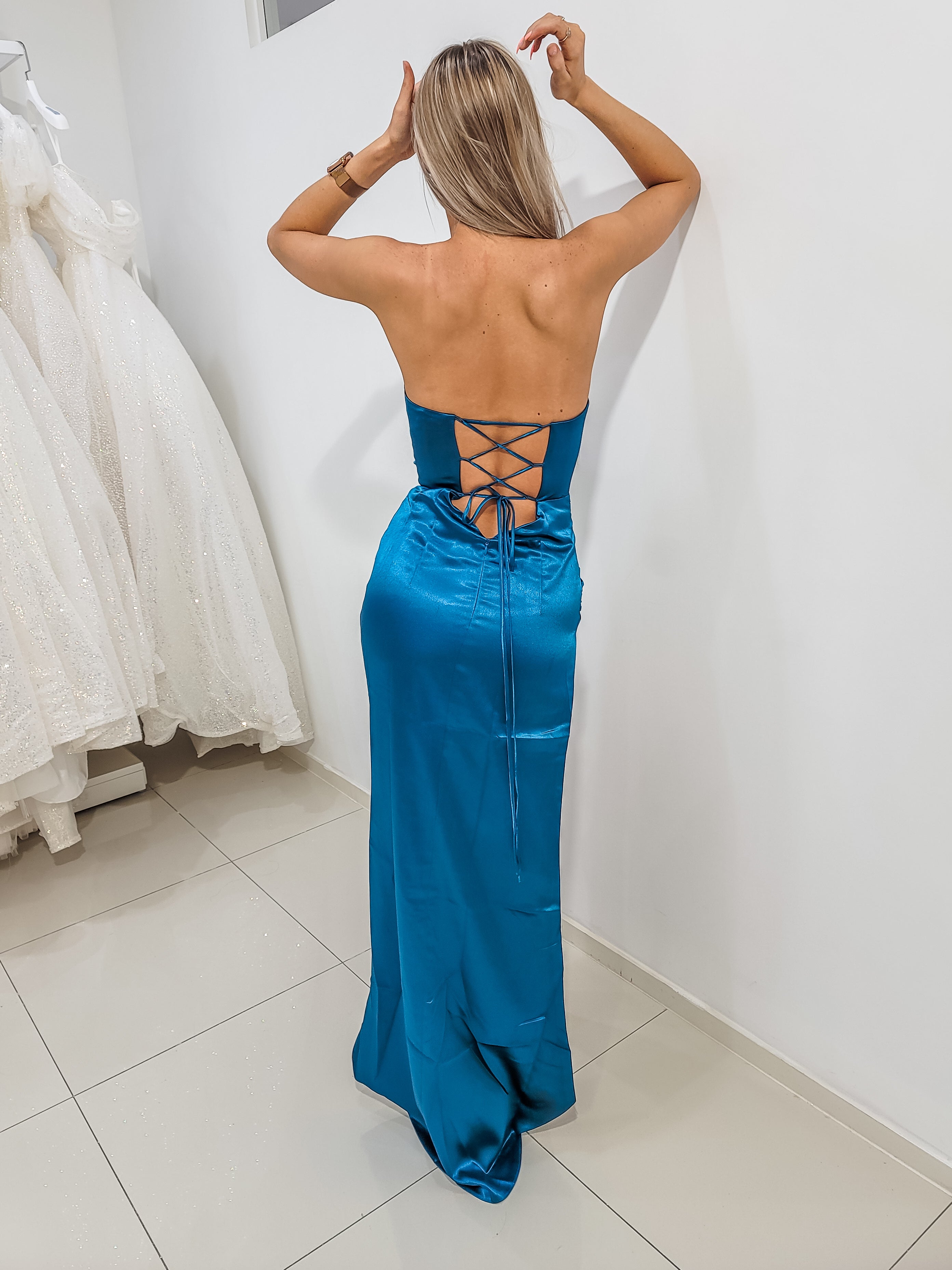 - High quality teal satin material with a high slit and a symmetric pointy neckline mermaid dress to create a sexy formal dress for the night.