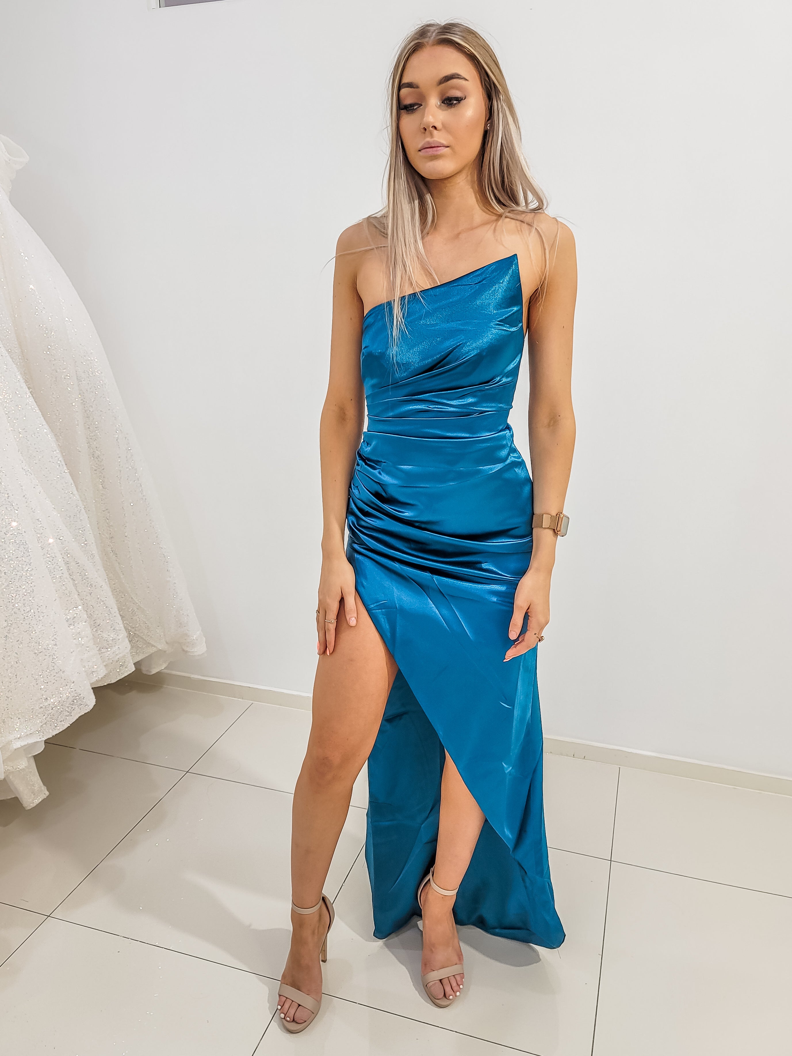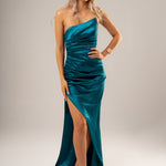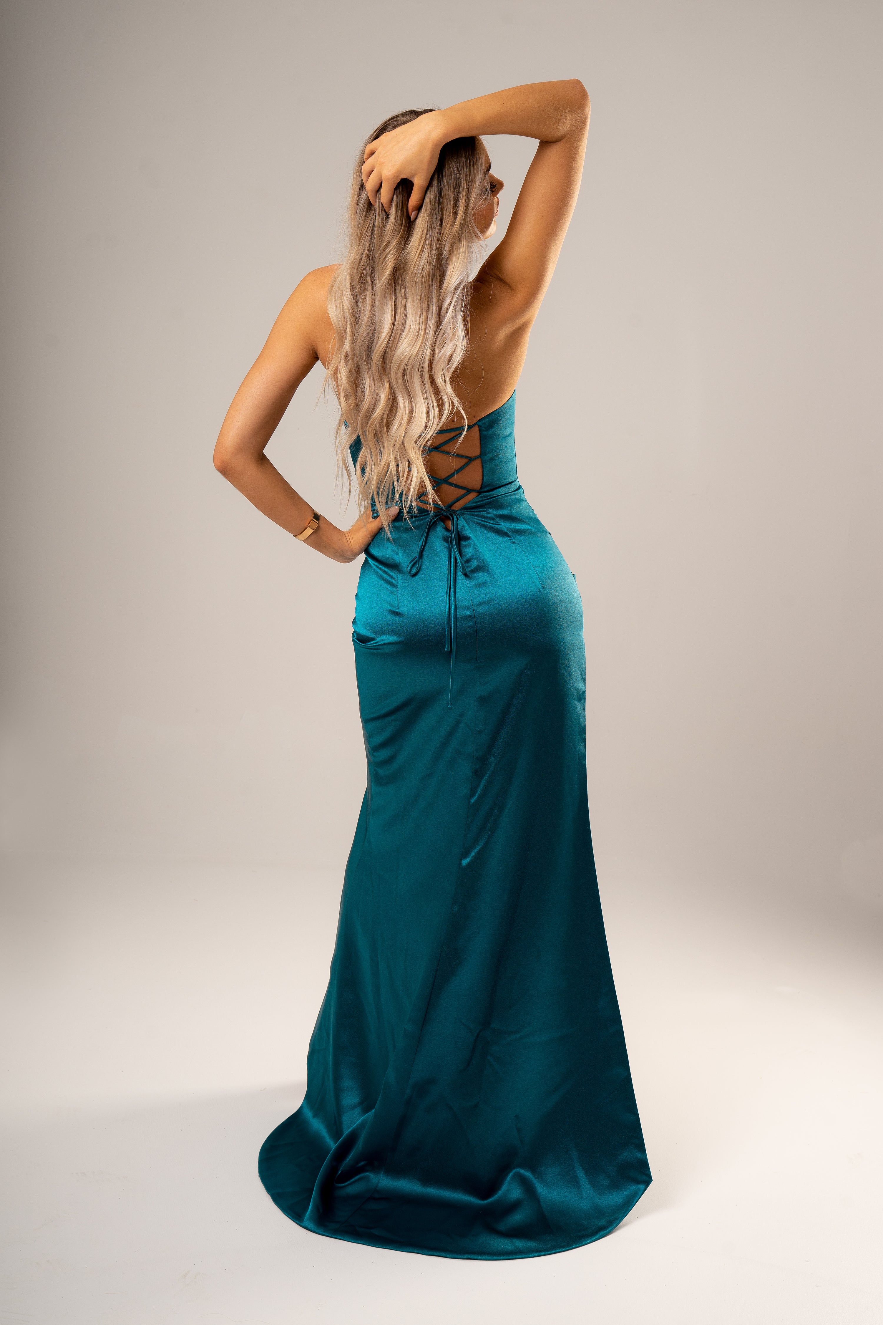Teal satin A symmetric pointy neckline mermaid with high slit.