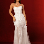 Full French Chantilly lace mermaid with long bodice corset semi see through for hire