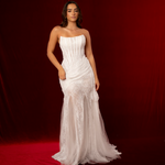 Designed to contour the body, the bodice flows seamlessly into a mermaid-style skirt with a gentle flare, enhancing natural curves while allowing effortless movement. Crafted from a lightweight, slightly textured fabric, Aster feels as exquisite as it looks—comfortable yet undeniably luxurious.