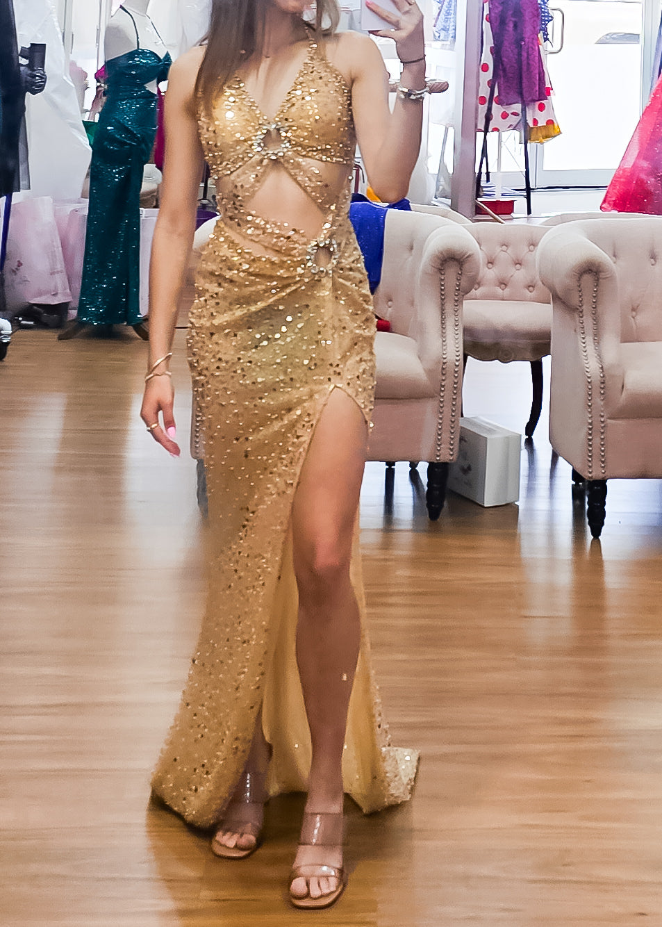 Beaded nude gold cutout dress with lace up back for hire