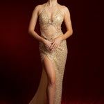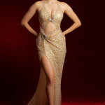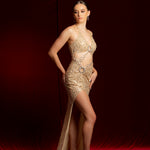 The perfect formal dress for the most extravagant individual, this luxurious gold beaded lace dress features a high slit, ruching, and a built-in corset for a flawless fit. Adorned with hundreds of hand-beaded crystals and beads, this dress is a true work of art. Boning throughout the top and padded breast cups provide exceptional support, allowing the wearer to confidently forego a bra. Lined with nude cotton, this seemingly sheer dress ensures complete coverage and safety.