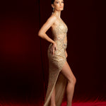 - Luxurious gold lace dress with beads and a high slit, featuring a built-in corset for a perfect fit.