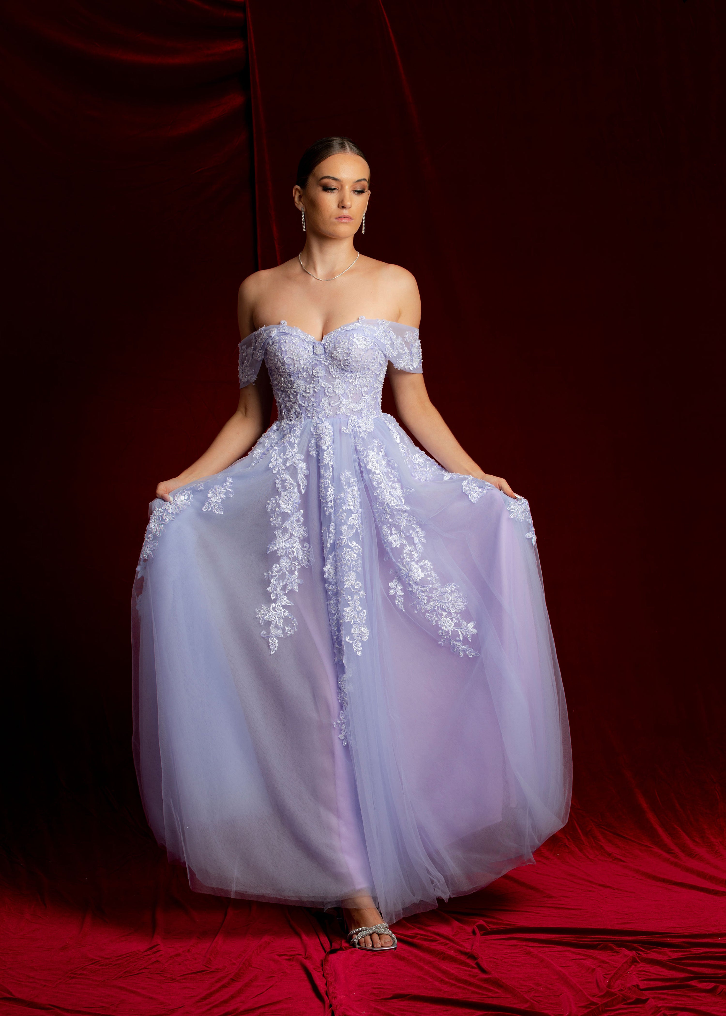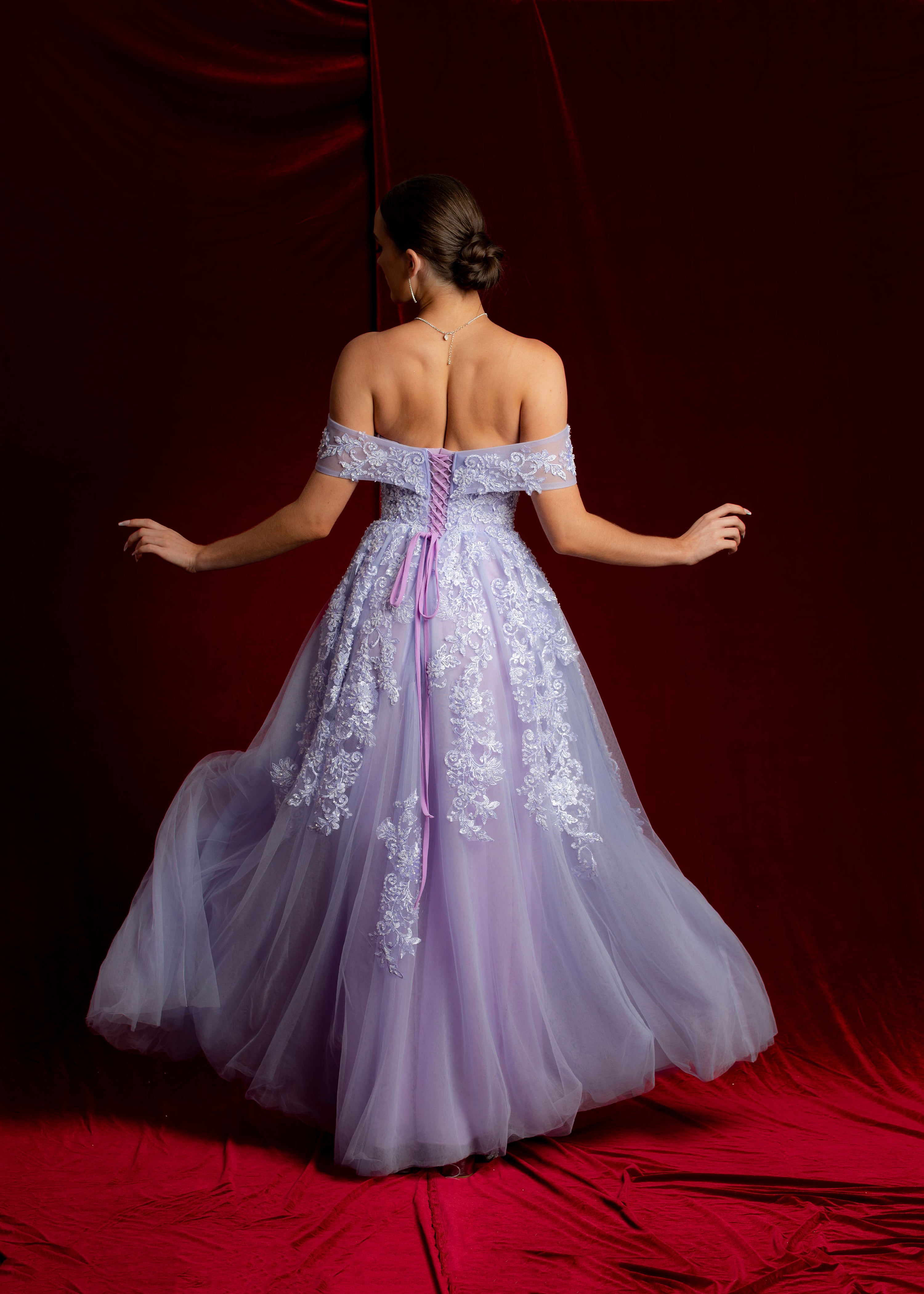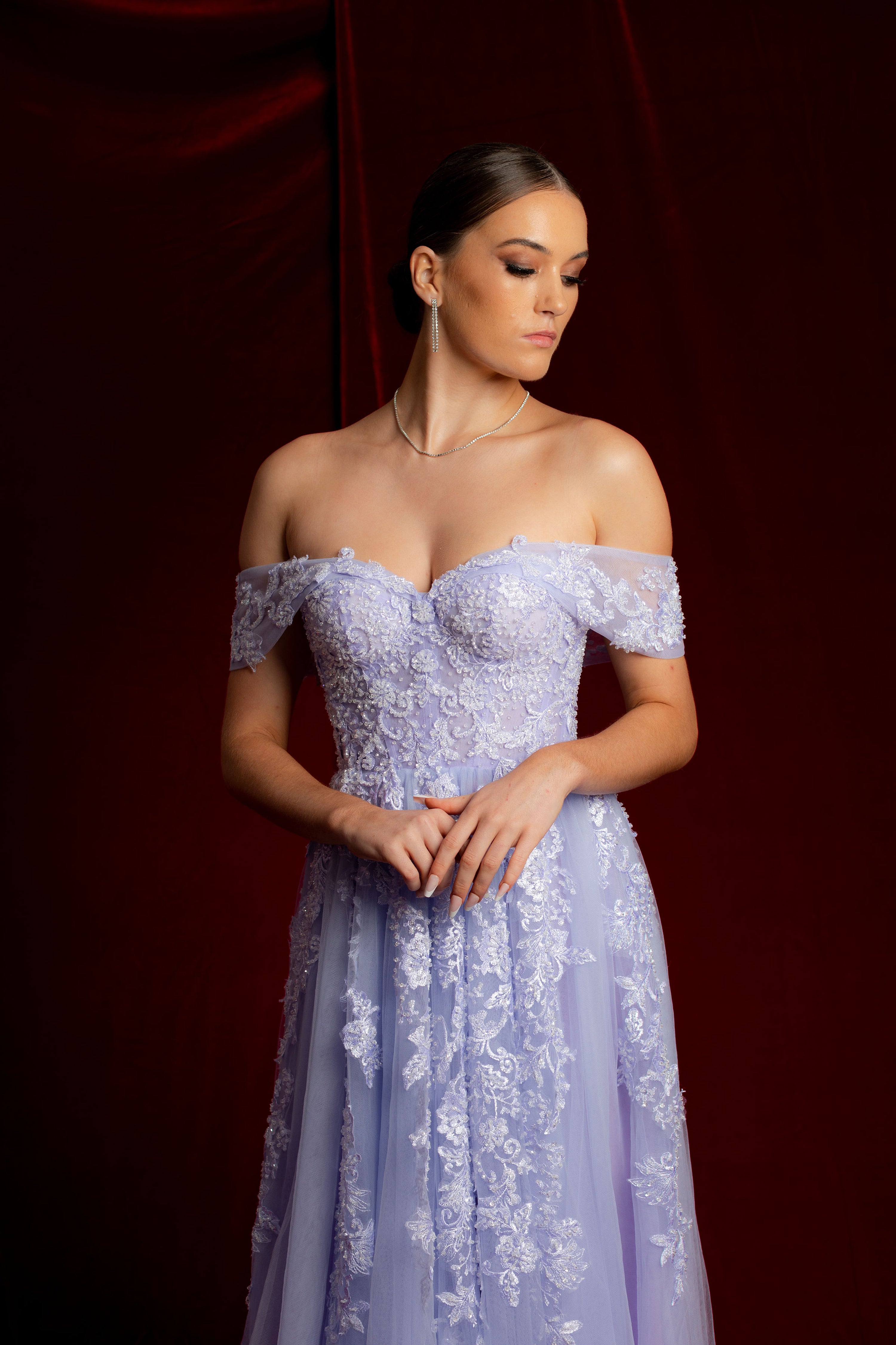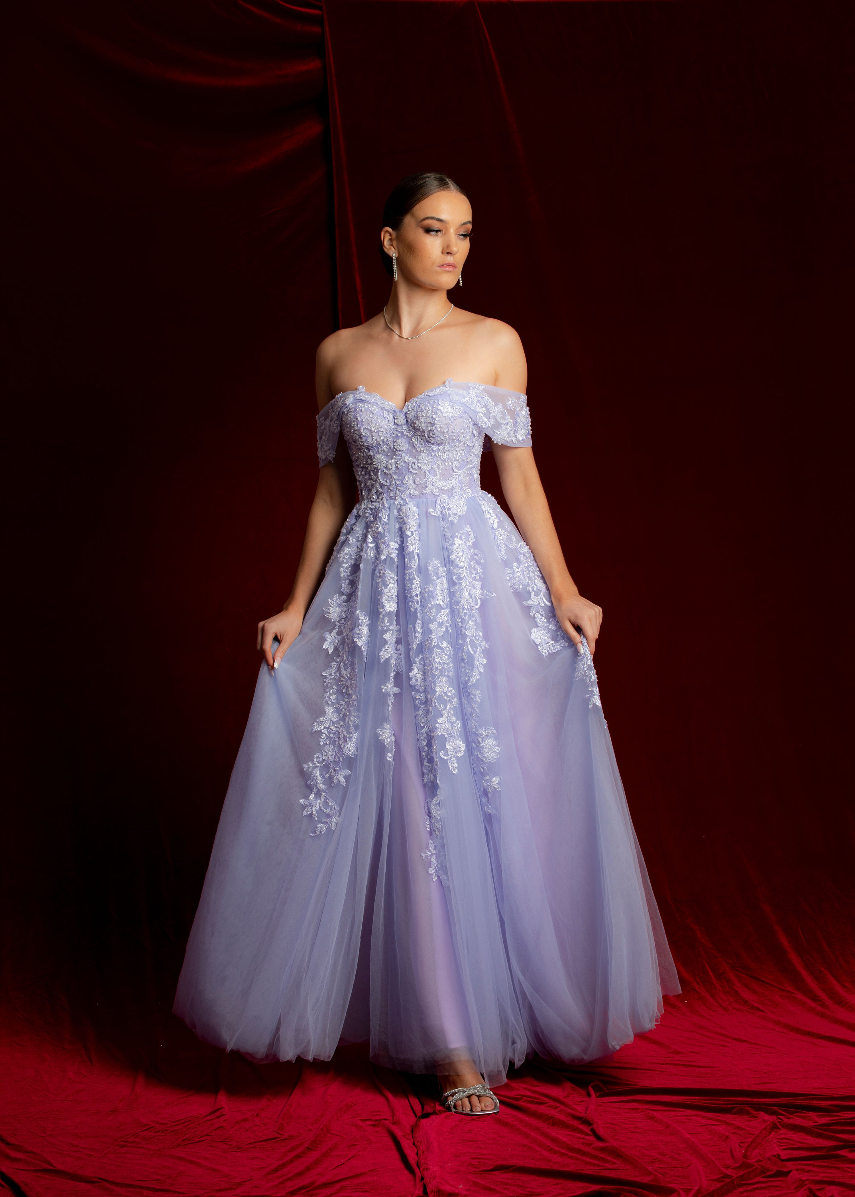 Elegance is elevated with **off-the-shoulder sleeves**, exuding timeless glamour and refined charm. The **bodice is adorned with hand-sewn crystals**, catching the light and adding a subtle, enchanting sparkle throughout the night.